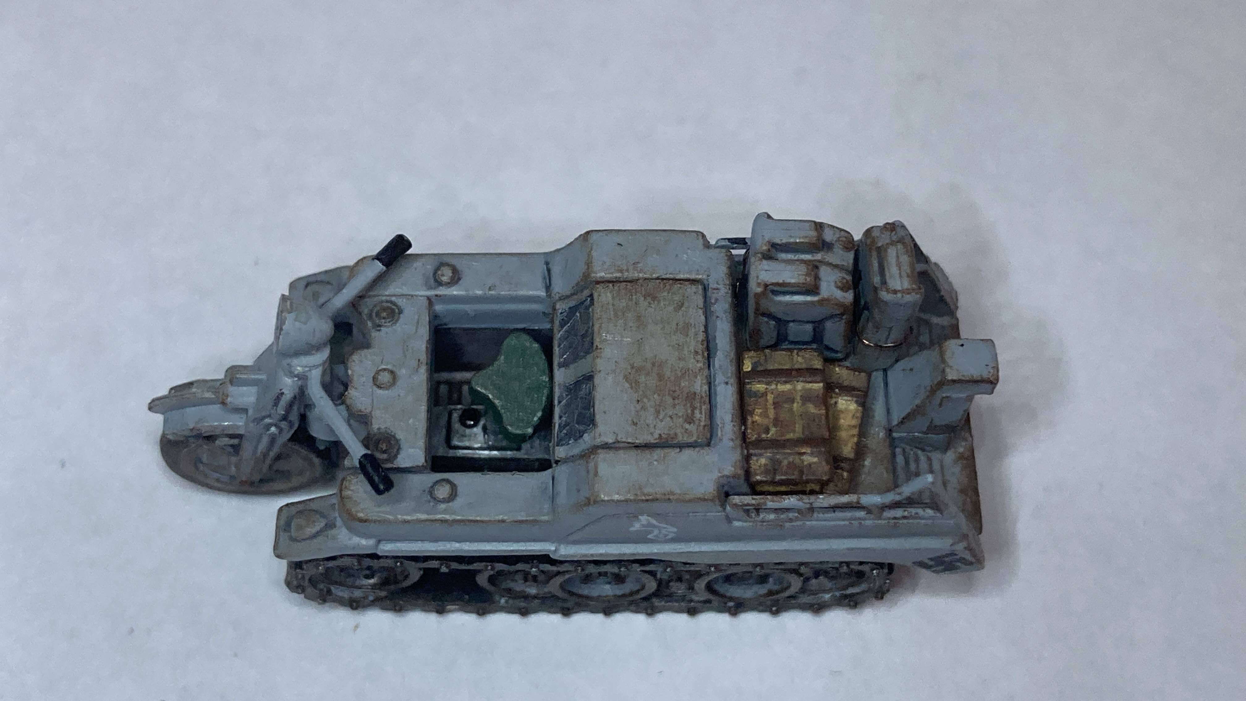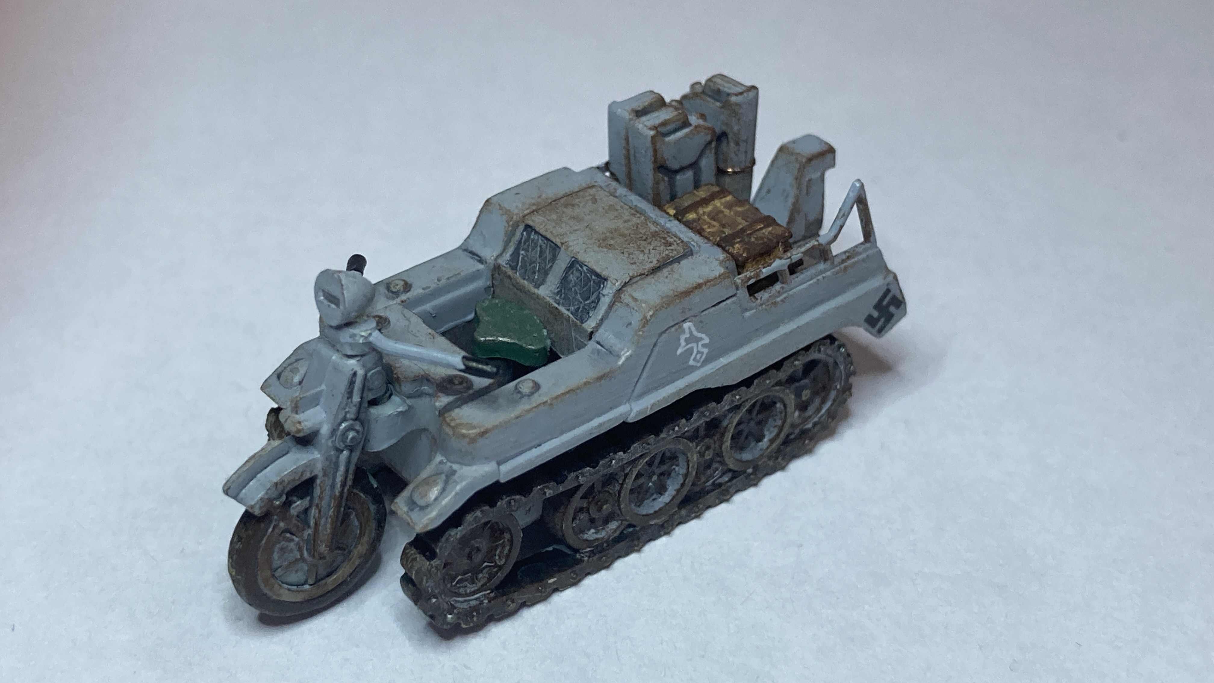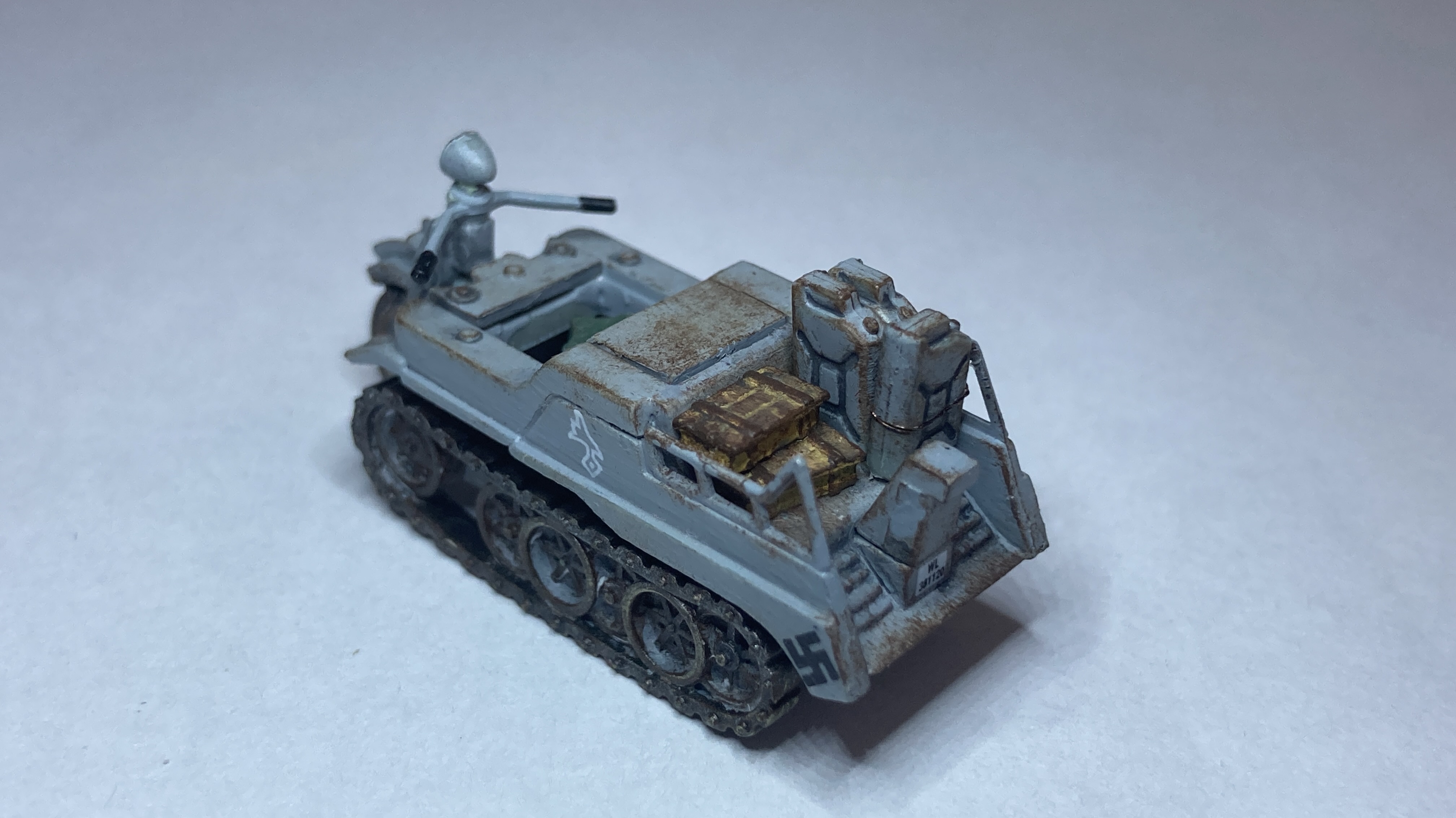 Academy 1:72 ölçek WW2 Kara Araçları setinden çıkan üç araçtan biri olan Kettenkrad kiti kolay, hızlı ve keyifli bir yapımla bitti. 2 gün boyunca küçük çalışmalarla yaptığım modele setten çıkan yakıt bidonları ve mühimmat sandıklarından bazılarını da ekledim. Renk olarak griyi kullandım ve hava şartlarına çok açık olan aracı orta-yüksek derecede kirlettim.