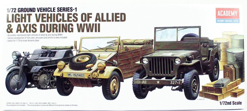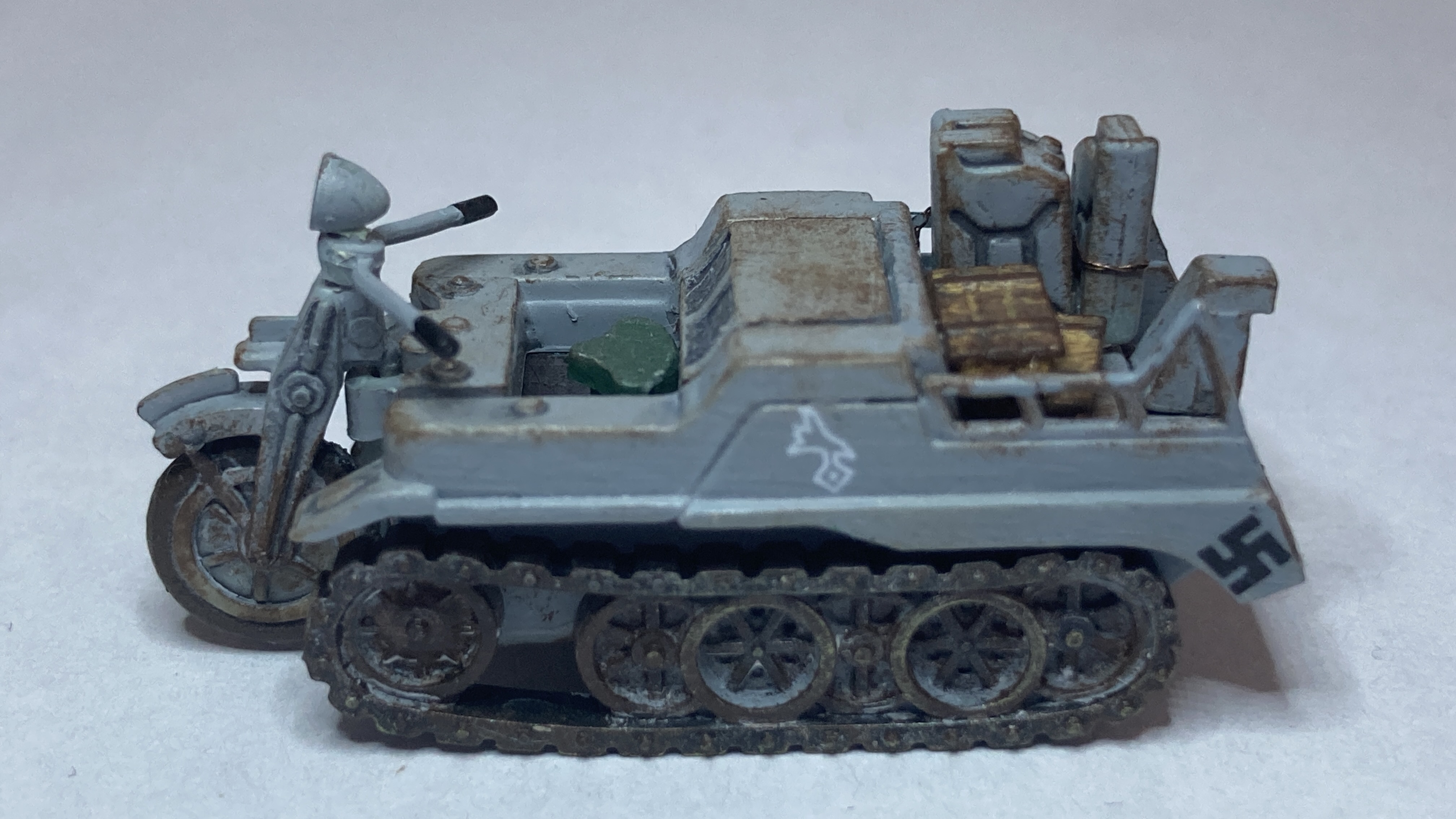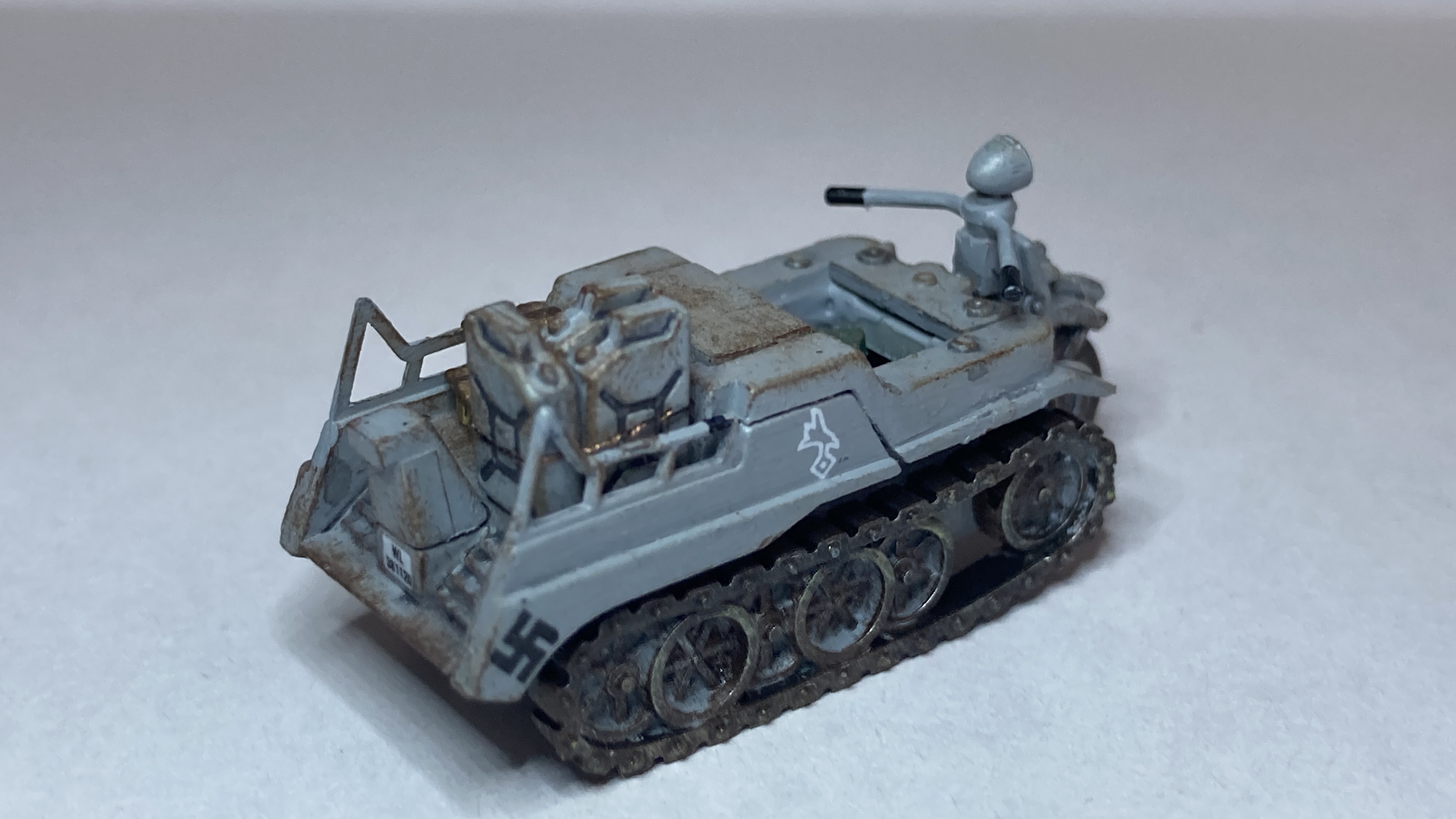 Academy 1:72 ölçek WW2 Kara Araçları setinden çıkan üç araçtan biri olan Kettenkrad kiti kolay, hızlı ve keyifli bir yapımla bitti. 2 gün boyunca küçük çalışmalarla yaptığım modele setten çıkan yakıt bidonları ve mühimmat sandıklarından bazılarını da ekledim. Renk olarak griyi kullandım ve hava şartlarına çok açık olan aracı orta-yüksek derecede kirlettim.