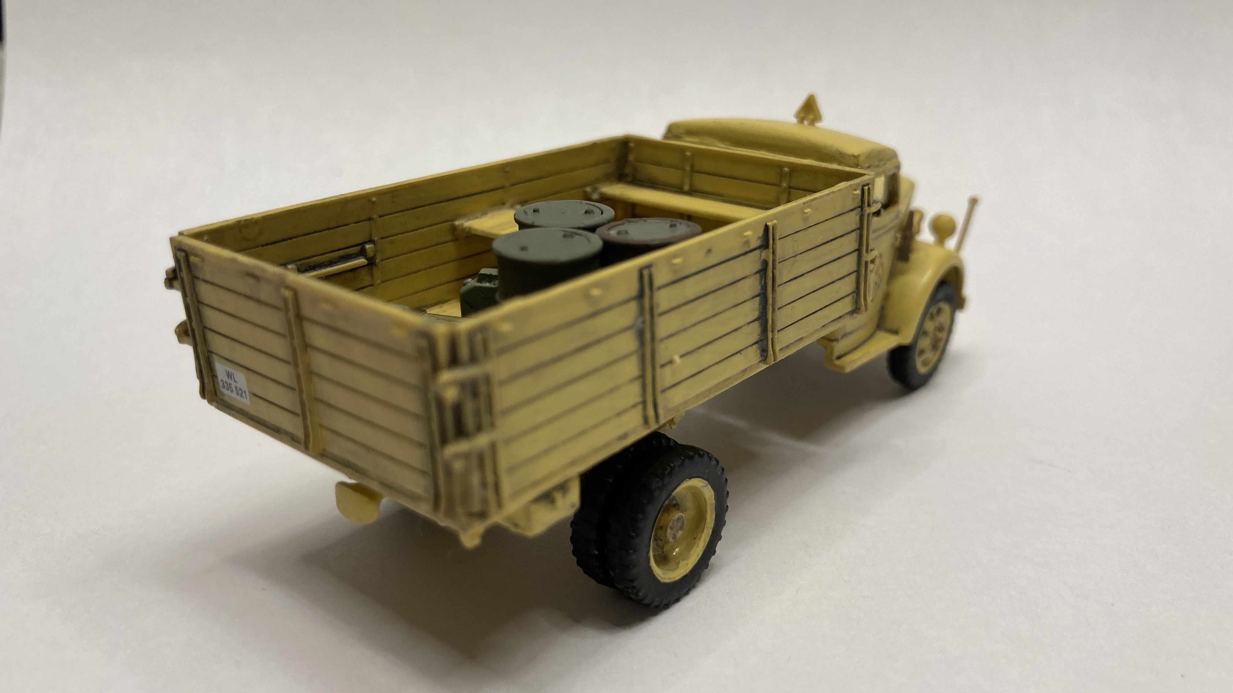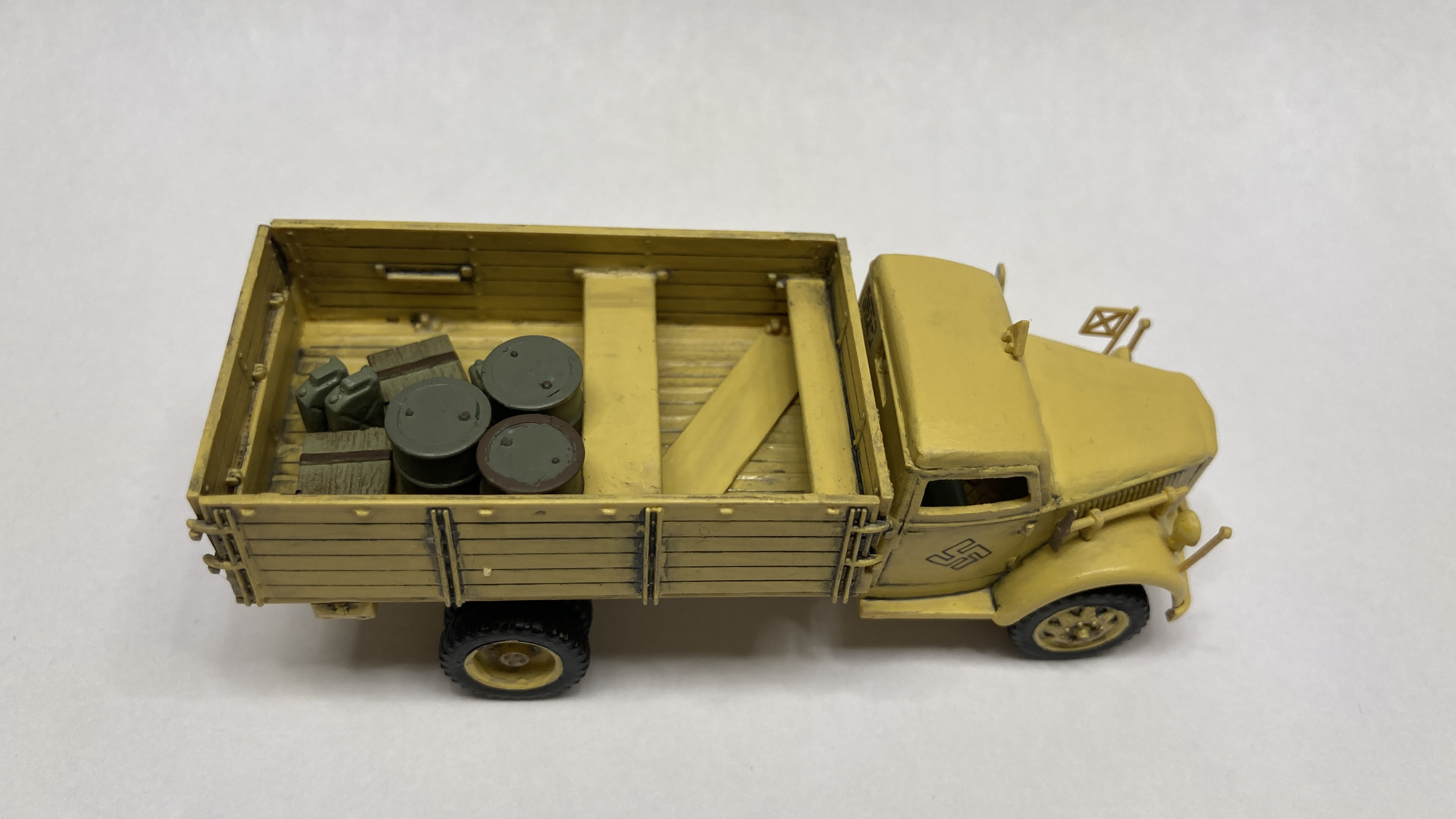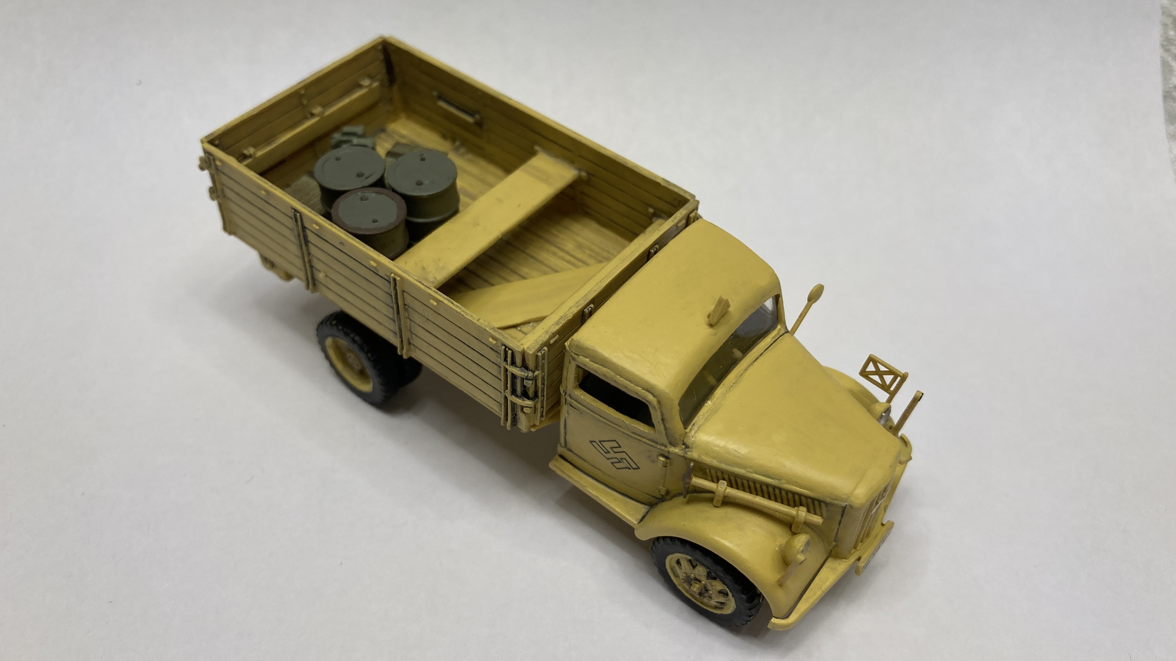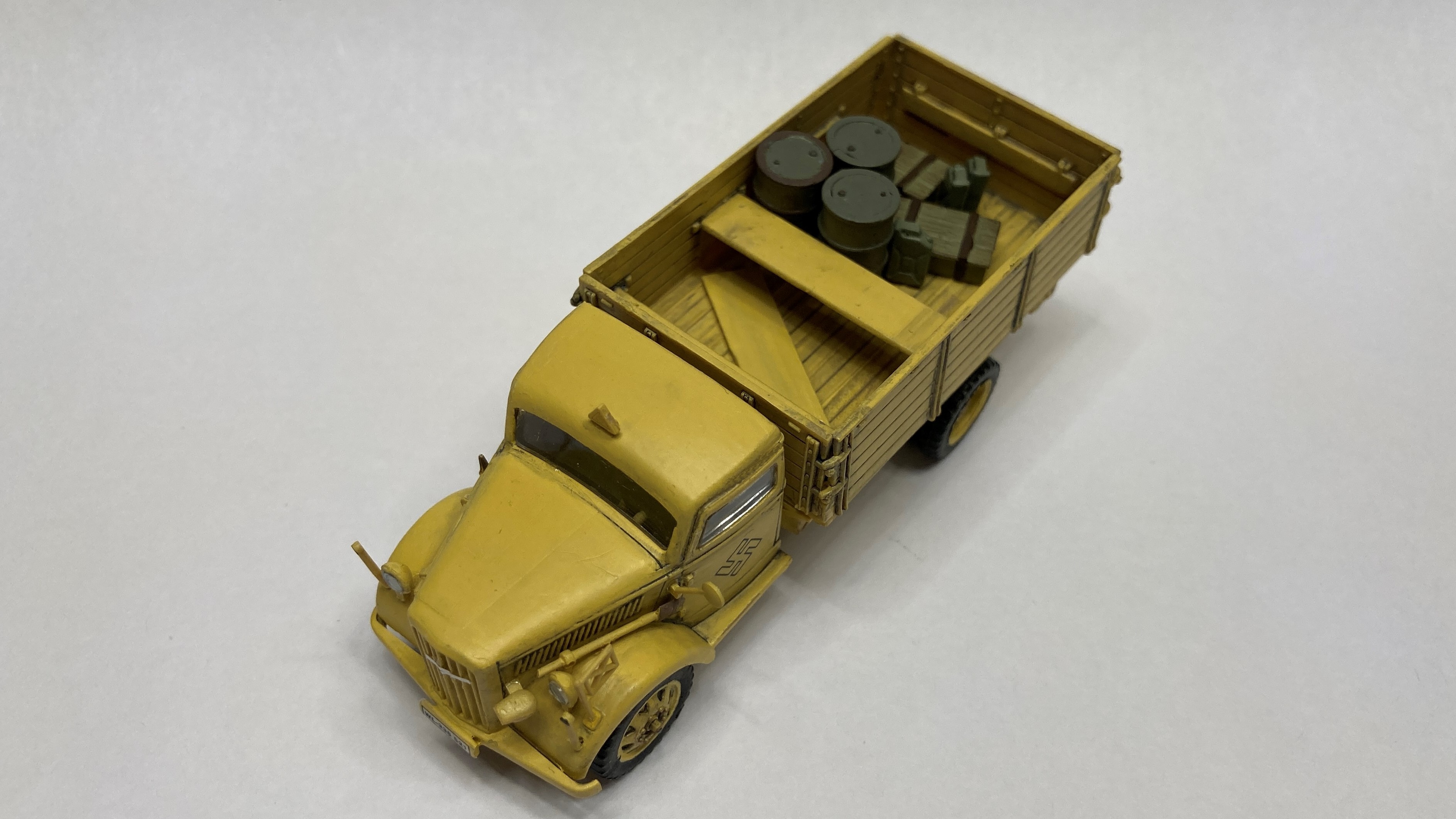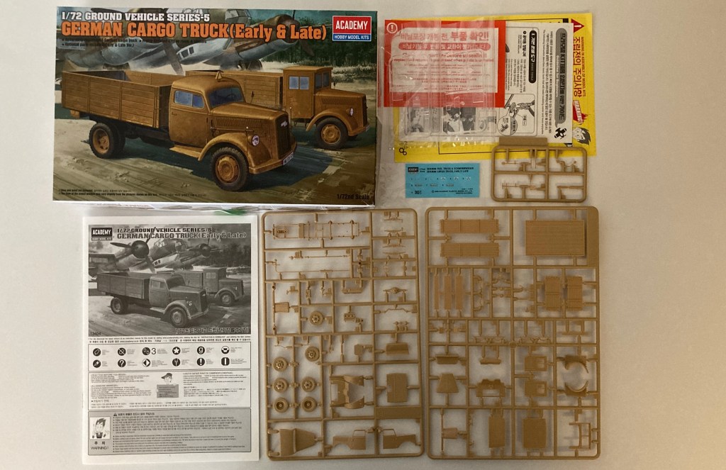 Academy’nin 1/72 kara araçları setlerinden 5’incisi olan sette II. Dünya Savaşı Alman kargo kamyonlarından Opel Blitz’in eski ya da yeni versiyonlarından birini yapma seçeneği sunuluyor. Kutu kapağındaki resim sizi aldatmasın. 13’ü şeffaf 94 parçadan oluşan sette şase, kasa ve tekerlekleri yaptıktan sonra iki kabin seçeneğinden sadece birisini yaparak modeli tamamlayabilirsiniz. Yani kitten iki kabin ve bir şase/kasa çıkmakta. Ben erken dönem kabini kullanmayı tercih ettim. Renk olarak Afrika kolordusuna uygun şekilde çöl sarısı ile boyadığım modelin kasa kısmına da Academy’nin aynı serisinin 1 no’lu kitinden kalan varil, sandık ve gaz tenekelerini yerleştirdim. Tamamen akriliklerle boyadığım sette enamel panel liner ile kirletme ve kahverengi akriliklerle kuru fırçalama yaptım. Setteki decallere ek olarak kapılarda ve ön ızgaradaki Opel logosunda el yapımı decaller kullandım.