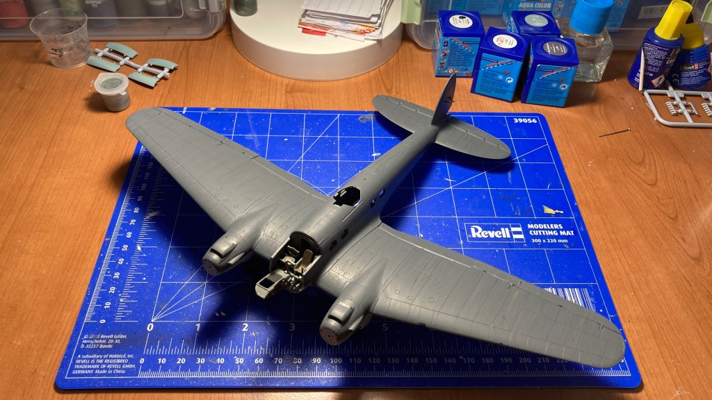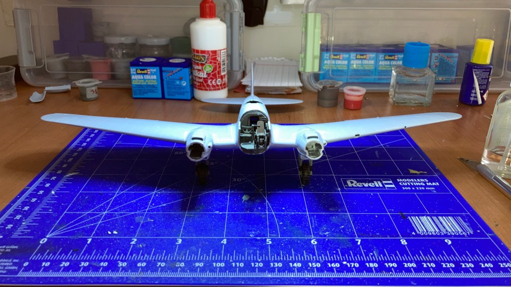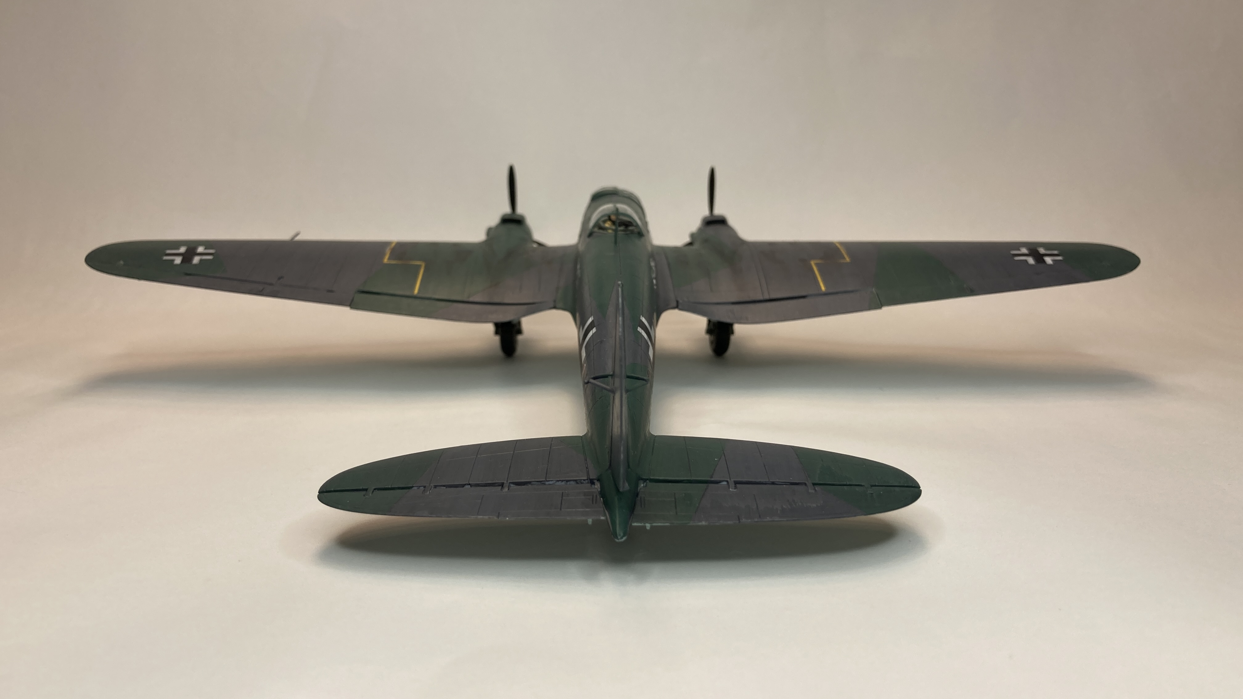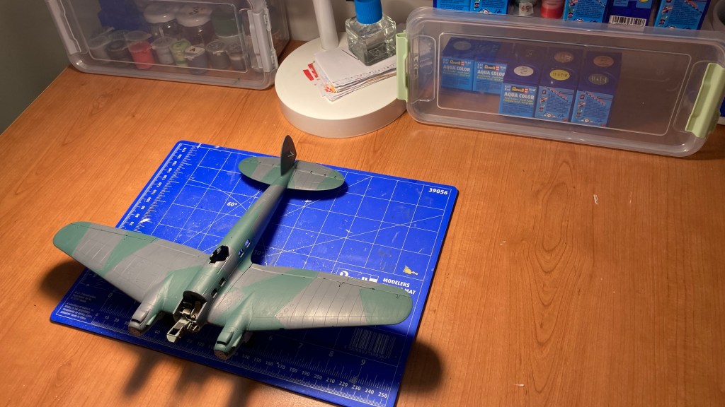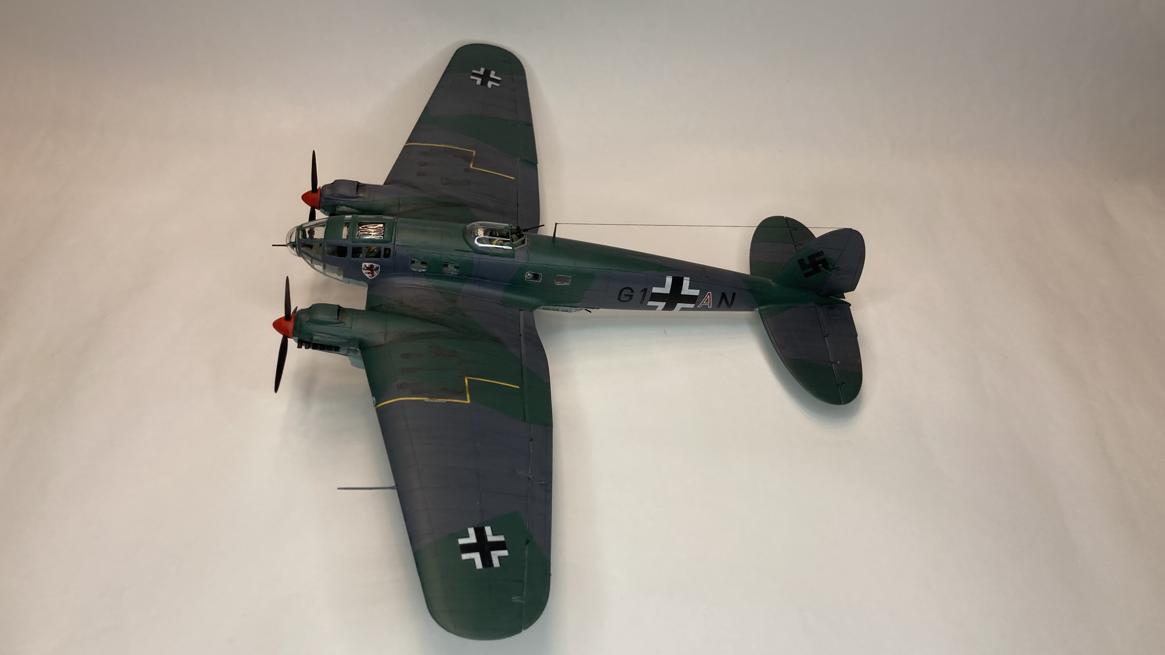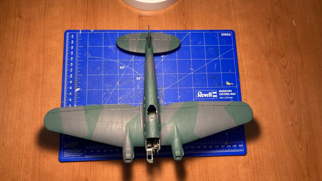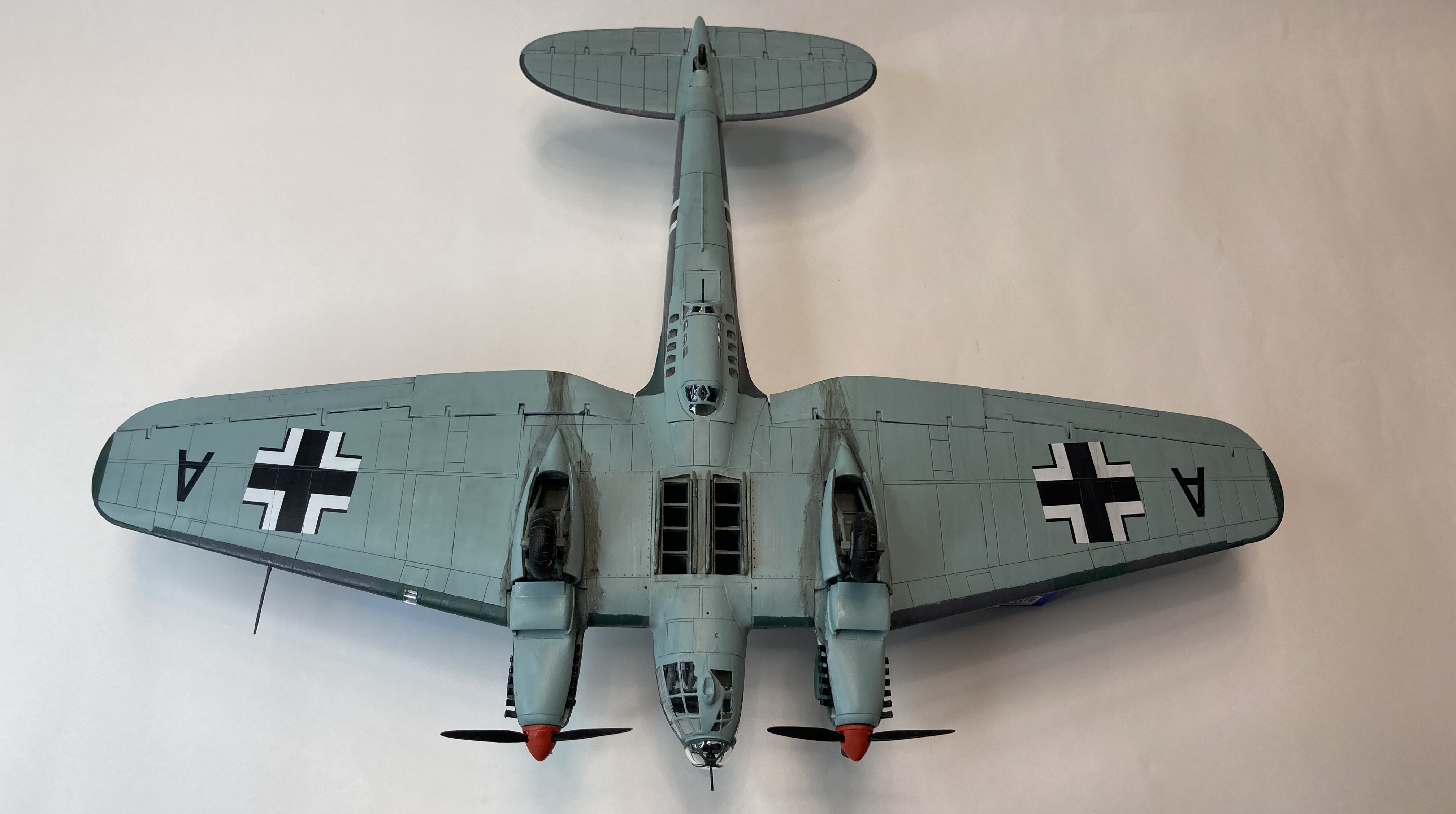 Standart olarak kokpitle başlayıp, zemin, gövde içi ve koltukları boyadım, telsiz ve bomba bölmelerini hazırlayıp boyasını yaptım. Gövde ve kanatları birleştirip, kontrol yüzeylerini düz şekilde ekledim. Kanatların gövde ve motor birleşimlerinde bir miktar putty ve zımpara işlemi gerekli oldu. Gövde altını Revell 49 açık mavi, gövde üstünü 48 deniz yeşili (biliyorum bu renk değil ama bu sefer böyle oldu 😊) ve 74 Gunship Gray ile boyadım. Kabinler, iniş takımları ve yuvaları, bomba yuvaları Humbrol 31 Slate Gray; pervane konileri Revell 36 Carmine Red; pervane kanatları Vallejo 70.950 Siyah ile boyandı. Revell parlak ve mat vernikleri ile tamamladığım modeli Tamiya dark gray panelliner ile kirlettim. Anten kablosunu naylon çoraptan kestiğim esnek ip ile yaparak modeli tamamladım.