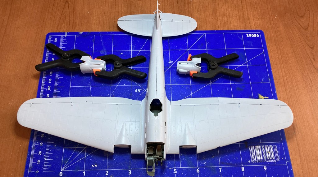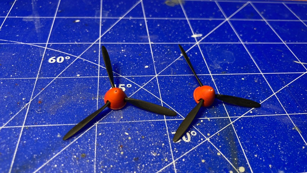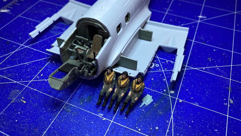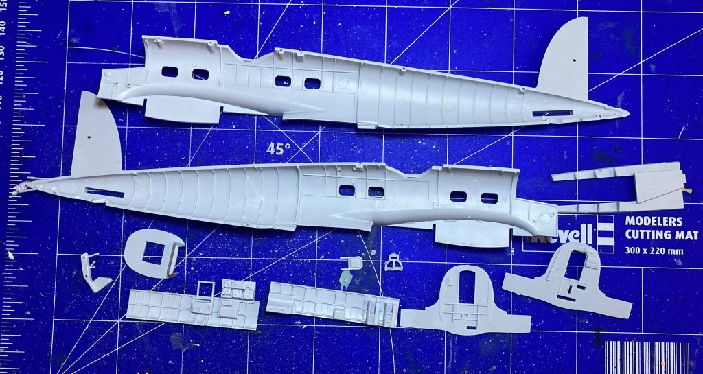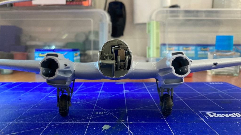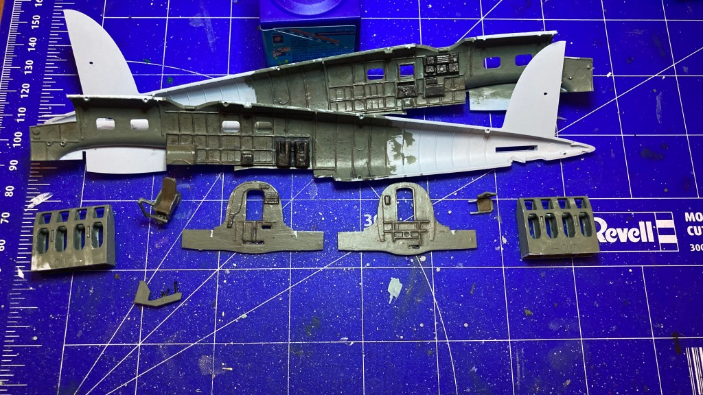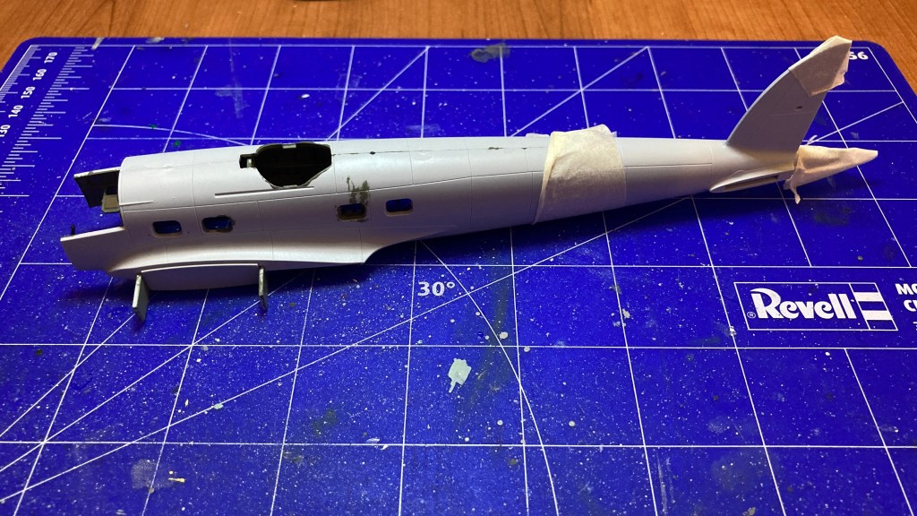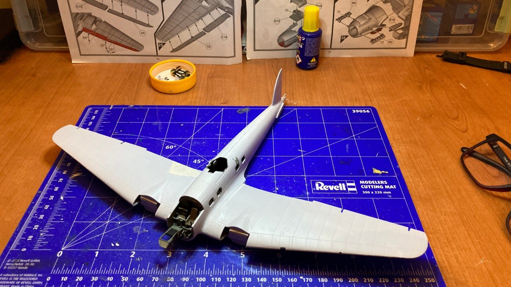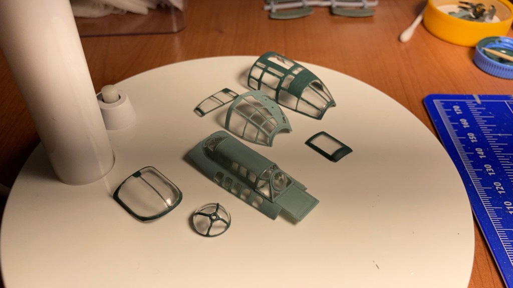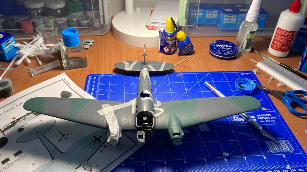 Standart olarak kokpitle başlayıp, zemin, gövde içi ve koltukları boyadım, telsiz ve bomba bölmelerini hazırlayıp boyasını yaptım. Gövde ve kanatları birleştirip, kontrol yüzeylerini düz şekilde ekledim. Kanatların gövde ve motor birleşimlerinde bir miktar putty ve zımpara işlemi gerekli oldu. Gövde altını Revell 49 açık mavi, gövde üstünü 48 deniz yeşili (biliyorum bu renk değil ama bu sefer böyle oldu 😊) ve 74 Gunship Gray ile boyadım. Kabinler, iniş takımları ve yuvaları, bomba yuvaları Humbrol 31 Slate Gray; pervane konileri Revell 36 Carmine Red; pervane kanatları Vallejo 70.950 Siyah ile boyandı. Revell parlak ve mat vernikleri ile tamamladığım modeli Tamiya dark gray panelliner ile kirlettim. Anten kablosunu naylon çoraptan kestiğim esnek ip ile yaparak modeli tamamladım.