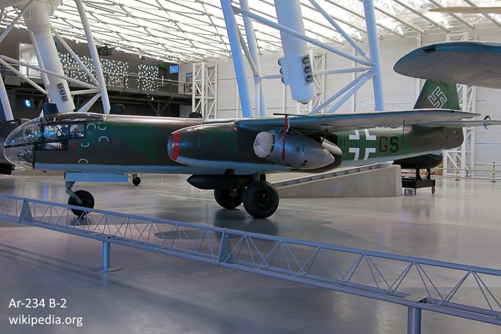 Alman uçak üreticisi Arado tarafından tasarlanıp üretilen Dünya’nın ilk jet motorlu bombardıman uçağıdır. II. Dünya Savaşı’nın son dönemlerinde jet motoru ile diğer önemli malzemelerin azlığından dolayı 1944-1945 arasında farklı varyantlarda 214 adet (210 adeti B varyantıdır) üretilebilmiştir. Bombardıman rolü yanında keşif/istihbarat; erken uyarı/avcı yönlendirme; gece savaşçısı, torpido uçağı; Mistel (mini avcı taşıyıcı/ana uçak) gibi roller alması planlanmış ancak çoğu iptal edilmiştir. C varyantı önceki varyantlara göre 4 motoru olması ile dikkat çekmektedir. Bugüne yalnızca bir adet B-2 modeli Ar-234 ulaşabilmiştir. Benim de modelini yaptığım C-3 varyantı 4 adet BMW 003 turbo jet motoru ile 857 km/sa hıza ve 13bin m yüksekliğe ulaşabiliyordu. 1 pilot tarafından uçurulan uçak gövde ve motor bloklarının altında toplam 3 adet silah istasyonunda 3 adet bomba ya da 2 bomba ve 1 adet torpido taşımaktaydı. Uçağın burun kısmında da 2 x 20 mm MG 151 makineli top bulunmaktaydı. C varyantından 14 adet gövde üretilmiş ancak yarıdan azına motor takılabilmiş, uçuş testleri başlayamadan Almanya teslim olmuştur.