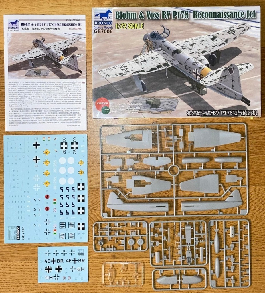Çinli firmanın 2015 kalıbından 2016’da piyasaya sürdüğü P.178 serisinin keşif modeli. 2015-2016’da piyasaya sürülen bombacı, torpidocu, tank avcısı, gece avcısı, önleyici gibi farklı P.178’ler de mevcut. İçe detay, değişik tasarımıyla yapımı keyifli ve özellikle birleşim konusunda başarılı bir kit. Kanopi, kamera bölmesi ve iniş takımları için açık/kapalı şekilde ayrı parçalar verilmiş. Keşif modeli olduğu için iki adet RB50/30 hava kamera seti ve ayrıca ETC50 bağlantı noktasına bağlı bir adet 600 litre yakıt tankı da bulunmakta. Kokpit ve iniş takımları yeterli detaya sahip. Yapım kılavuzu güzel ve yeterli. Decal baskısı orta kalitede ancak decallerin uygulanması sorunsuz. Tüm kitler için ortak, büyük bir decal seti ile bu kite özgü küçük bir kâğıt gelmekte. İki uçak için decal seçenekleri mevcut. Uçak gerçekte üretilmediği için yapım sırasında hayal gücünüzü serbest bırakabilirsiniz. Ben kılavuzda ikinci seçenek olan beyaz/açık mavi kamuflaj desenini tercih ederek kutu üzerinde yer alan uçağa benzetmeye çalıştım. Yani karlı bir ortamda görev yapan, aslında yeşil ama sahada beyaza boyanmış, hava şartlarından dolayı beyaz boyanın yer yer attığı ve alttaki yeşili gösterdiği bir tasarım. Bunun için, yeşil üzerine uyguladığım beyazı 600-1000 numara sulu zımpara ile hafifçe çıkarttım. Kılavuzda burna 10 gr. ağırlık istenmiş ancak yeterli yer yok, kokpit arkasına daha fazla ağırlık koyulabilir ancak iniş takımlarına güvenemedim. Bu nedenle kuyruğa oturan uçağı setten çıkan şeffaf kuyruk desteği ile destekledim.
