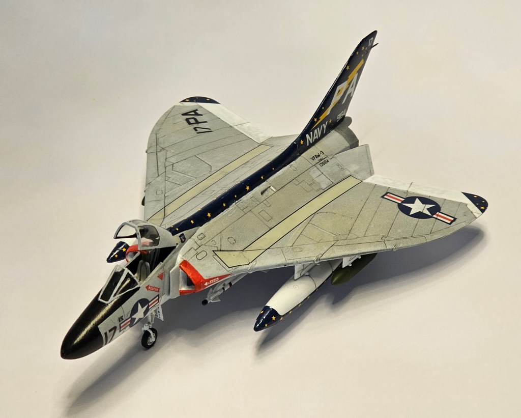 Tamiya’nın 1998’de ürettiği yeni kalıbıyla piyasaya sürdüğü bir kit. Detaylar ince ve girintili. Bileşenler neredeyse mükemmel bir şekilde uyuyor ve montaj sırasında dolgu macunu gerekmiyor. Montaj talimatları gayet açık ve net. Kokpit son derece detaylı üretilmiş ve gerekli tüm mühimmat mevcut olduğundan ek detay seti satın almaya gerek duyulmuyor. Kaliteli decaller ile 3 farklı uçaktan birini seçme şansı sunuluyor. Ben NAVY seçeneğini tercih ettim. Cam parçaların şeffaflığı iyi ve birbirine kolayca uyum sağlıyor. Yapıma kokpiti toplayarak başladım. Kitte verilmeyen emniyet kemerlerini kendim basıp koltuğa ekledim. Burun içine 5 gr ağırlık olarak sakız yapıştırıcı, çivi ve vidalar ekledim. Gövde üstünde Vallejo siyah ve beyaz akriliklerin karışımıyla elde ettiğim gri tonunu fırçayla uyguladım. Mr. Hobby sprey boyalarla kırık beyaz-069 gövde ve kanat altlarını boyadım. Geri kalan detayları fırçayla tamamladım. Parlak vernik olarak Mr. Hobby, mat vernik olarak Edding sprey ürünlerini kullandım. Kirletme için Tamiya koyu gri panel liner ve suluboya kalemleri ile uygulamalar yaptım. Yük olarak kitten çıkan 2 Sidewinder, 2 yakıt tankı, 2 roket podu ve 1 Navpac podu kullandım. Kuyruk, omurga, hava alıkları ve yakıt tankları için decal uygulamalarının zorluğu dışında genel olarak keyifli bir model yapımı oldu. Tüm seviyedeki modelcilere tavsiye ediyorum.