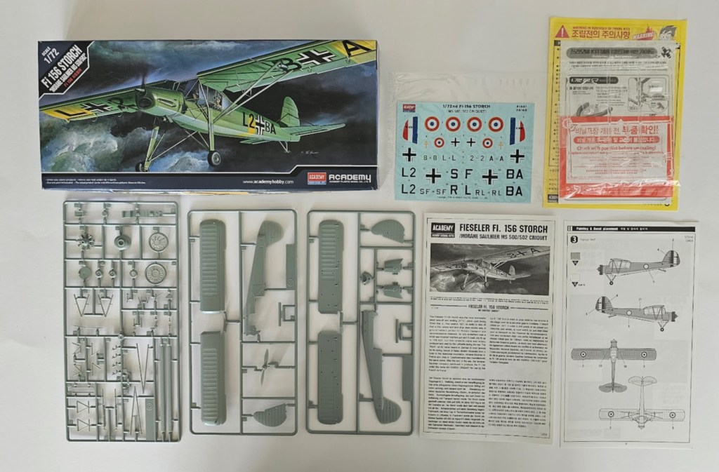 Academy’nin 1998’de yeni kalıpla çıkardığı kitin 2010’de tekrar piyasaya sürülmüş bir örneğidir. 2 farklı Alman Fieseler Fi-156 uçağı veya 1 Fransız üretimi Morane-Saulnier MS 502 Criquet uçağından birini yapma seçeneği veren decallerle sunulmakta. MS-502 yapımı seçilirse uçağın burun ve motor kısmı için kitteki farklı parçaların kullanılması gerekiyor. Piyasadaki en iyi 1/72 Storch olan bu kit, açık gri plastikten kalıplanmış ve girintili panel çizgileri ve güzel yapılmış kumaş bölümlerine sahip. Kokpit camı beş parçadan oluşmakta. Yapıma kokpitle başlayıp pilot koltuğuna emniyet kemerleri ekledim ve hızlıca tamamladım. Gövde ve kanat birleşimleri oldukça kolay ve düzgün. Yapım seçeneklerinden 1942’de doğu cephesinde görev yapan bir Fi-156’yı yapmaya karar verdim. Bu amaçla Revell Aqua Color kullanarak gövde altını ve iniş takımlarını açık mavi, gövde üstünü ise koyu yeşil ve grimsi-yeşil tonlarını fırça kullanarak uyguladım. Sarı renkler için Polisan Akrilik Sprey Boya kullandım. Parlak ve mat vernik olarak Mr. Hobby spreylerini uyguladım. Kirletme için Tamiya koyu gri panel liner, anten kabloları için ince rafya ipi kullandım. Özellikle 5 parçalı kuş kafesi kanopinin montajı çok zorlayıcı oldu. Ayrıca kompleks anten kabloları da dikkat ve sabır gerektiriyor. Bu modeli ileri düzeydeki modelcilere tavsiye ediyorum.
