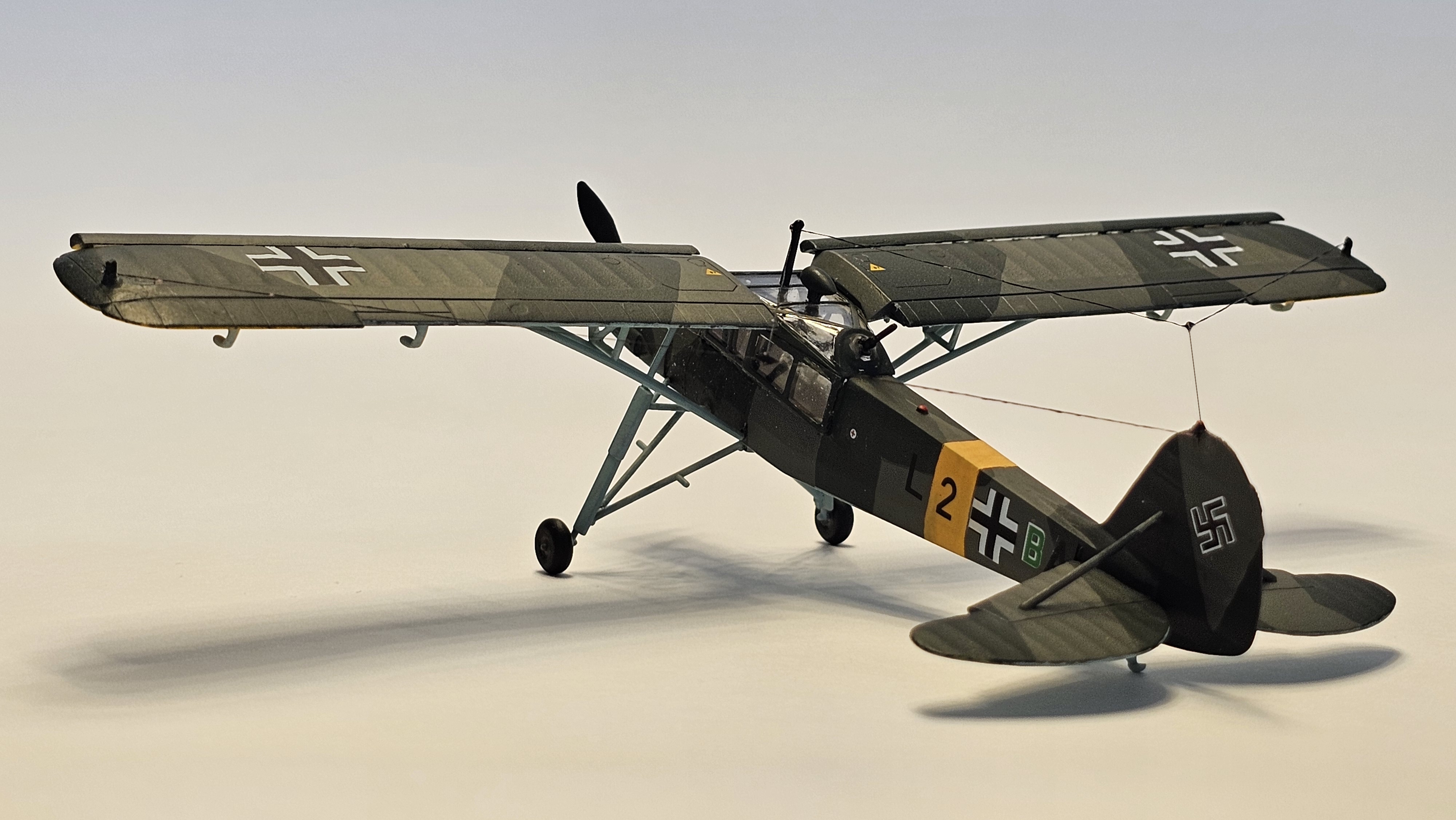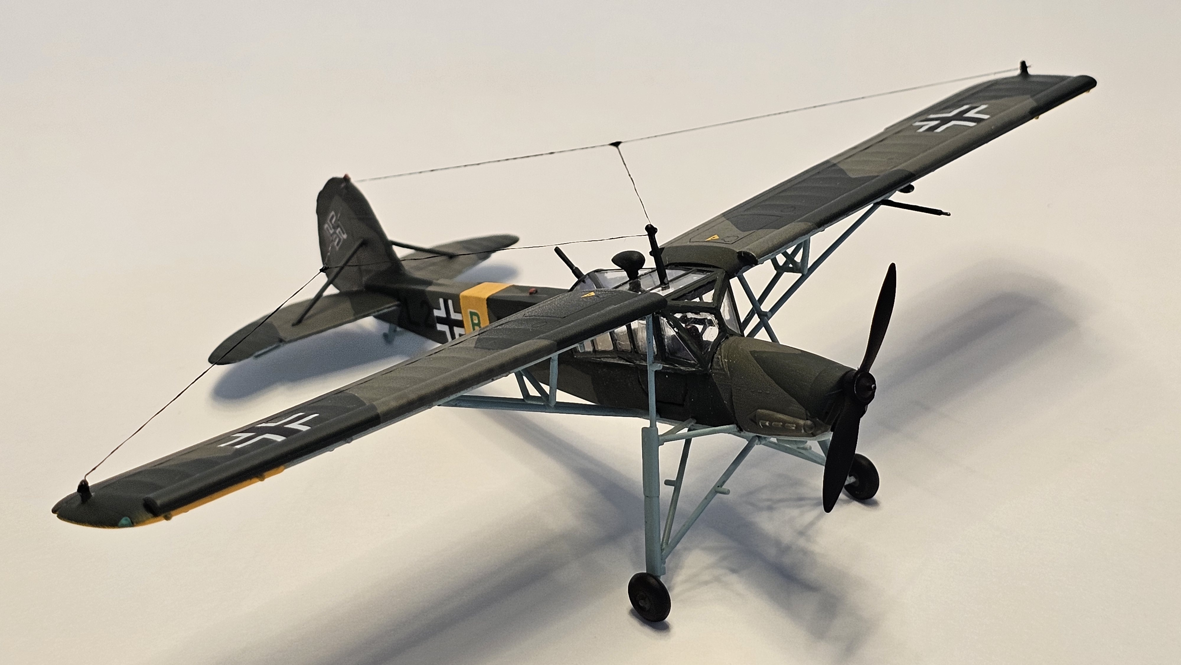 Alman Fieseler firması tarafından 1930’ların ortalarında Reichsluftfahrtministerium’un (RLM) talebi üzerine geliştirilen uçak, irtibat ve tıbbi tahliye rolleri için tasarlanmış uygun fiyatlı ve yapımı kolay bir uçaktı. Kısa kalkış ve iniş (STOL) performansı açısından çok başarılıydı. Storch takma adı aşağı sarkan ve uçağa uzun bacaklı, büyük kanatlı bir kuş görünümü veren iniş takımlarından gelmektedir. Alman ordusunca Doğu Cephesi, Batı Cephesi, Batı Çölü ve hatta Arktik’te bile kullanıma sokulan uçak, 1943’te devrik İtalyan diktatörü Benito Mussolini’nin Gran Sasso yakınlarındaki kayalık bir dağın tepesinden kurtarıldığı Eiche Operasyonu’nda önemli bir rol oynadı. Savaşın sona ermesinden sonra bile, uçağın üretimi 1950’lere kadar hem sivil hem de askeri amaçlarla diğer ülkelerde devam etti. Fransa, Çekoslovakya, Romanya ve Sovyetler Birliği’nde ek üretim hatları kurulmuştu. 1937’de hizmete giren uçaktan 2.900’den fazla üretilmiş, 1945’te Almanya’da; 1970’te Fransa’da hizmetten çıkmıştır. Benim de modelini yaptığım tamamen camlı arka sırt top pozisyonuna sahip iki kişilik gözlem tipi Fi 156 C-2; 240 bg güç üreten Argus As 10 V-8 ters hava soğutmalı pistonlu motoru ile 175 km/sa hıza ve 4.600 m irtifaya ulaşabilmekteydi. Arka koltukta MG 15 makineli tüfeği monte edilebilmekteydi.