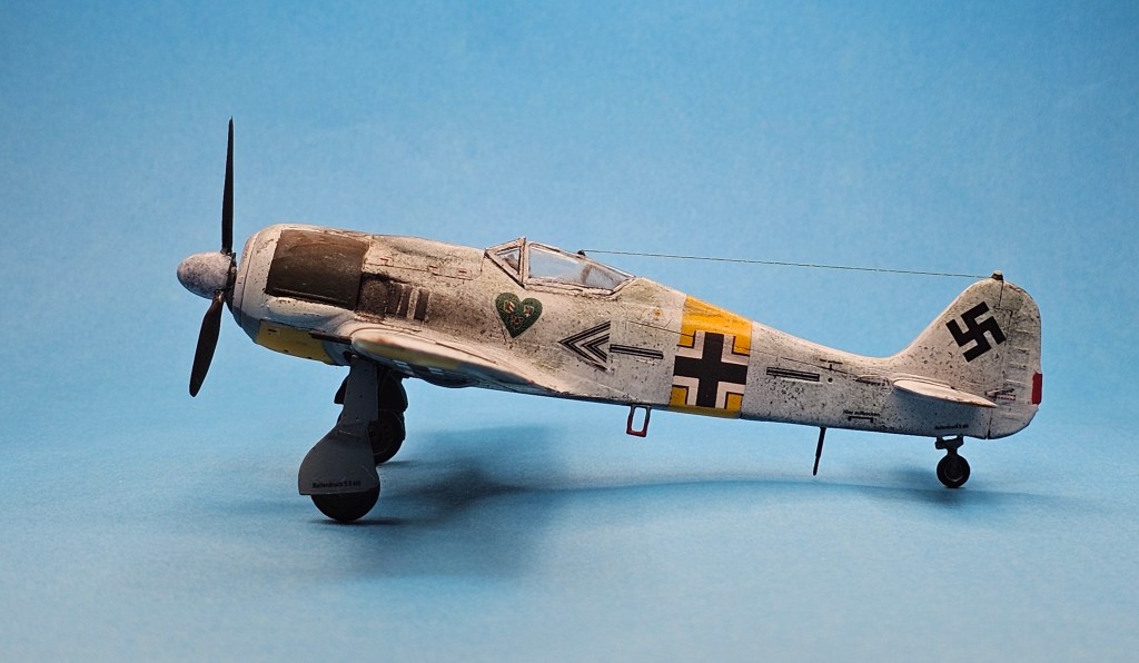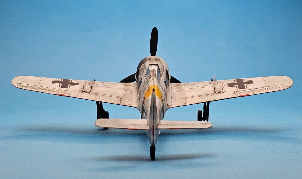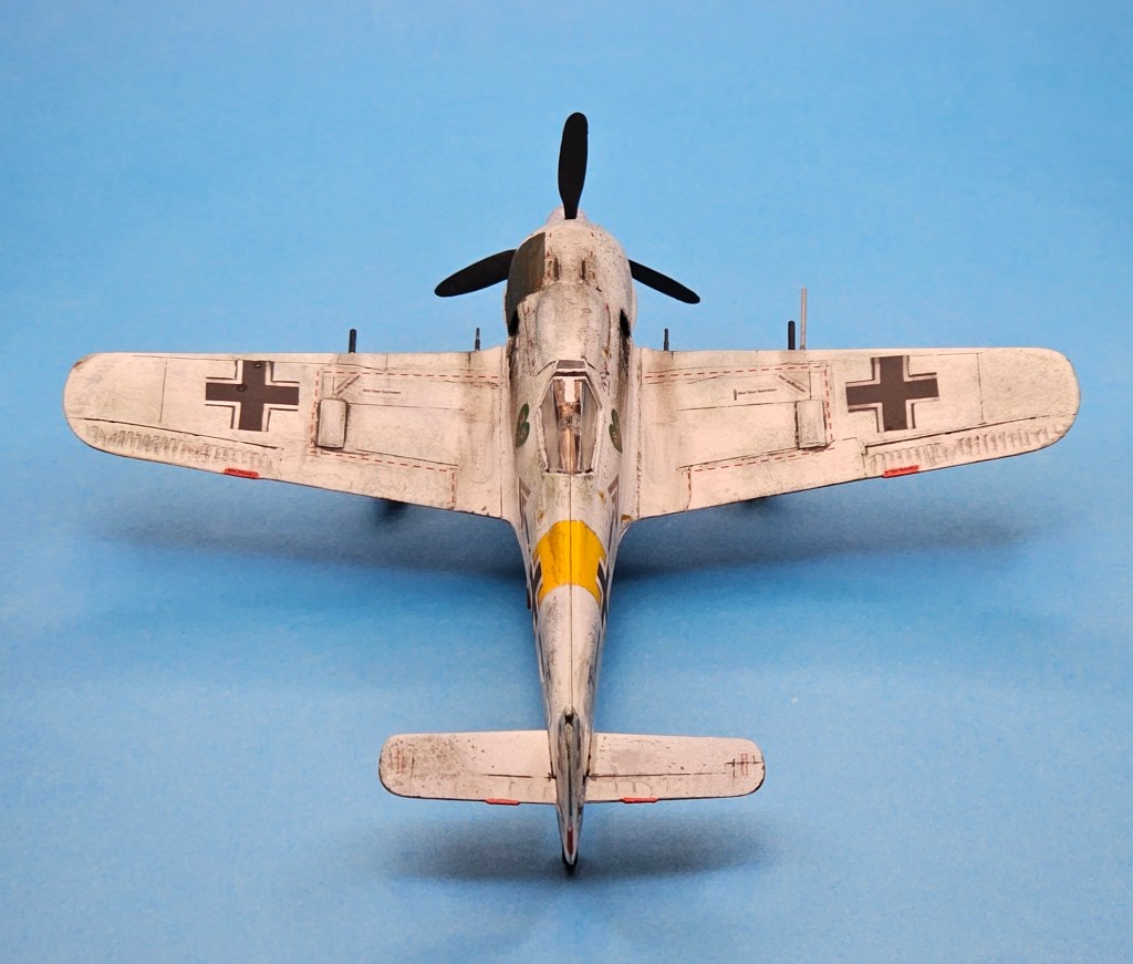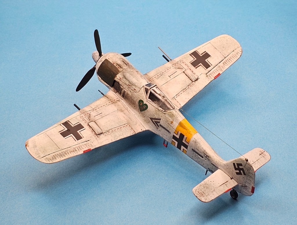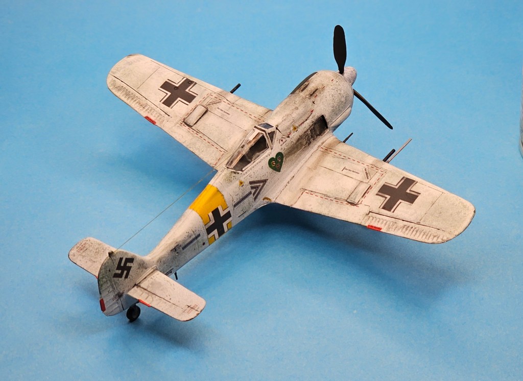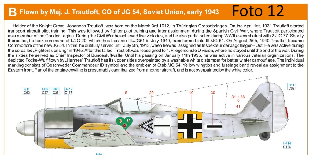 Renovasyon sırasında modellediğim uçak 1943 yılı başlarında Sovyetler Birliği’nde, JG 54 Komutanı Binbaşı J. Trautloft tarafından uçurulan uçaktır. Trautloft’un kullandığı uçağın üst yüzeyleri, kış kamuflajı sağlamak amacıyla beyaz boya ile kaplanmıştır. Uçaktaki kişisel işaretlemeler, Geschwader Komutanı kimlik sembolü ve Stab./JG 54’ün ambleminden (Grünherz-Yeşil kalp) oluşmaktadır. Sarı kanat uçları ve gövde bandı, uçağın Doğu Cephesi’nde görev yaptığını göstermektedir. Motor kaportasının bir bölümü muhtemelen başka bir uçaktan alınmış olup beyaz boya ile kaplanmamıştır. Trauflot altmışlı yıllarda Bundesluftwaffe Başmüfettişi olarak görev yaptı. 11 Ocak 1995’teki vefatına kadar çeşitli gazi örgütlerinde aktif olarak çalıştı. Trauflot’un ilginç askeri kariyerini okumanızı tavsiye ederim: https://en.wikipedia.org/wiki/Hannes_Trautloft