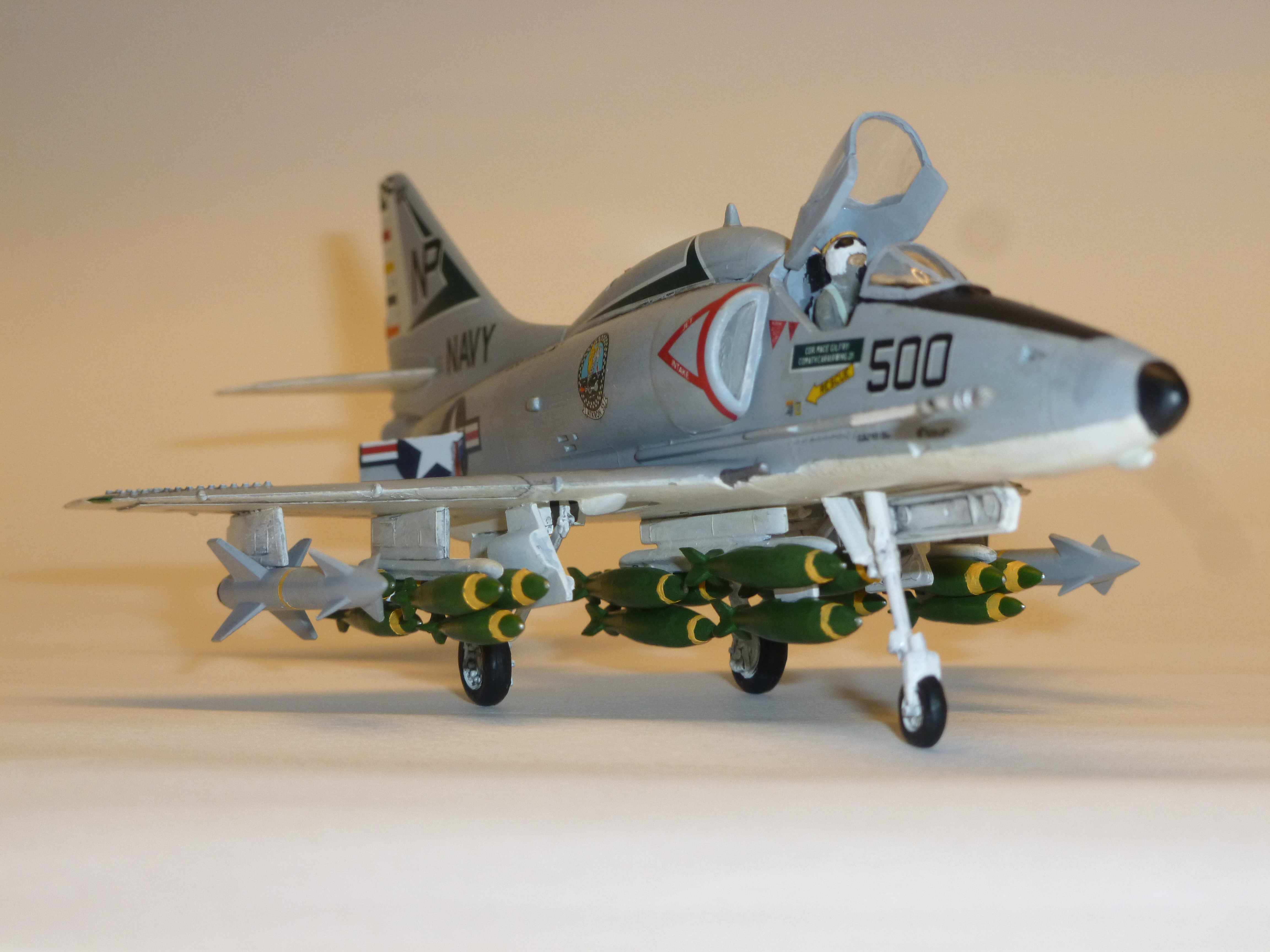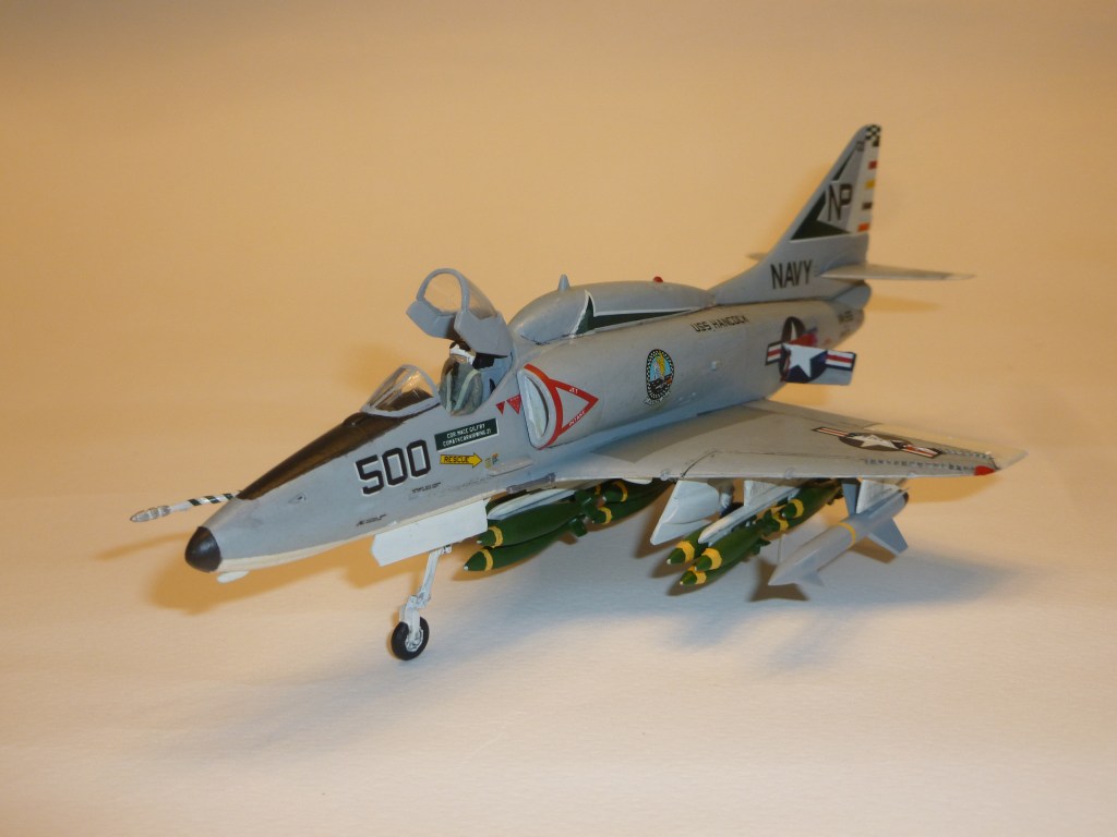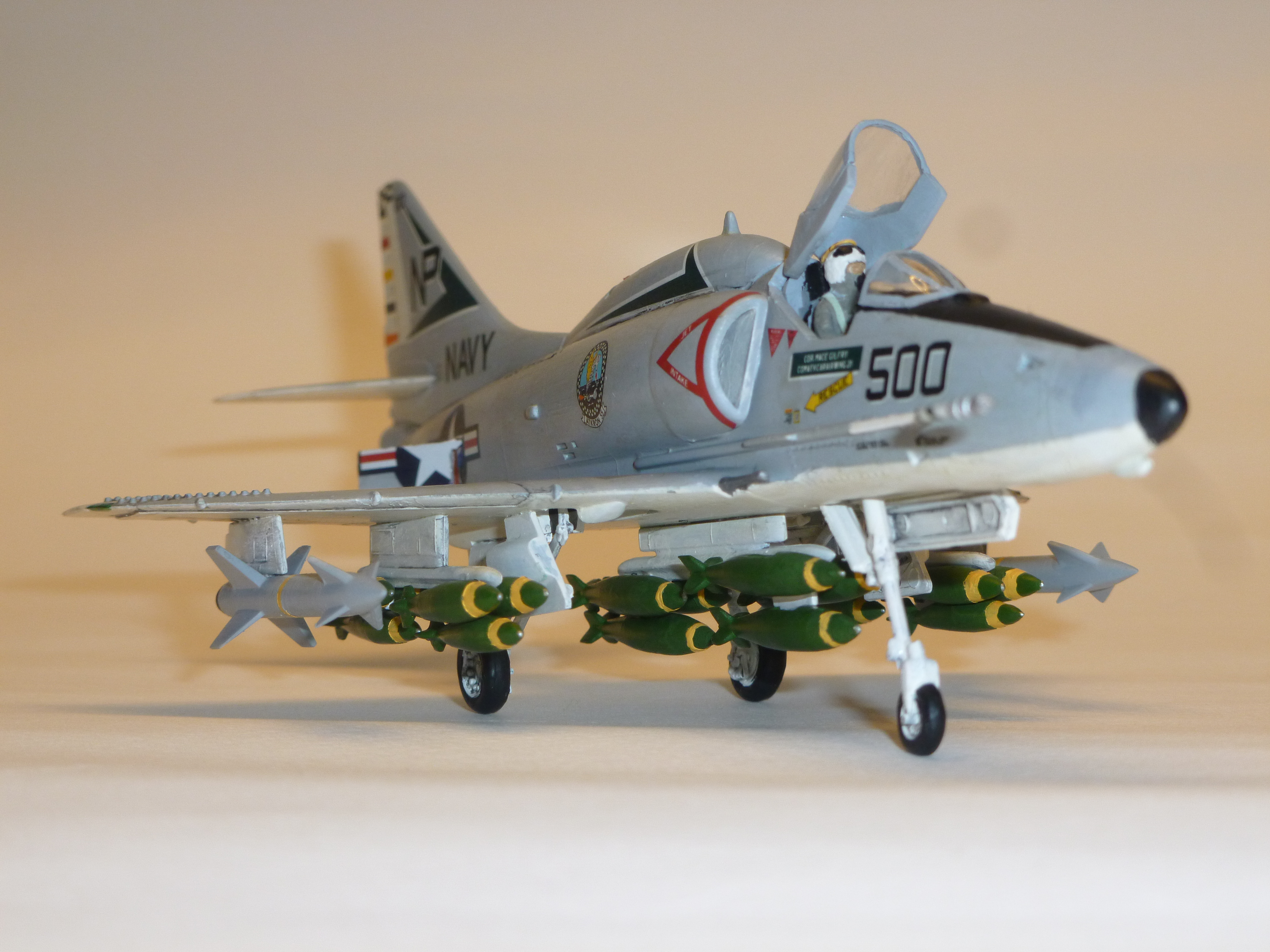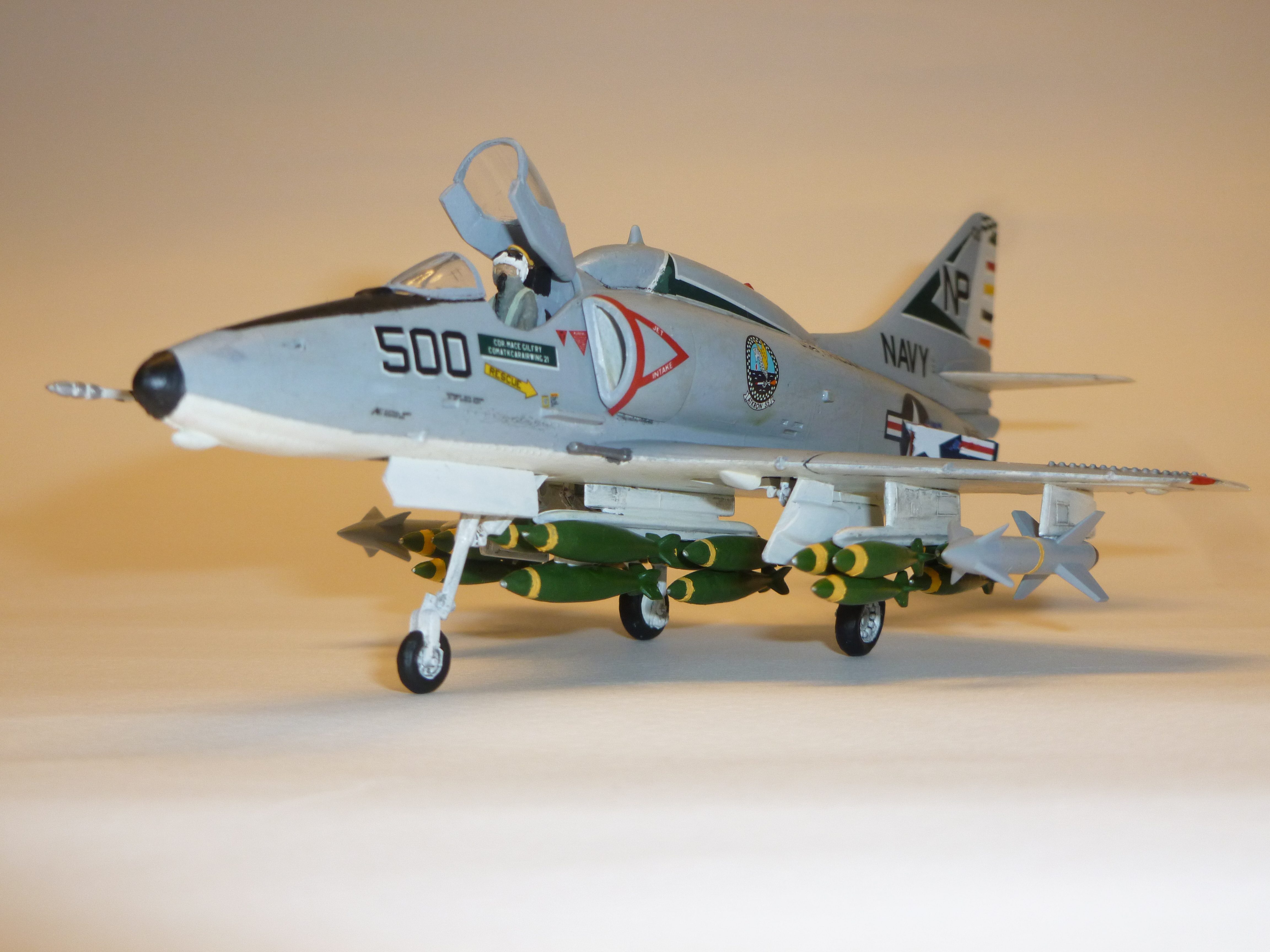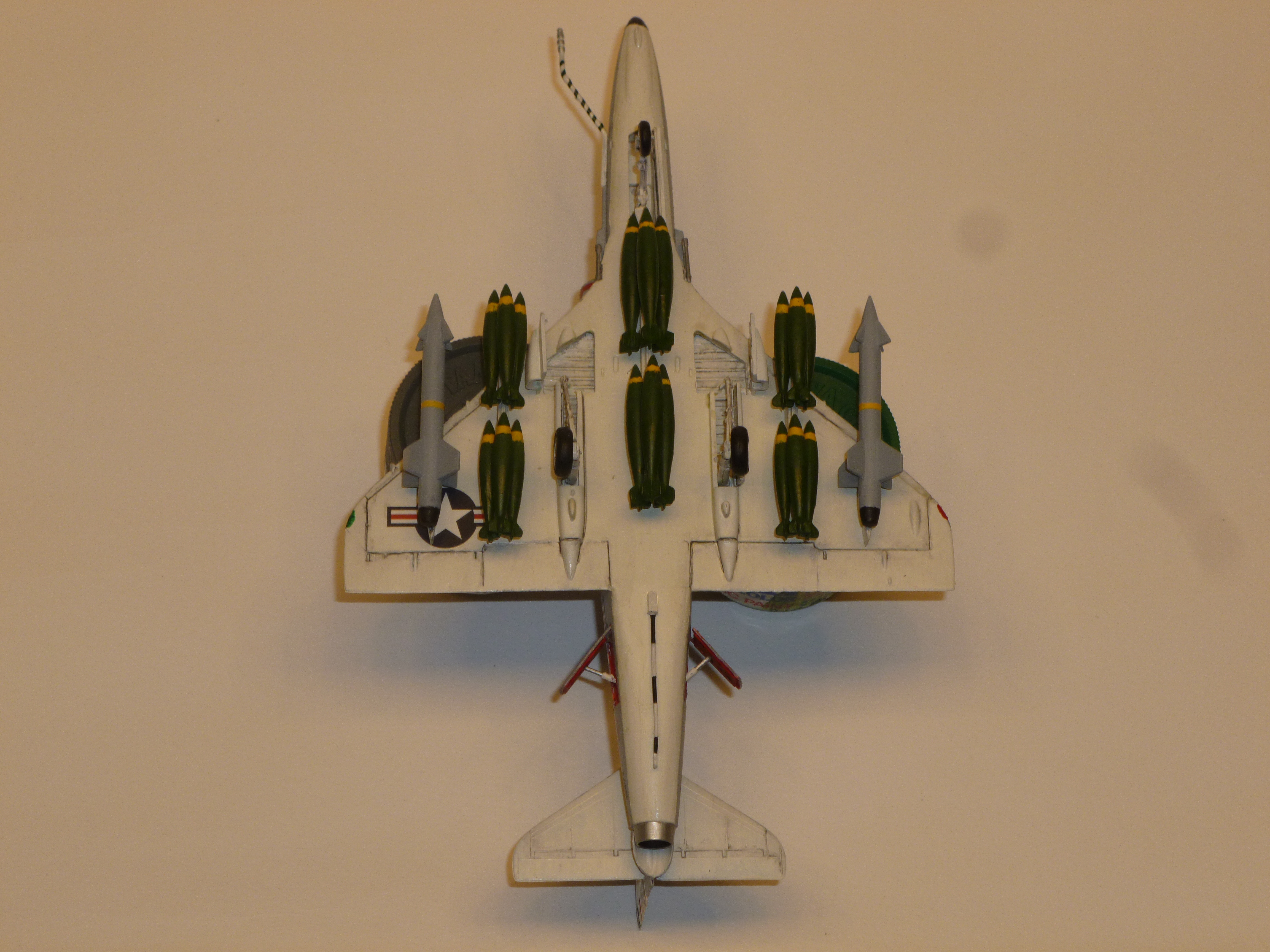 A-4F Skyhawk, 12,2 m uzunluğa ve 8,4 m kanat açıklığına sahiptir. Pratt&Whitney J52-P-8A motoru ile 1.077 km/s hıza ulaşabilmekte ve 12.880 m irtifaya çıkabilmektedir. Sahip olduğu 2×20 mm Colt Mk 12 topu 100’er mermi taşımaktadır. 5 silah istasyonunda toplam 4.490 kg’lık mühimmat taşıyabilmektedir. Havadan havaya AIM-9 SideWinder roketleri; havadan yere AGM-12 Bullpup, AGM-45 Shrike, AGM-62 Walleye, AGM-65 Maverick roketleri ve Mark 20, Mark 7, Mark 80 serisi güdümsüz bombalar ile B57 ve B61 nükleer bombalar taşıyabilmektedir. 3×1.400 litrelik harici yakıt tankı ile uçuş süresi ve menzili arttırılabilmektedir. Yaptığım modelde 12 adet Mk.81 ve 6 adet Mk.82 güdümsüz bomba ile 2 adet AGM-12 Bullpup havadan yere radyo kumandalı roket bulunmaktadır.