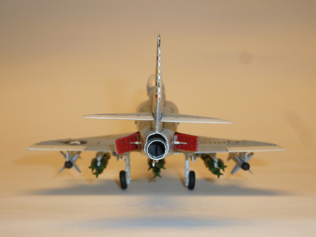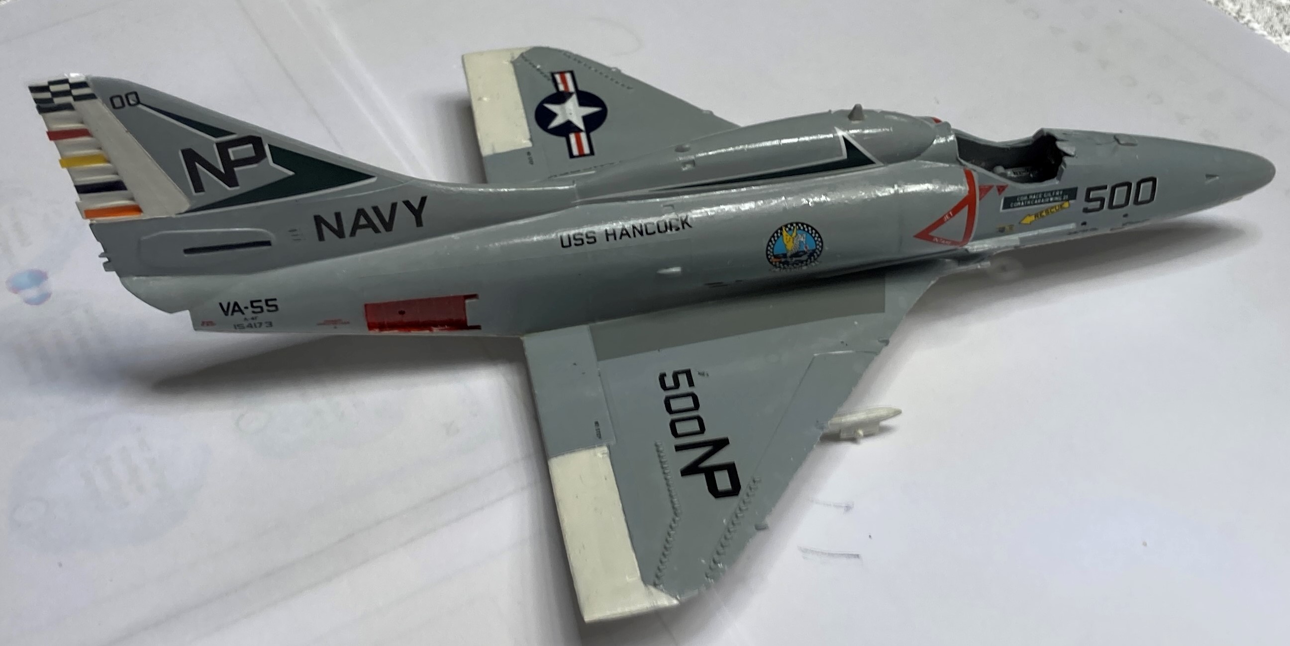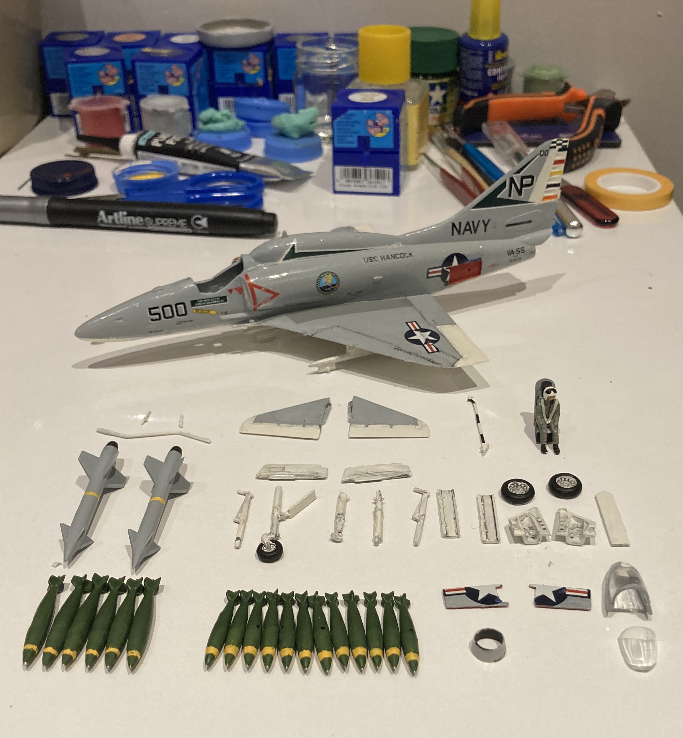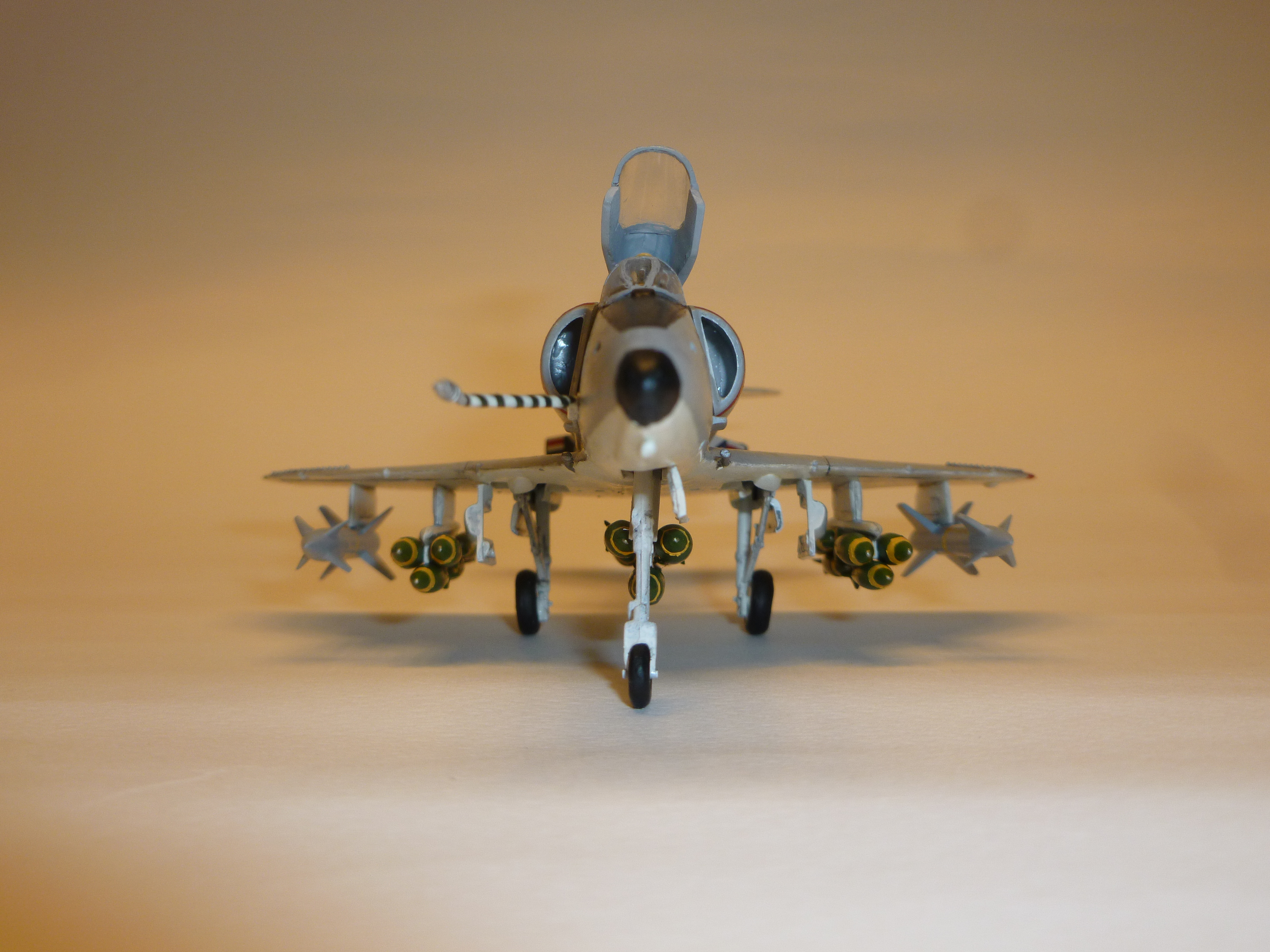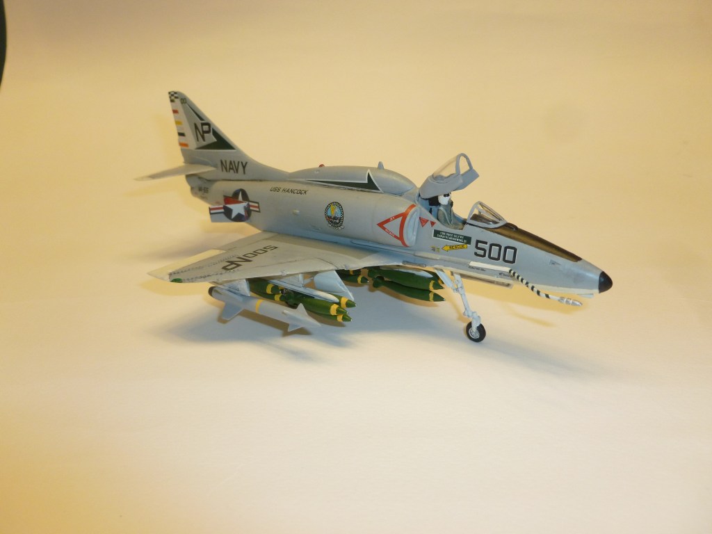 A-4F Skyhawk, 12,2 m uzunluğa ve 8,4 m kanat açıklığına sahiptir. Pratt&Whitney J52-P-8A motoru ile 1.077 km/s hıza ulaşabilmekte ve 12.880 m irtifaya çıkabilmektedir. Sahip olduğu 2×20 mm Colt Mk 12 topu 100’er mermi taşımaktadır. 5 silah istasyonunda toplam 4.490 kg’lık mühimmat taşıyabilmektedir. Havadan havaya AIM-9 SideWinder roketleri; havadan yere AGM-12 Bullpup, AGM-45 Shrike, AGM-62 Walleye, AGM-65 Maverick roketleri ve Mark 20, Mark 7, Mark 80 serisi güdümsüz bombalar ile B57 ve B61 nükleer bombalar taşıyabilmektedir. 3×1.400 litrelik harici yakıt tankı ile uçuş süresi ve menzili arttırılabilmektedir. Yaptığım modelde 12 adet Mk.81 ve 6 adet Mk.82 güdümsüz bomba ile 2 adet AGM-12 Bullpup havadan yere radyo kumandalı roket bulunmaktadır.