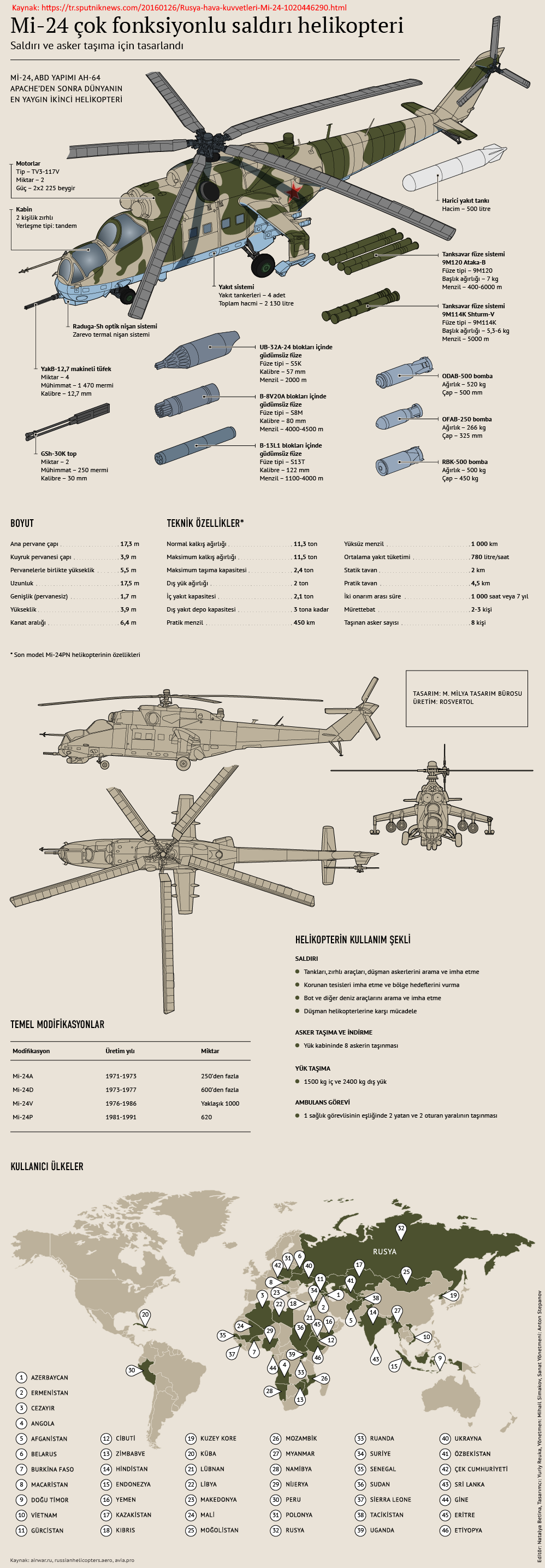 Mil Moscow Helicopter Plant tarafından toplam 2648 adet üretilmiş ve 1972 yılından beri Sovyetler Birliği ve ardılları dahil 48 ülkenin envanterine girmiş bir helikopterdir. İlk uçuşunu 1969 yılında yapan Mi-24, günümüzde de aktif olarak kullanımdadır.