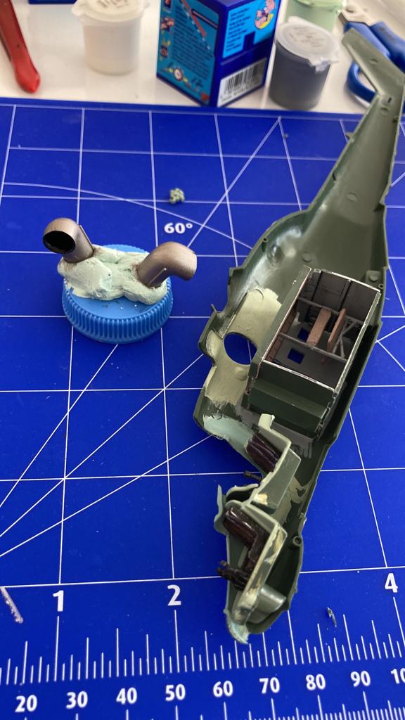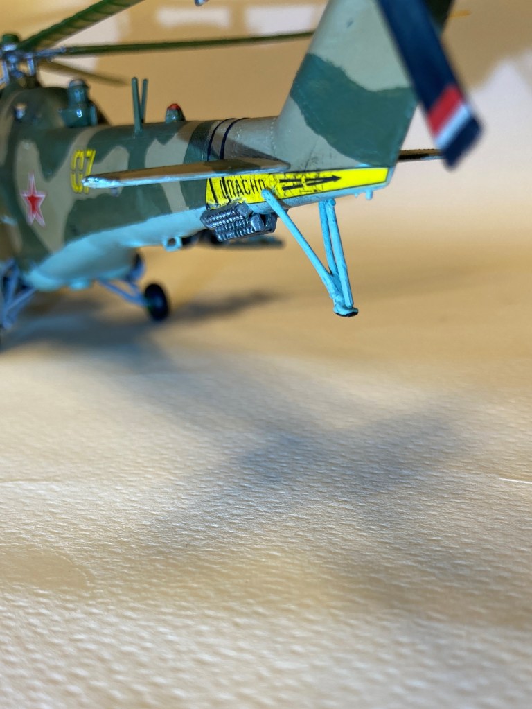 Mi-24 modeli ne yazık ki dışa detay olmasına rağmen detay seviyesi genel olarak tatmin edici düzeyde. Birkaç birleşme problemi dışında, fazla zımpara ve macun gerektirmeyen, ek detaylandırma için ideal bir kit. Zira ben de teller kullanarak referanslarda gördüğüm şekilde, kabin kapılarına tutma kolları, açma-kapama mekanizması ve kanopiye de cam silecekleri yaparak modele ekledim. Ayrıca kuyruktaki chaff/flare dispanserlerine de boyayım kestiğim maskeleme bantlarını kullanarak referans videolarda gördüğüm şekilde bağlantı kayışları yaptım.