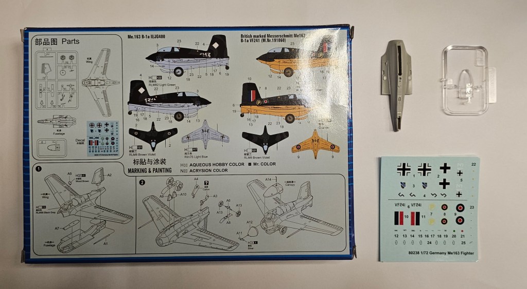 Hobby Boss firmasının 2007’de çıkardığı bir kit. Easy Assembly bir kit olduğundan kokpiti de içeren gövde sadece 2 parçanın montajıyla tamamlanmakta ve geri kalan 15-16 parçayla uçak bitmekte. Me-163 B-1 modelini yapmanıza olanak sağlayan ve minimalist düşünülen bir kit, yapım şeması bile kutunun arka yüzüne baskı şeklinde verilmiş. Bütün parçalar süngerimsi bir malzeme ile sarılı vaziyette gelmekte. Kitte yer alan decaller iki farklı uçaktan birini yapmanıza izin veriyor. Genel olarak ince detaylara sahip ve bulunabilirlik anlamında birkaç alternatiften biri. Az parçalı ve uyumun çok iyi olmasından dolayı yapımı çok hızlı bitiyor. Kutu içeriğine ek olarak alüminyum ilaç blisterinden koltuk kemerlerini yapıp ekledim. Gövdeyi Vallejo akrilik boyalar kullanarak fırçayla boyadım. Geri kalan detayları da fırçayla tamamladım. Parlak vernik olarak Mr. Hobby, mat vernik olarak Edding sprey ürünlerini kullandım. Kirletme için Tamiya koyu gri panel liner kullandım. Bu modeli her düzeydeki modelcilere tavsiye ediyorum.