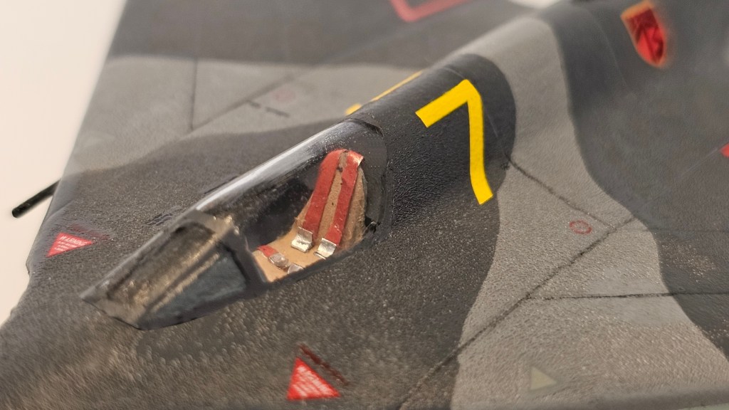 Yapıma kokpite başlayıp ilaç blister alüminyumundan kemerleri yaptım, eski decallerden de göstergeleri uydurdum. Burundaki top oyuklarını ve kanatlarda olmayan oyukları da el matkabıyla açtım. Burun kısmına ve kokpit çevresine sakız yapıştırıcılarla ağırlık ekledim. Hava alıklarından gözüken kısımlarını da siyahla boyayarak derinlik hissi oluşturdum. Egsoz jet konisinin ortasını delerek gövdeye ekledim, kokpiti de yerine yerleştirip gövdeyi kapadım. Daha sonra da dikey stabilizatörü ekledim. Genel olarak birleşim sorunsuz gitti. Uçak hiç uçmadığı için boya ve decal konusunda kısmen özgür davrandım. Gövde üstü için kılavuzda verilen gri kamuflajı, gövde altı için de açık mavi rengi kullandım. Parlak vernik sonrası kitten çıkan decallere ek olarak numara, servis, arma gibi decaller ekledim. İkinci kat vernikten sonra panellere kirletme uyguladım. Ön iniş takımını başka bir parçayla değiştirdim, arka iniş takımlarına da eklemeler yaptım. Kanatlara top namluları ekledim ve burundaki top oyuntularına is efekti yapmaya çalıştım. En son kullandığım mat cila verniğin azizliğine uğrayıp ince bir portakal kabuğu görünümlü bir bitiş elde ettim.