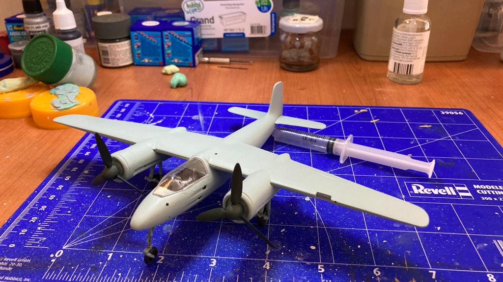 Kokpiti olduğu gibi bırakıp hızla topladım. Gövdenin sol ve sağ yarıları; motorların sol/sağ yarıları ve kanatların alt/üst yarıları nispeten rahat birleştirilebilse de ortaya çıkan birleşik parçaların birbiriyle montajı gerçekten çok zorlu bir süreç. Bol miktarda dolgu ve zımpara sonucunda belli bir noktaya gelmek mümkün olabiliyor.