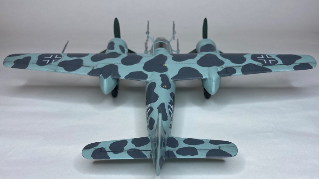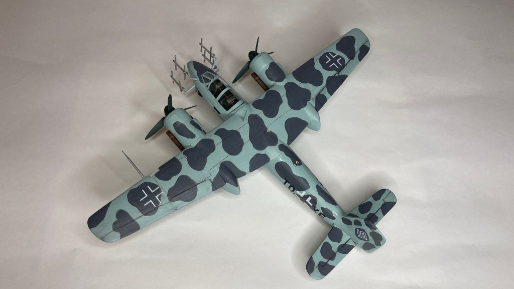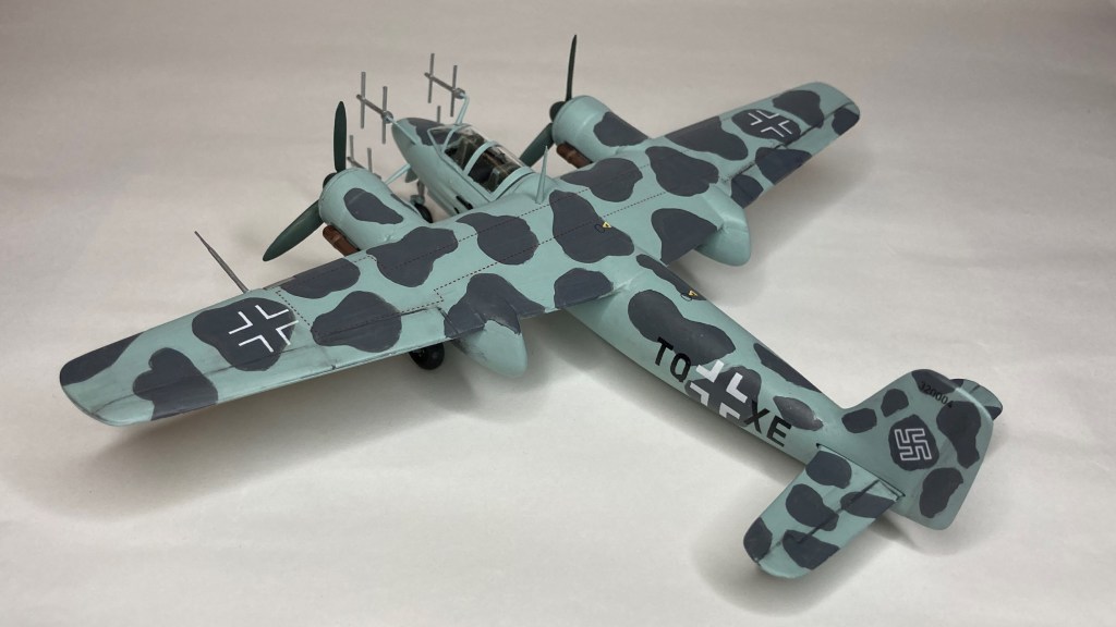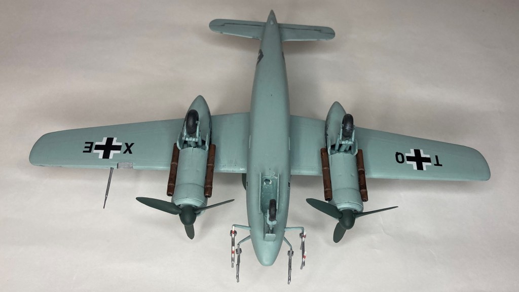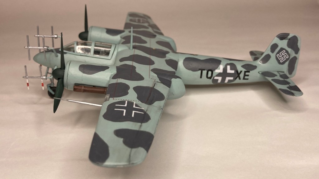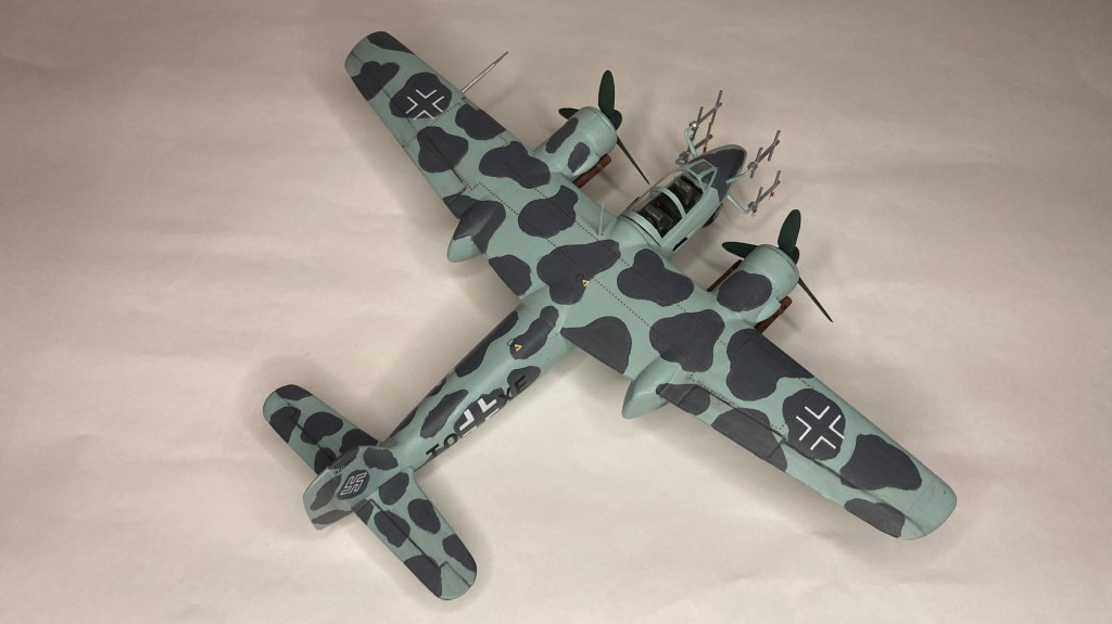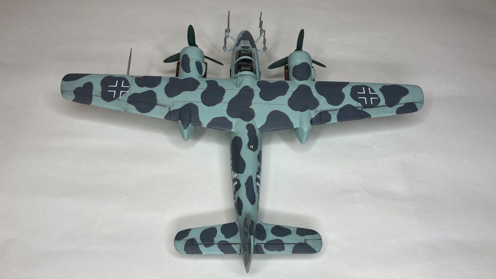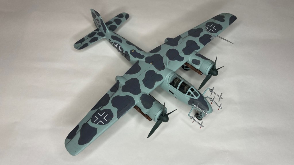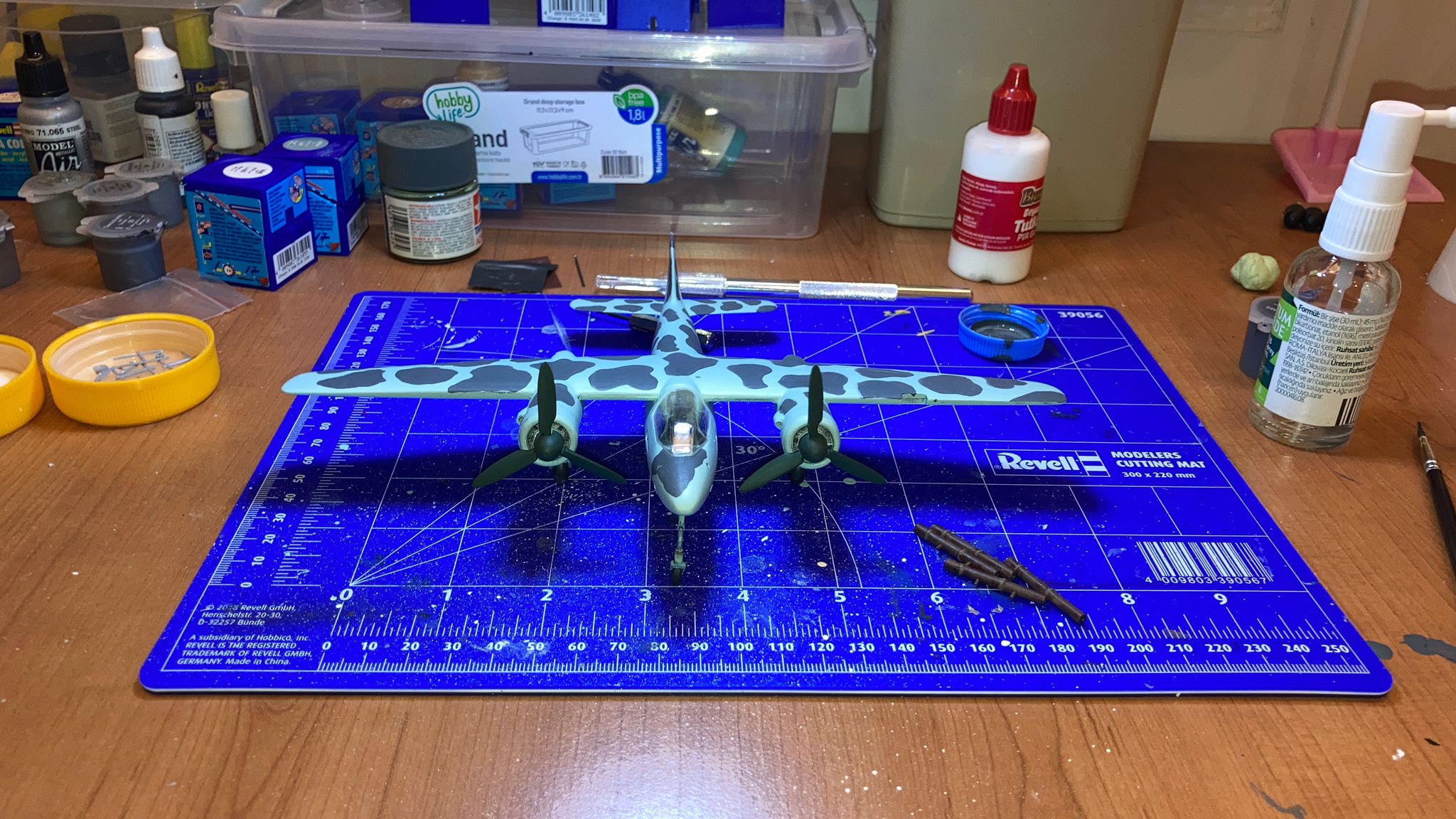 Tüm uçağı fırçayla ve akrilik boyalarda boyadım ve vernikledim. Ana gövde rengi olan RLM 76’yı Revell Aqua Color 149 (açık mavi) ve beyazı yaklaşık 80/20% karıştırarak elde etmeye çalıştım. Benek rengi olan RLM 75’i de tam karşılamasa da Revell AC 174 Gunship Gray ile benzetmeye çalıştım. Pervane konisi ve kanatları için RLM 70’e yakın olan Revell AC 148 Deniz yeşilini kullandım.