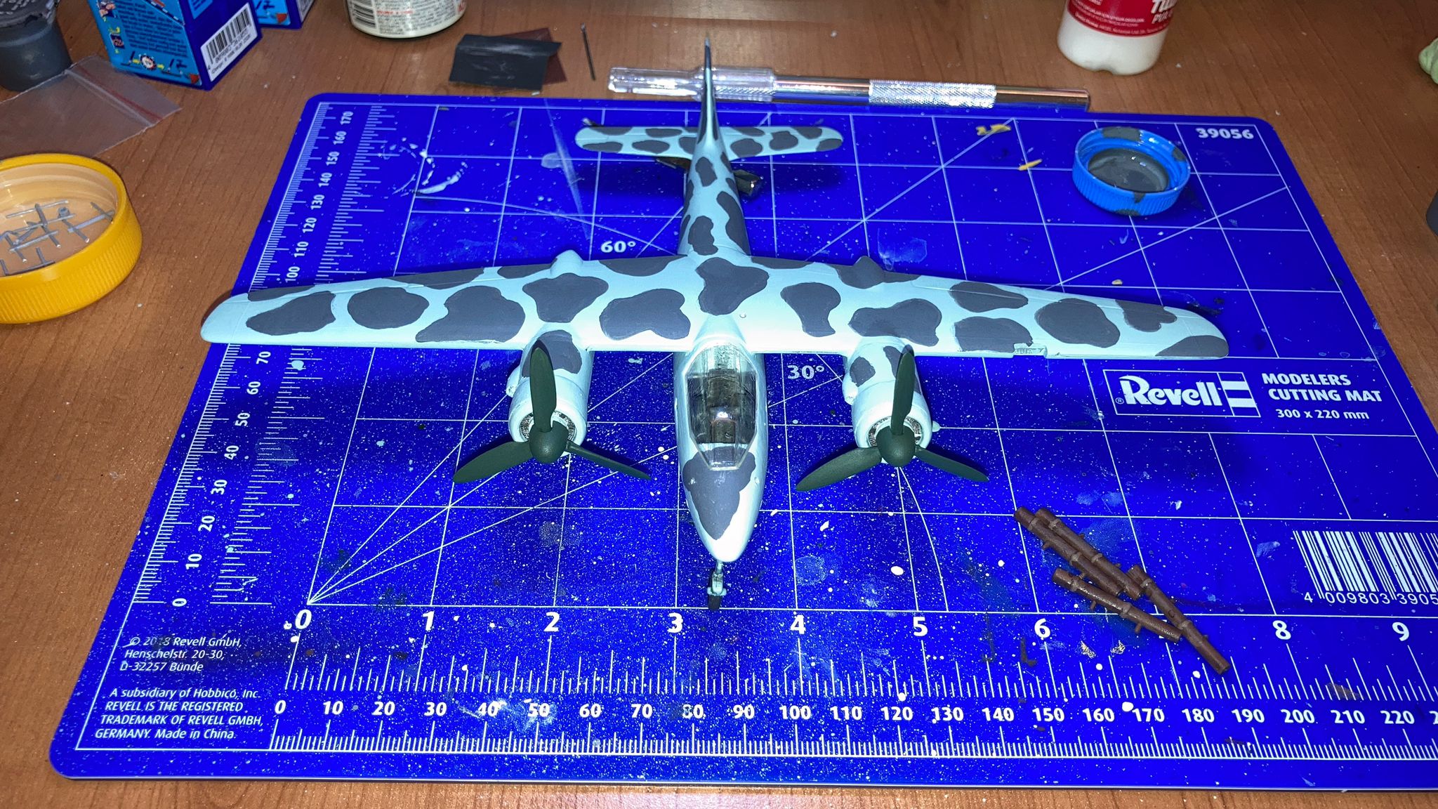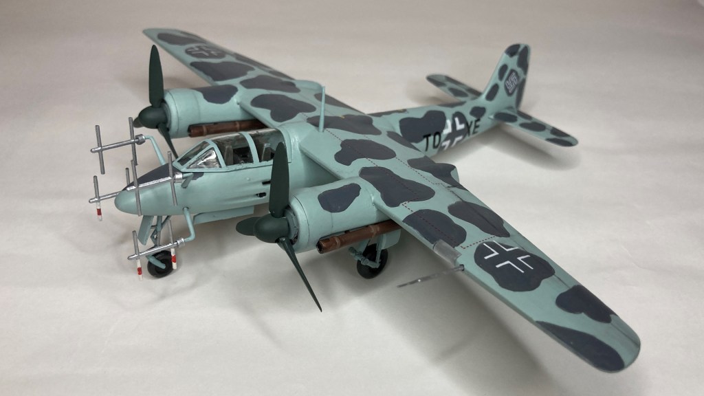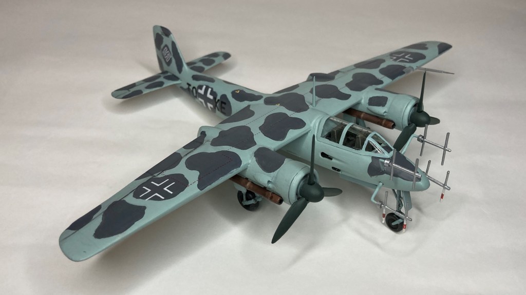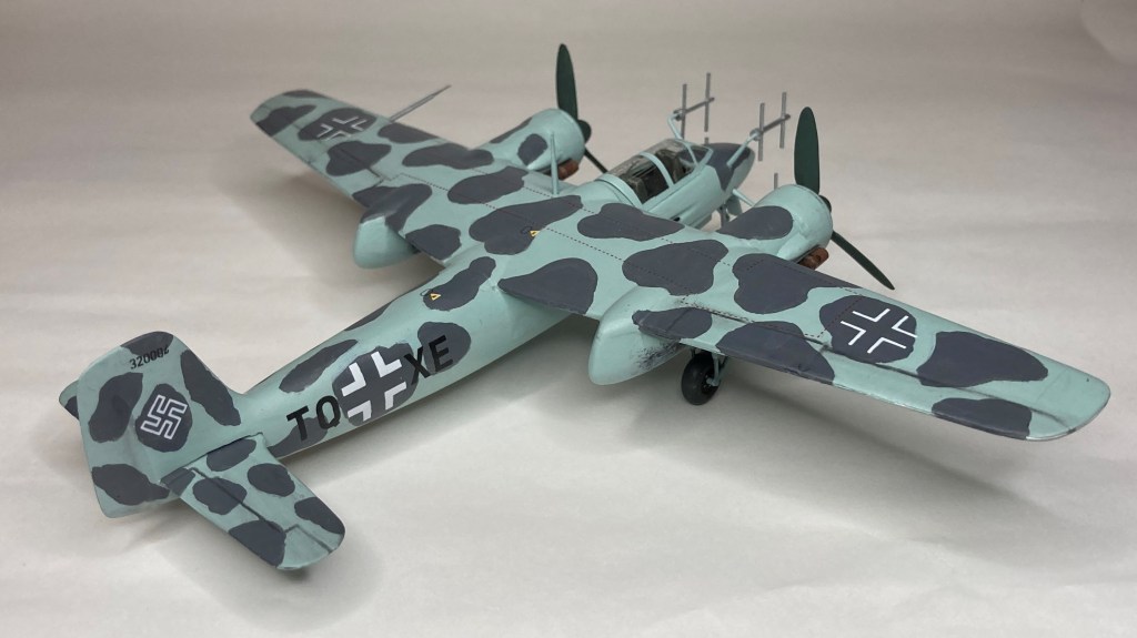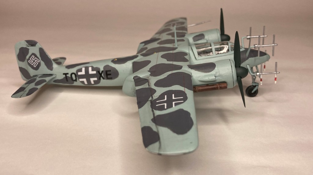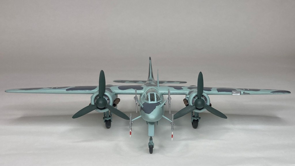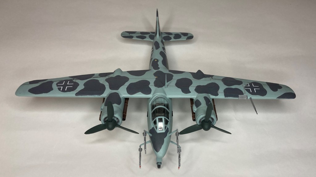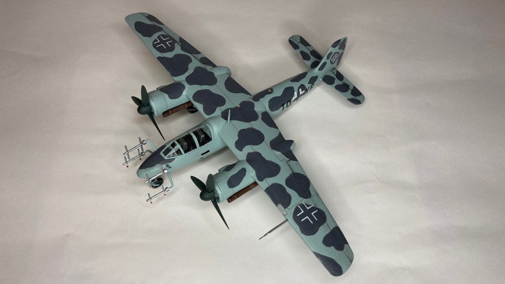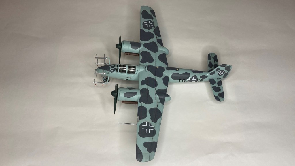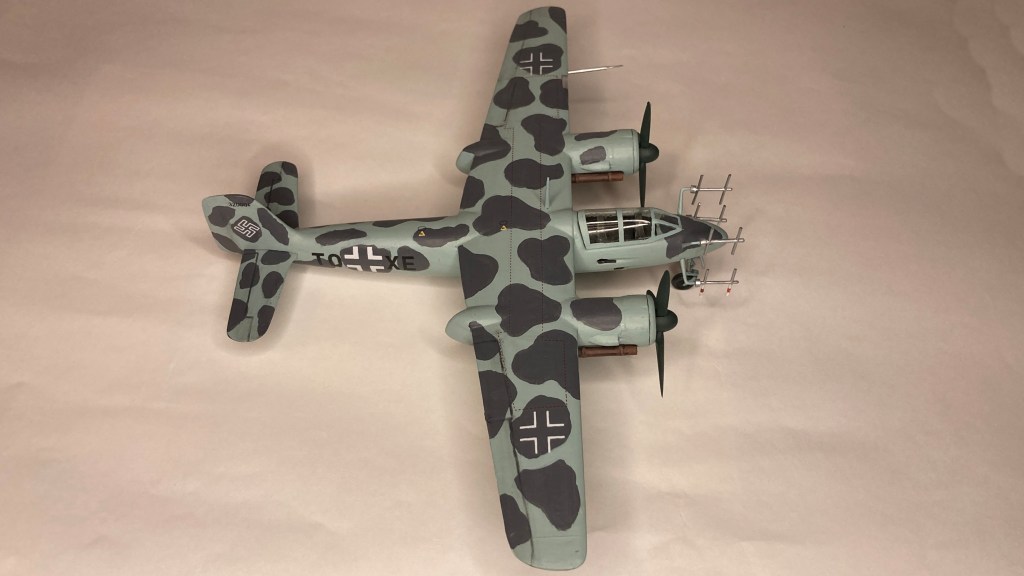 Tüm uçağı fırçayla ve akrilik boyalarda boyadım ve vernikledim. Ana gövde rengi olan RLM 76’yı Revell Aqua Color 149 (açık mavi) ve beyazı yaklaşık 80/20% karıştırarak elde etmeye çalıştım. Benek rengi olan RLM 75’i de tam karşılamasa da Revell AC 174 Gunship Gray ile benzetmeye çalıştım. Pervane konisi ve kanatları için RLM 70’e yakın olan Revell AC 148 Deniz yeşilini kullandım.