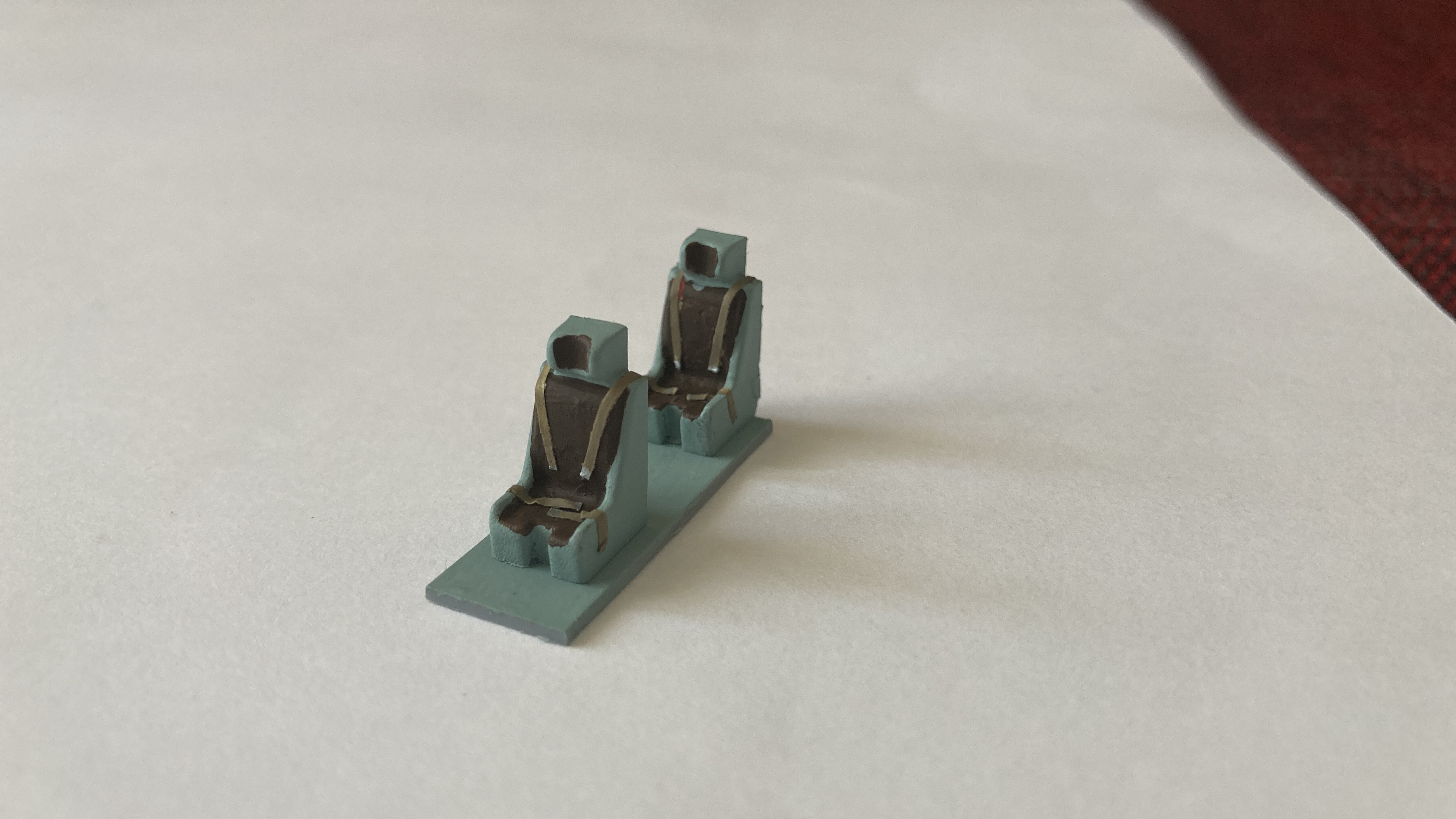 Standart olarak kokpitle başlayıp, zemin, gövde içi ve koltukları boyadım, maske bantlarından kemerleri ekledim, burna ağırlıkları koyup sağ/sol gövde yarılarını kapadım. Kanatları ekleyip dikey/yatay stabilizatörleri yapıştırdım. Bu birleşimlerde putty gerekli oldu.