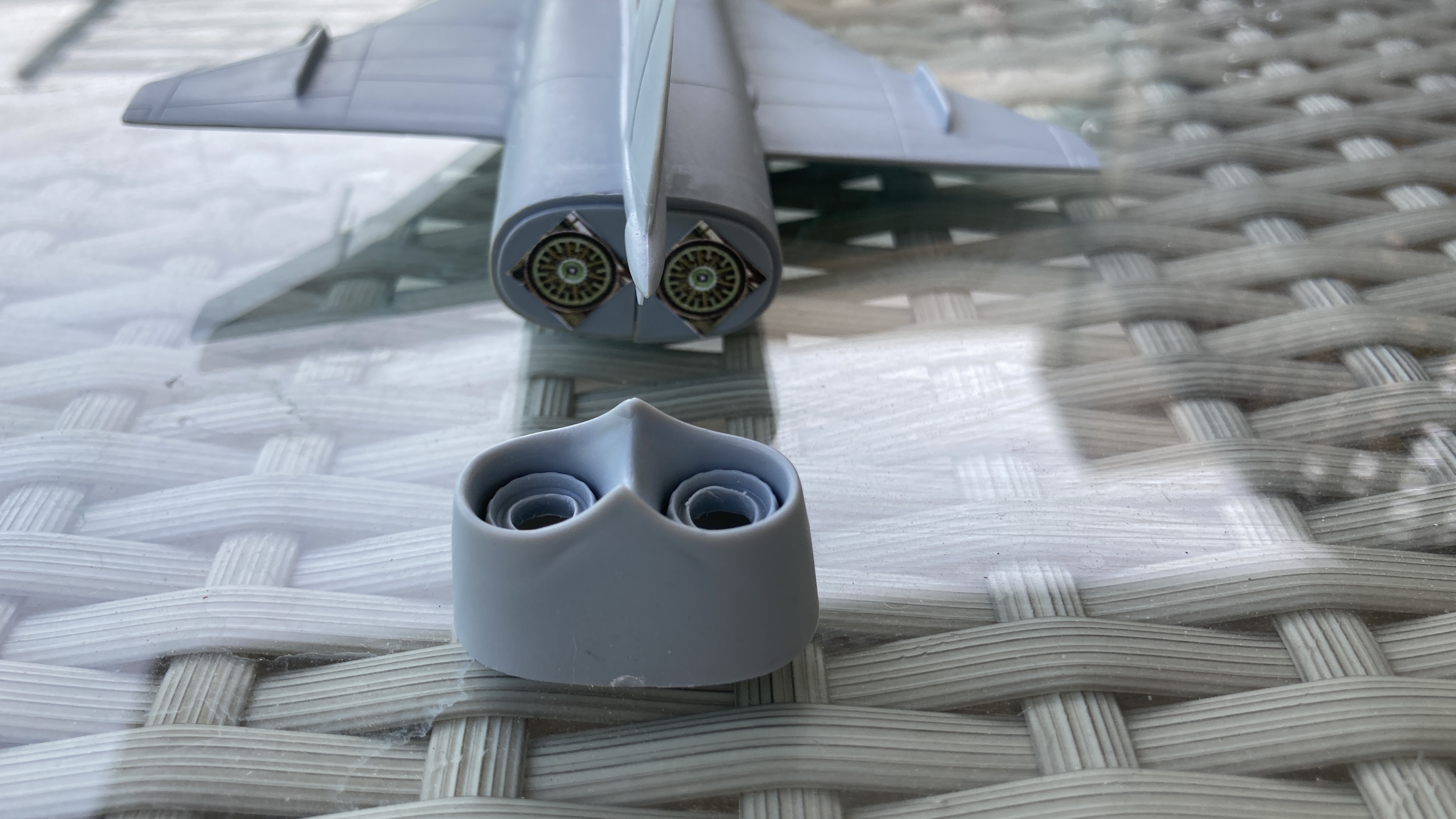 Kapalı verilen egzoz çıkışlarını delip, karşılarına R-13F-300 motorunun egzoz fotolarından aldığım çıktıları yapıştırdım. Böylece çıkışlardan bakıldığından en azından boş bir görüntüyü engelledim.