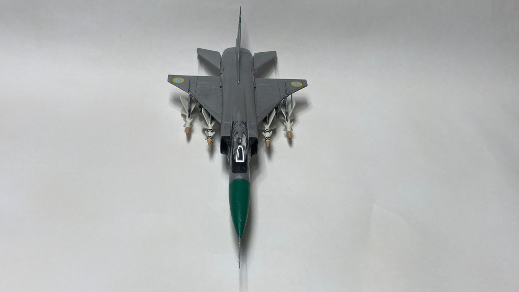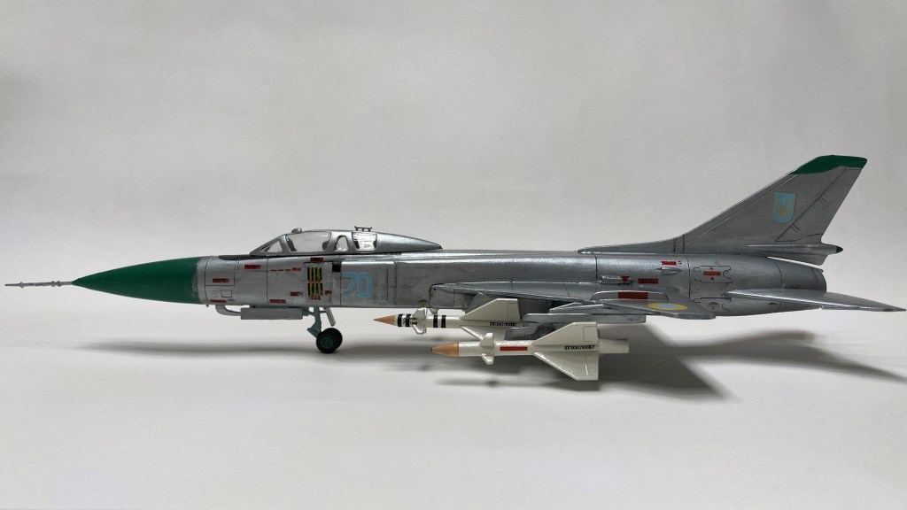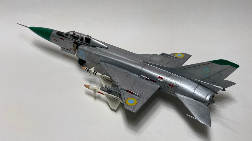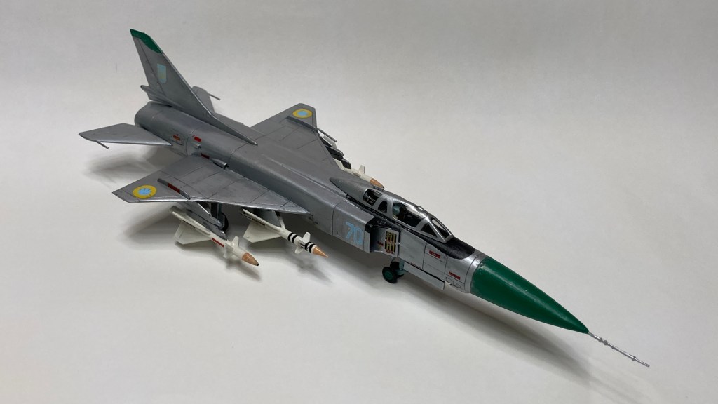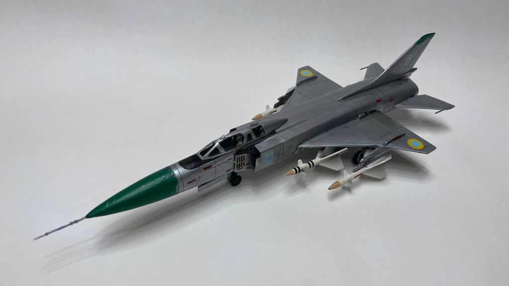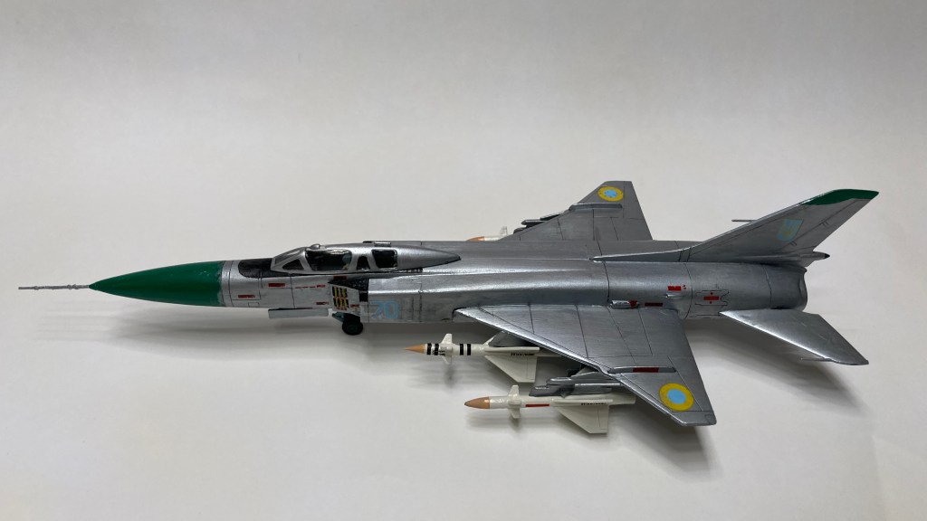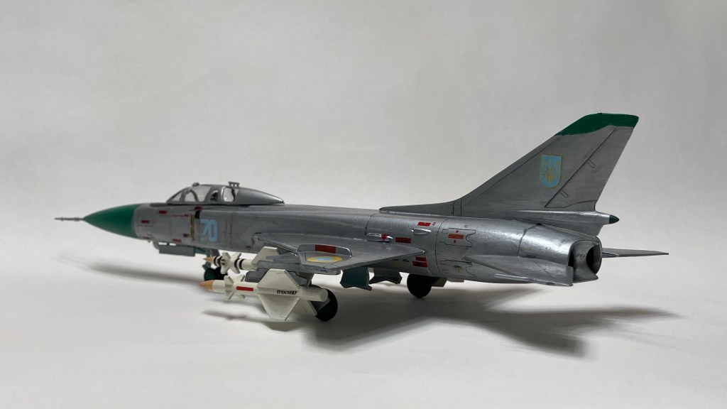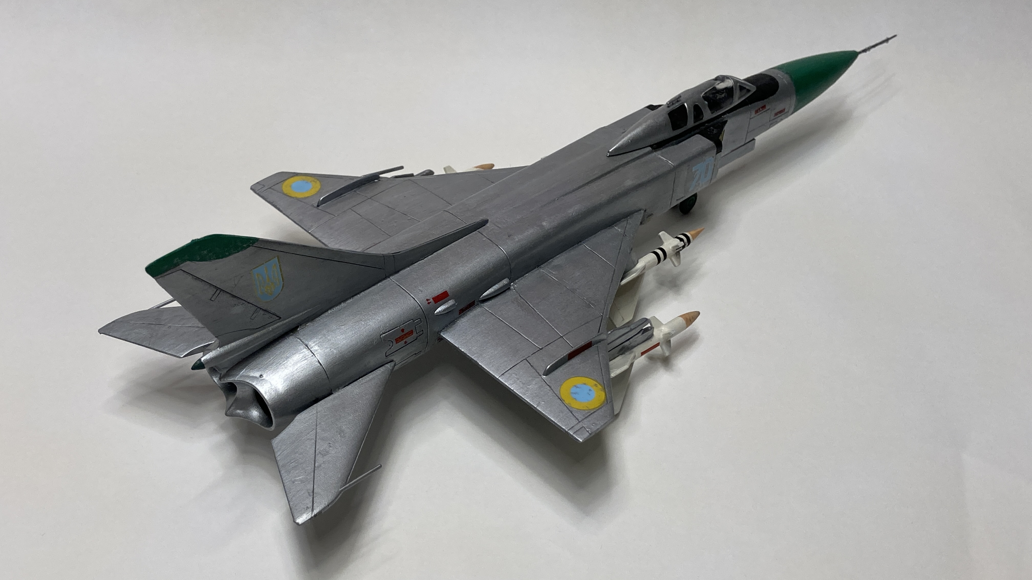 Hava alıklarını birleştirip tesviye ettim ve gövdeye ekleyerek tekrar tesviye uyguladım. Pilonları ekledikten sonra uçağı bir kat alüminyum ile boyayarak bozuklukları düzelttim ve ardından birkaç kat alüminyum renk uygulaması yaptım. K-8 roketlerini birleştirdim, tesviye ve boyasını yaptım, ardından kendi bastığım decalleri uyguladım. Rus decallerini kullanmış olduğumdan uçağı Ukrayna hava kuvvetleri olarak bitirdim. İniş takımları ve roketleri ekledim, ardından, birkaç küçük detayı tamamladım. Kanopi boyasından sonra onu da yerine ekleyerek kiti bitirmiş oldum. Modelin tüm boya ve vernik işlemleri fırça ile yapıldı.