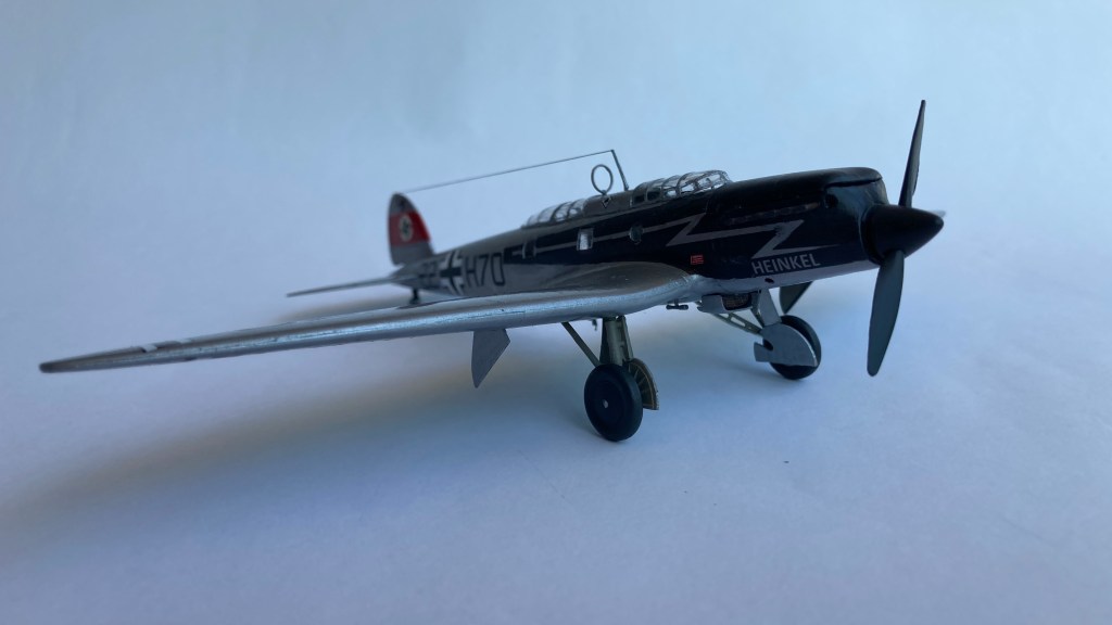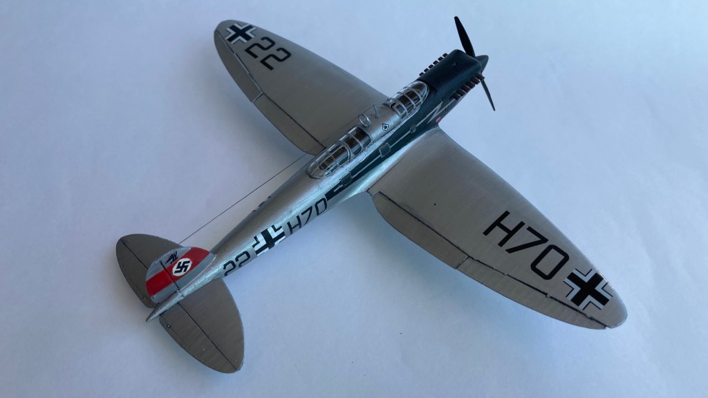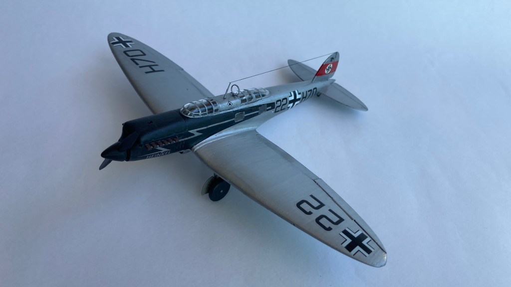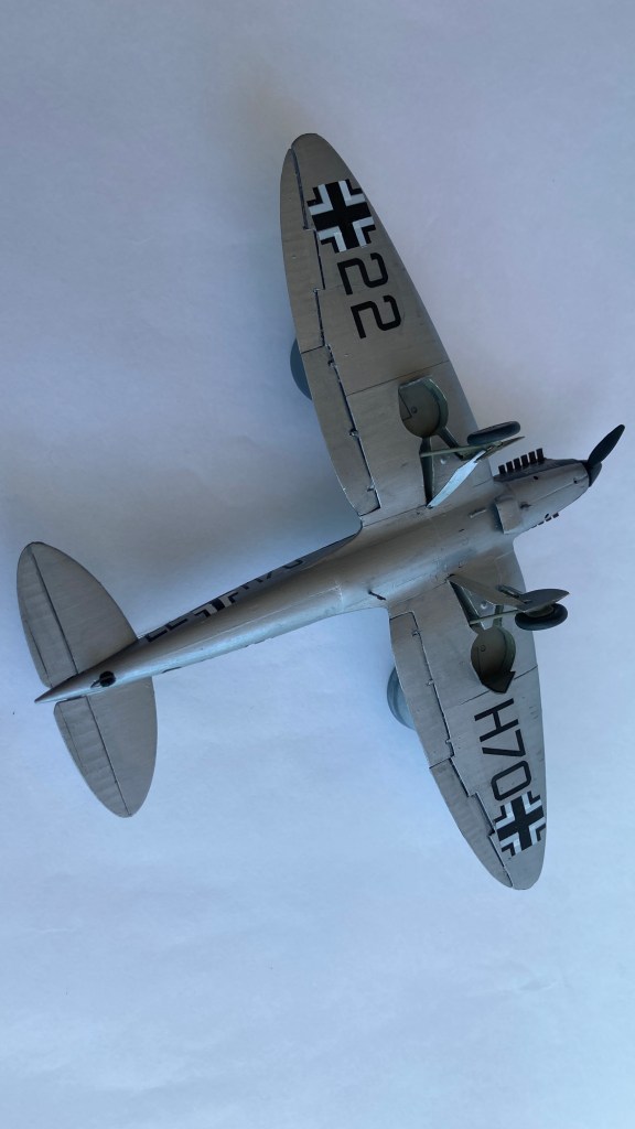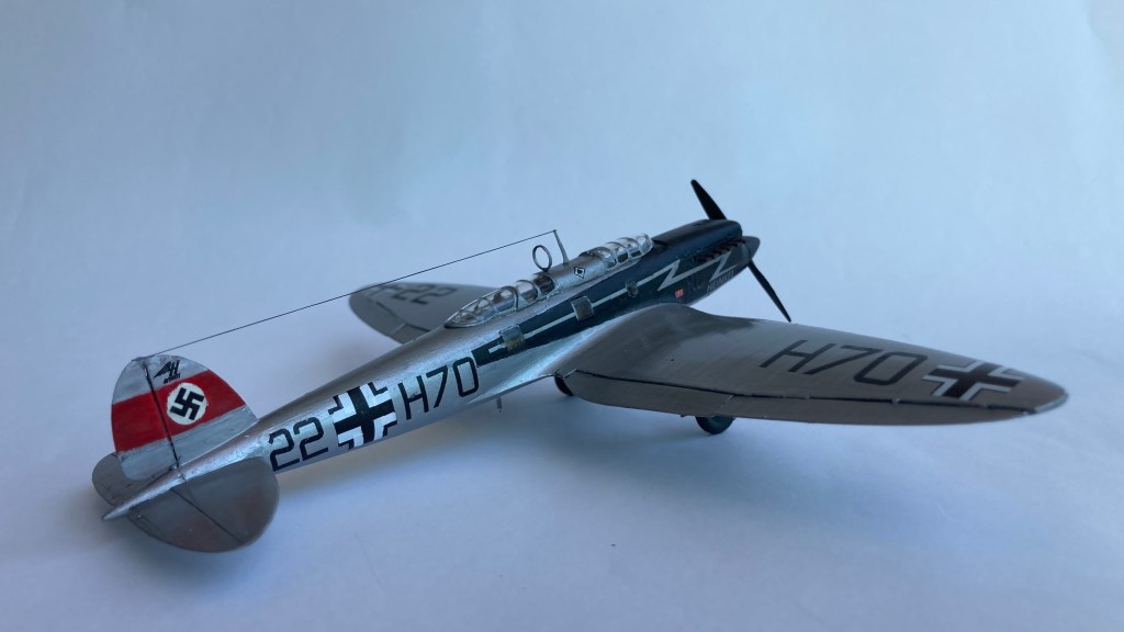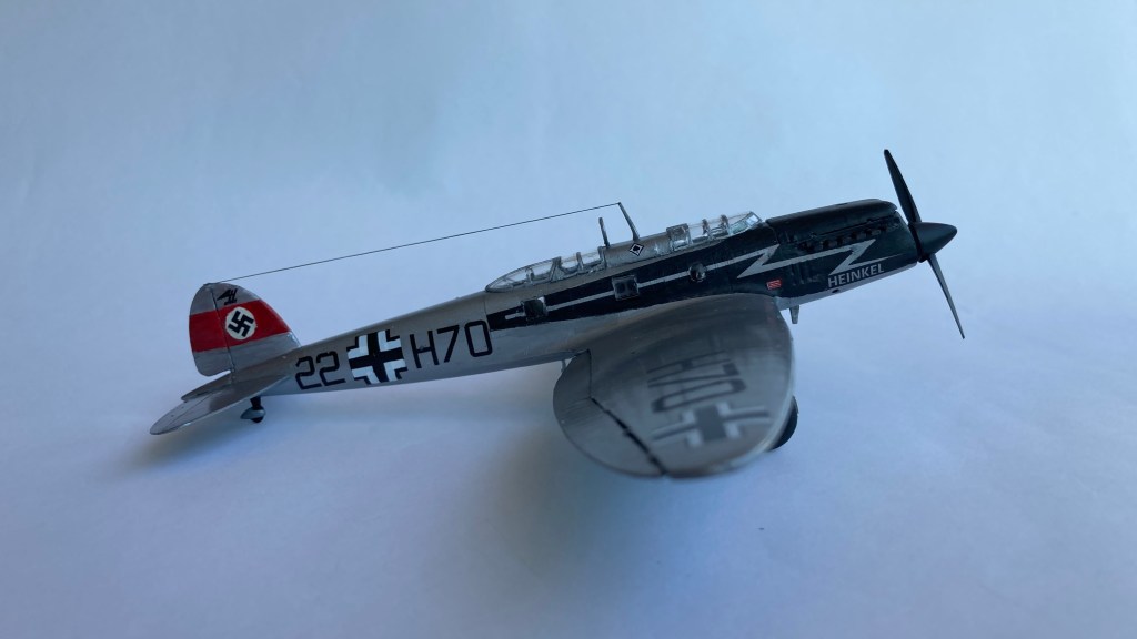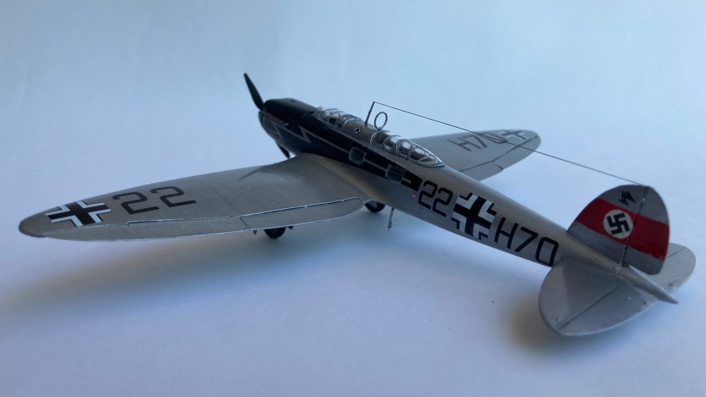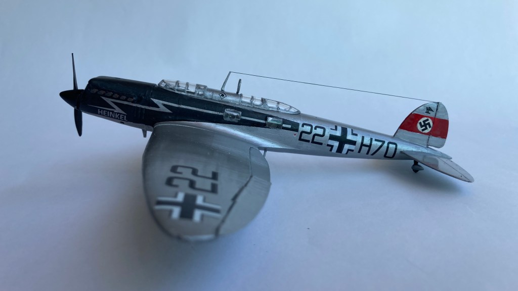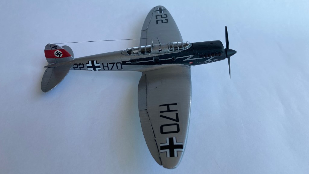 Kılavuzda önerilen yeşil kamuflaj yerine referanslardan yola çıkarak metalik ve siyah şekilde uçağı bitirdim. Ön kısımdaki HEINKEL yazısı ve yıldırım çizgilerini siyah decal basarak oluşturdum. Decaldeki şeffaf kısımlardan zemindeki metalik boyanın gözükmesiyle yazı ve yıldırım çizgileri ortaya çıktı. Decallerin etrafını ise siyah boya ile tamamladım. Uçağın 22H70 şeklindeki kodlaması ise benim uydurmam, H70 uçak tipini, 22 de 2022’de yapılan bir He-70’i simgeliyor. İç kısımda kullanılan decaller haricinde kalan decal kağıdını sanırım yanlışlıkla attım. O nedenle kodlar yanında Alman haçlarını da basmak zorunda kaldım, yürüyüş yolu çizgileri ise maalesef mümkün olmadı. Sadece kanat üstündeki haçları eski decallerden kullandım. Bunun yanında kuyruktaki Heinkel armaları ve gamalı haçlar da kendi baskım.