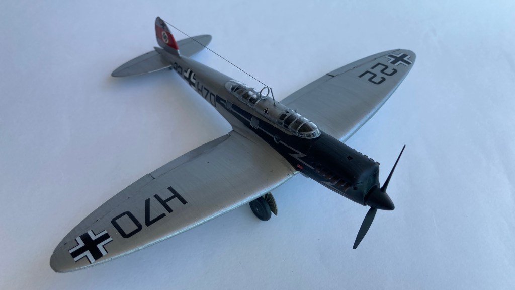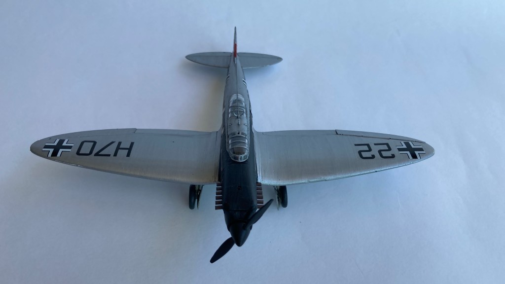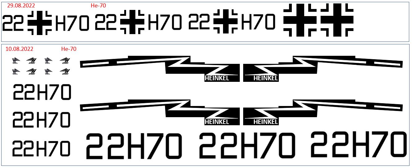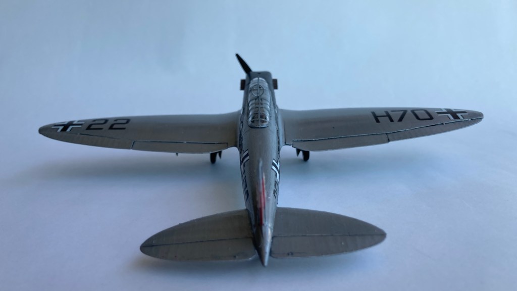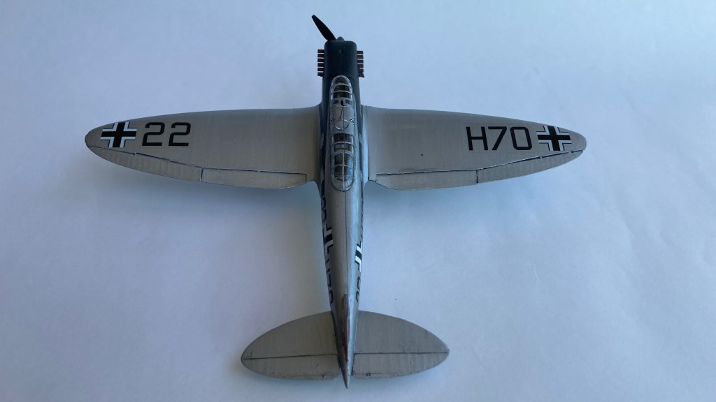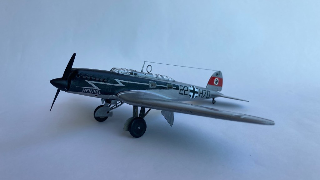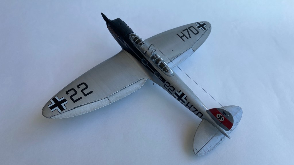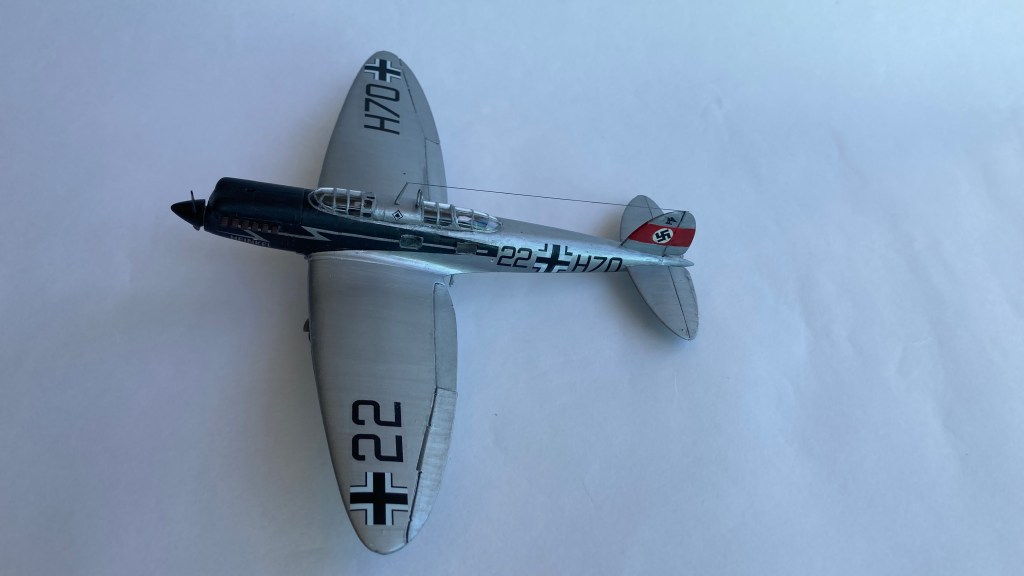 Kılavuzda önerilen yeşil kamuflaj yerine referanslardan yola çıkarak metalik ve siyah şekilde uçağı bitirdim. Ön kısımdaki HEINKEL yazısı ve yıldırım çizgilerini siyah decal basarak oluşturdum. Decaldeki şeffaf kısımlardan zemindeki metalik boyanın gözükmesiyle yazı ve yıldırım çizgileri ortaya çıktı. Decallerin etrafını ise siyah boya ile tamamladım. Uçağın 22H70 şeklindeki kodlaması ise benim uydurmam, H70 uçak tipini, 22 de 2022’de yapılan bir He-70’i simgeliyor. İç kısımda kullanılan decaller haricinde kalan decal kağıdını sanırım yanlışlıkla attım. O nedenle kodlar yanında Alman haçlarını da basmak zorunda kaldım, yürüyüş yolu çizgileri ise maalesef mümkün olmadı. Sadece kanat üstündeki haçları eski decallerden kullandım. Bunun yanında kuyruktaki Heinkel armaları ve gamalı haçlar da kendi baskım.