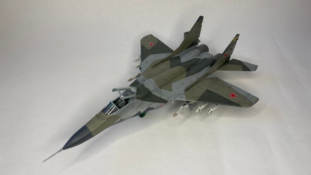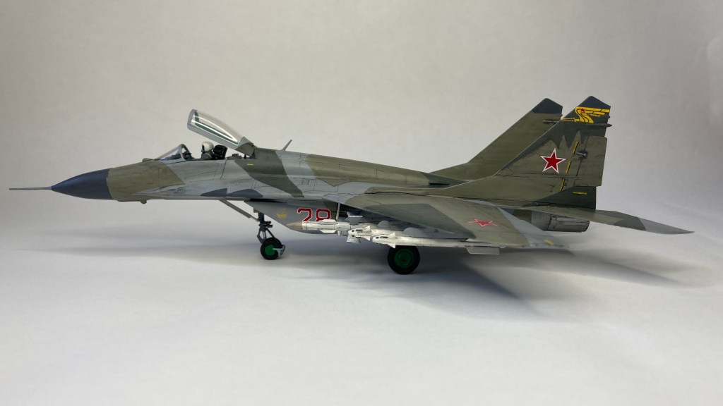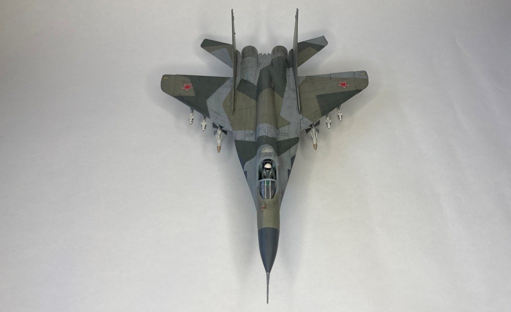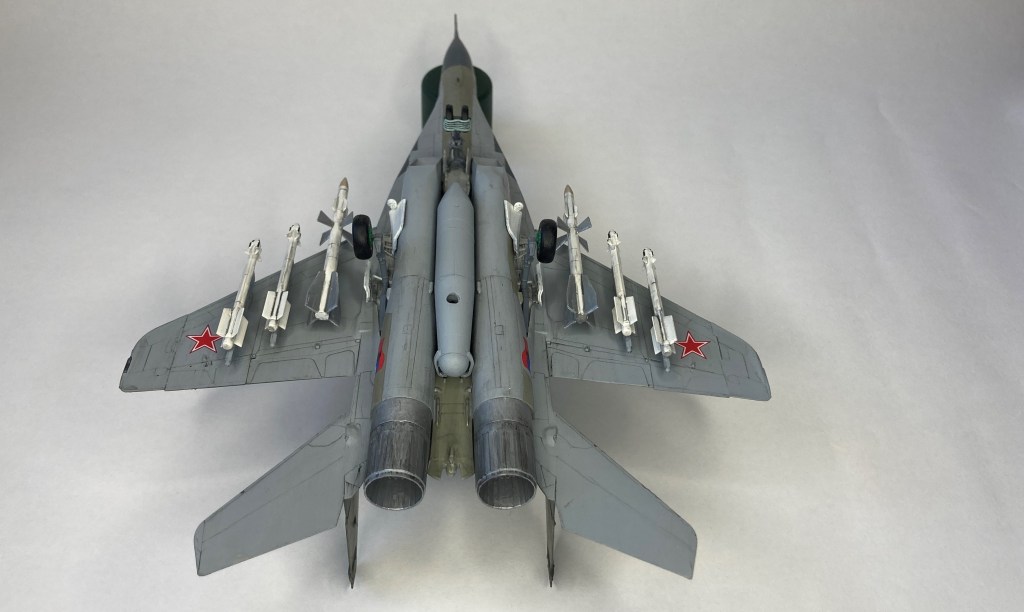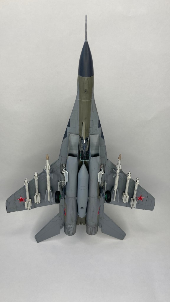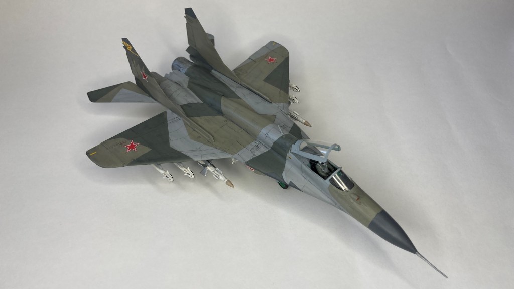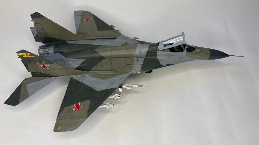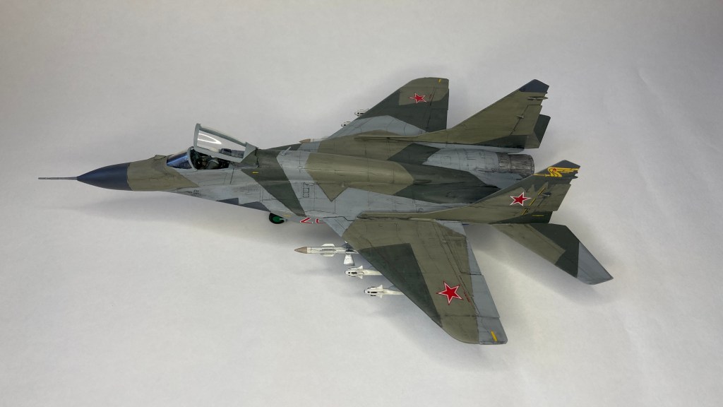 Mühimmat olarak uçağın hava üstünlük rolüne uygun şekilde iki adet Vympel R-27 (AA-10 “Alamo”) orta menzilli hava-hava füzesi ve dört adet R-73 (AA-11 “Archer”) it dalaşı hava-hava füzesi kullandım. Gövde altında da bir adet harici yakıt tankı ekledim. Eskitme için Tamiya koyu gri panel liner ve sulu boya kalemleri kullandım. Yapımda farklı Aqua Color renkleri dışında, jantlar için yeşil emay boya, Vallejo akrilikleri, metalik, yeşil, siyah ve kırmızı permanent kalemlerden yararlandım. Modelin tüm boya ve vernik işlemleri fırça ile yapıldı.