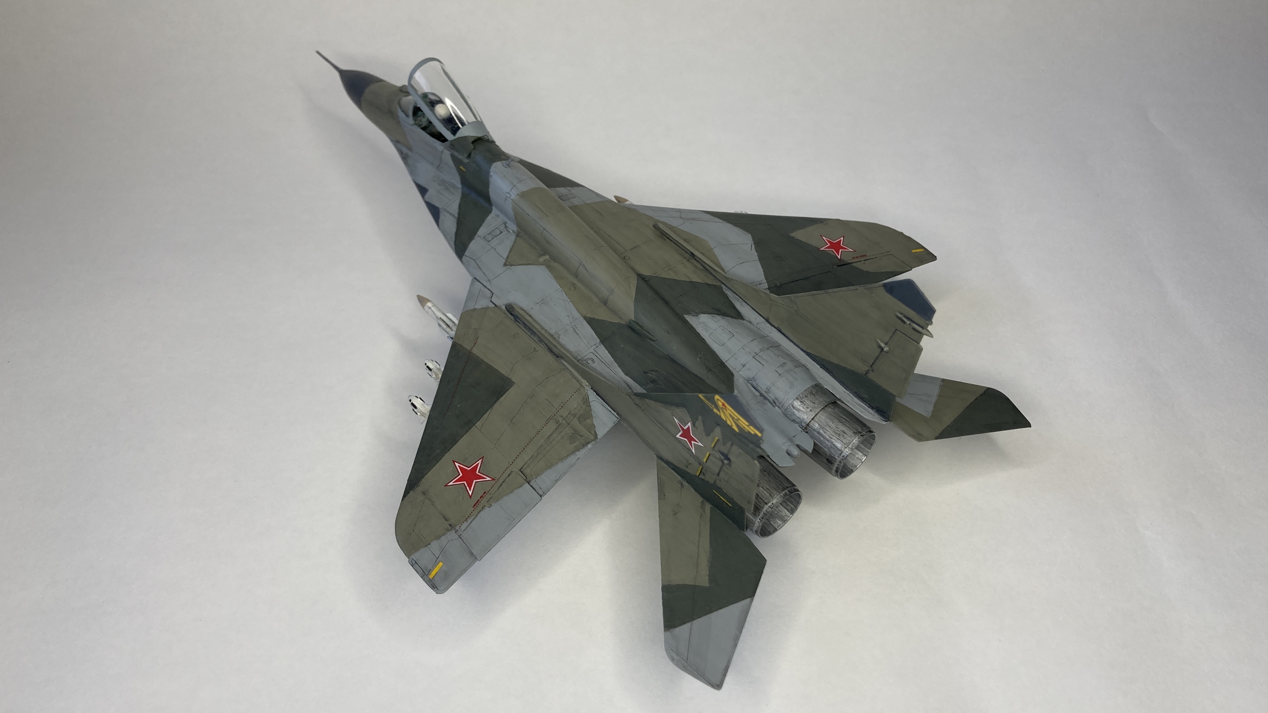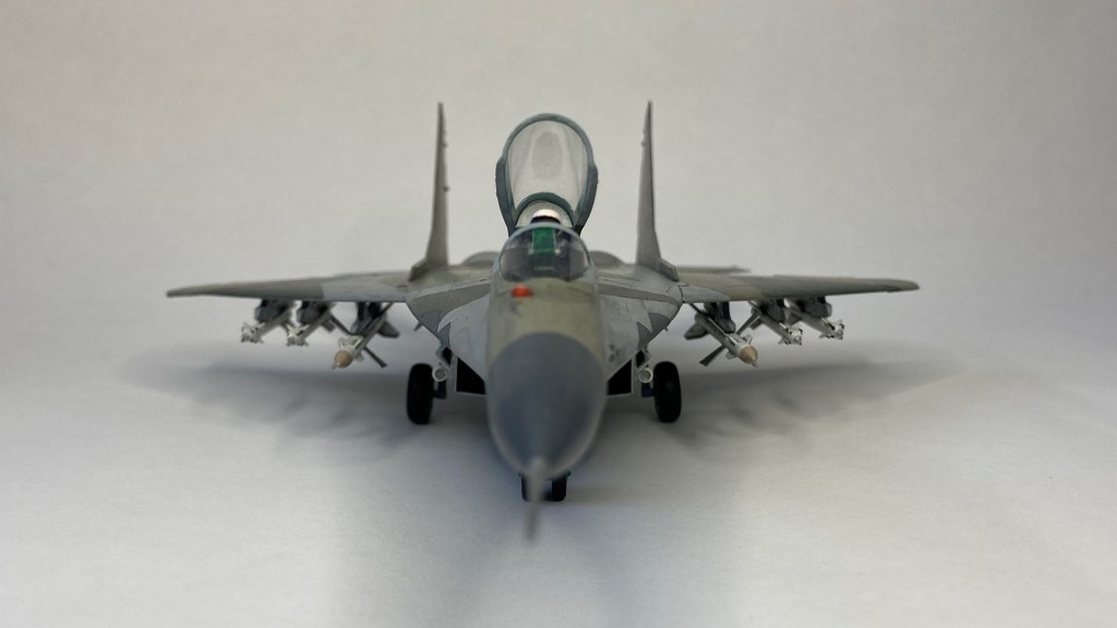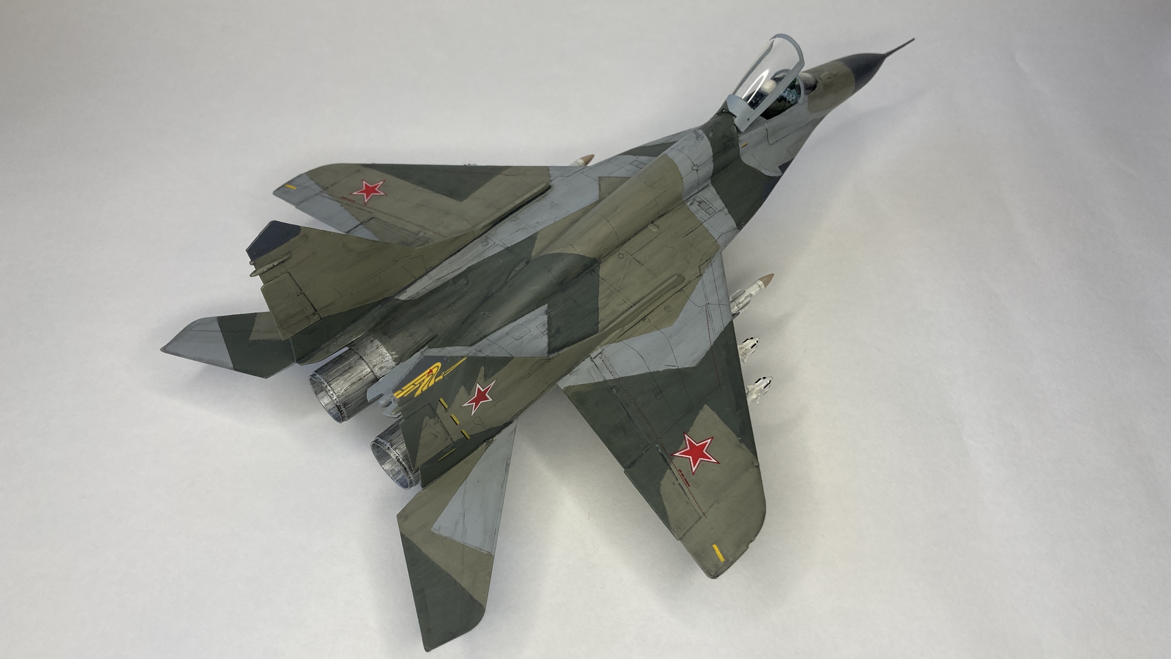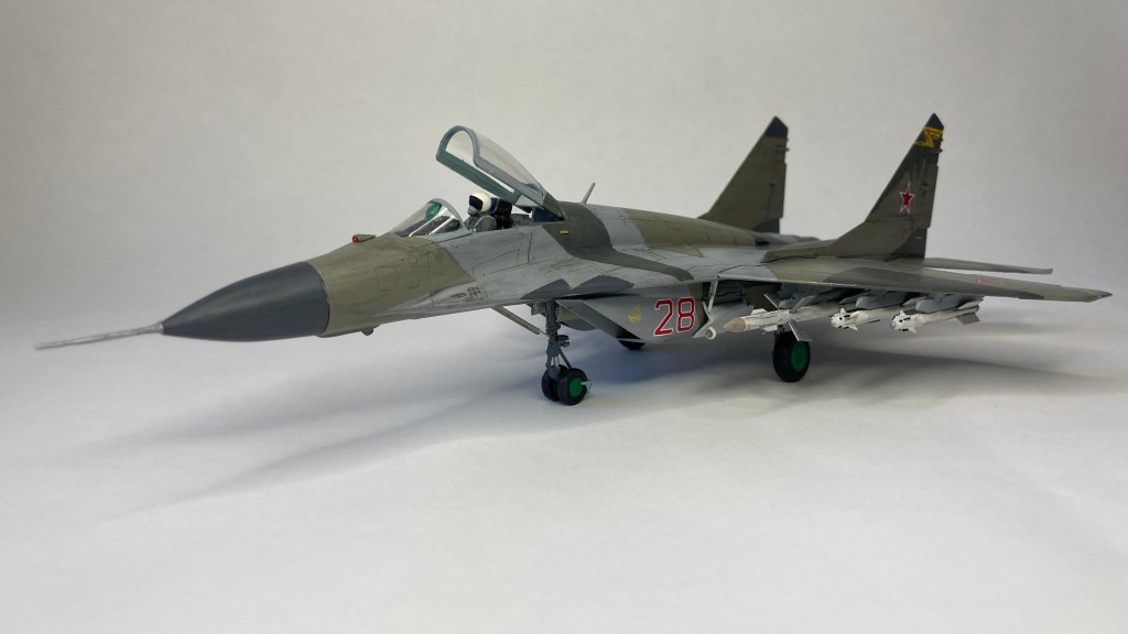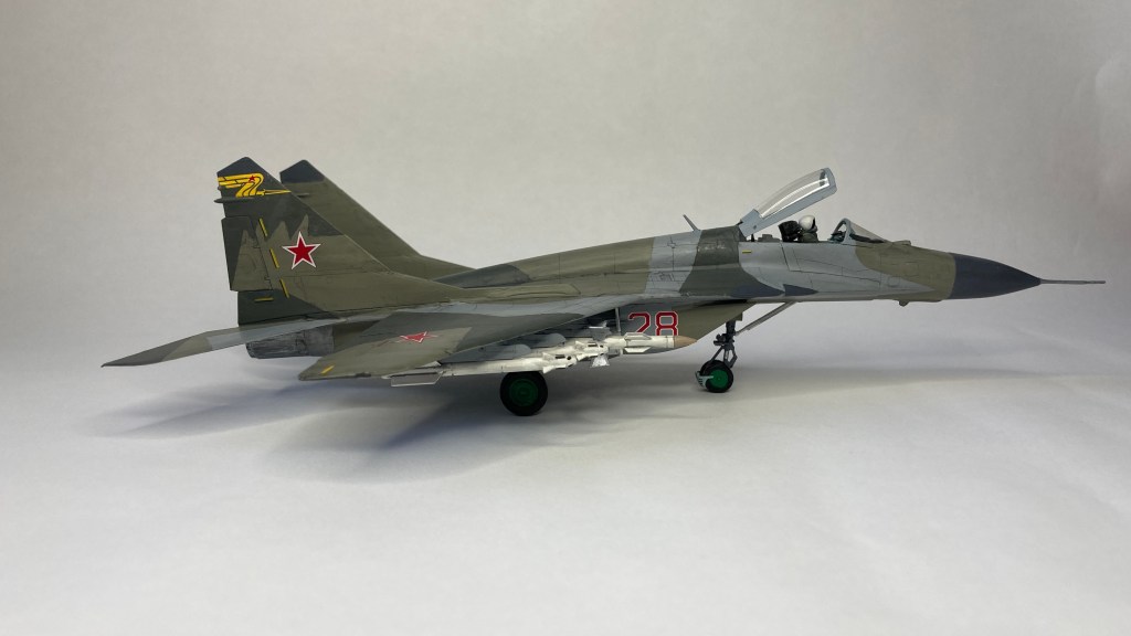 Mühimmat olarak uçağın hava üstünlük rolüne uygun şekilde iki adet Vympel R-27 (AA-10 “Alamo”) orta menzilli hava-hava füzesi ve dört adet R-73 (AA-11 “Archer”) it dalaşı hava-hava füzesi kullandım. Gövde altında da bir adet harici yakıt tankı ekledim. Eskitme için Tamiya koyu gri panel liner ve sulu boya kalemleri kullandım. Yapımda farklı Aqua Color renkleri dışında, jantlar için yeşil emay boya, Vallejo akrilikleri, metalik, yeşil, siyah ve kırmızı permanent kalemlerden yararlandım. Modelin tüm boya ve vernik işlemleri fırça ile yapıldı.
