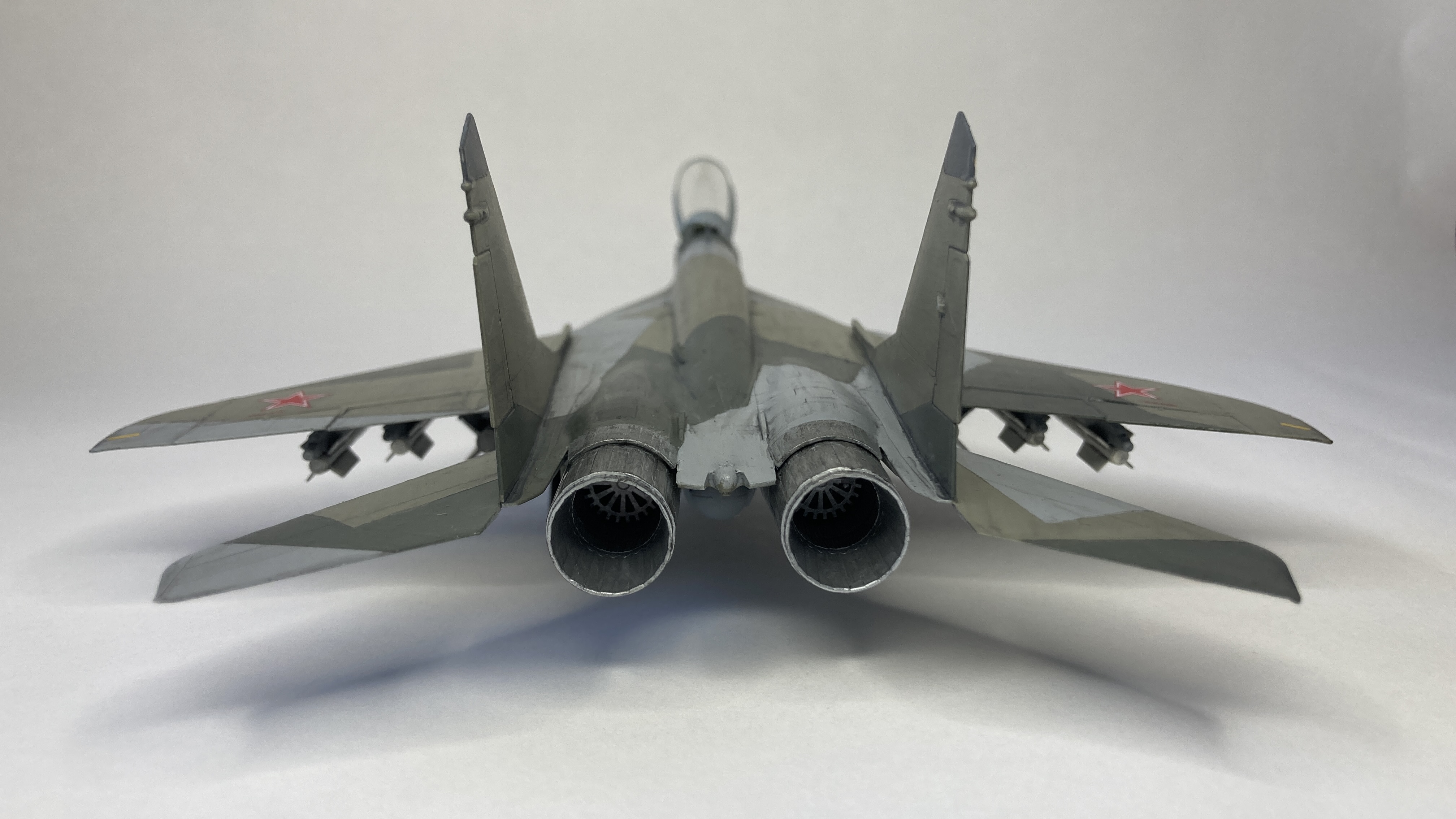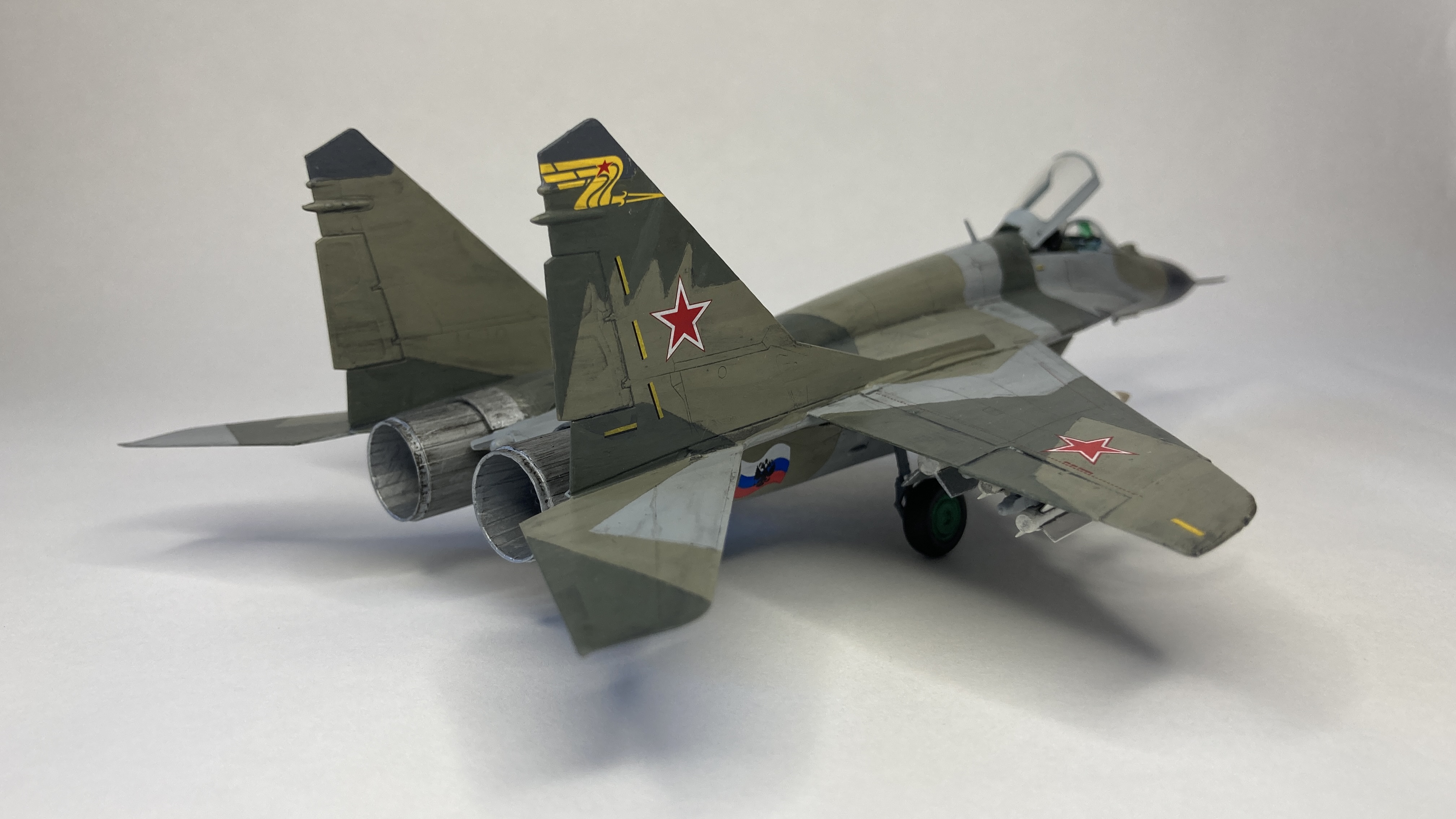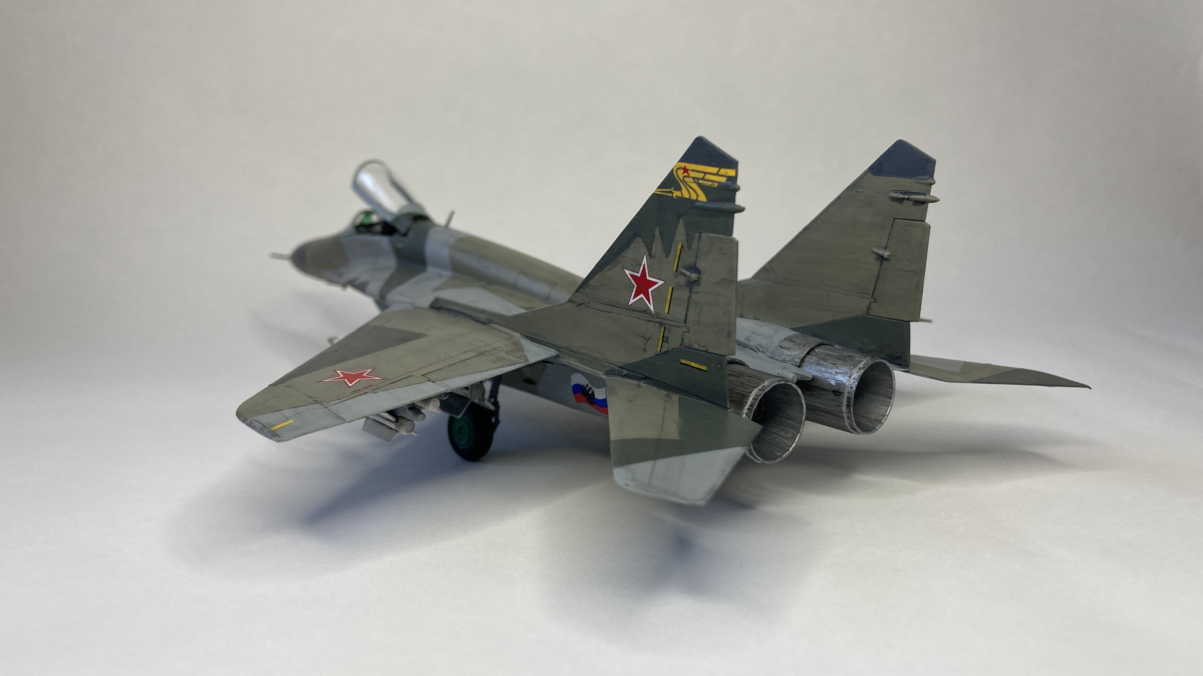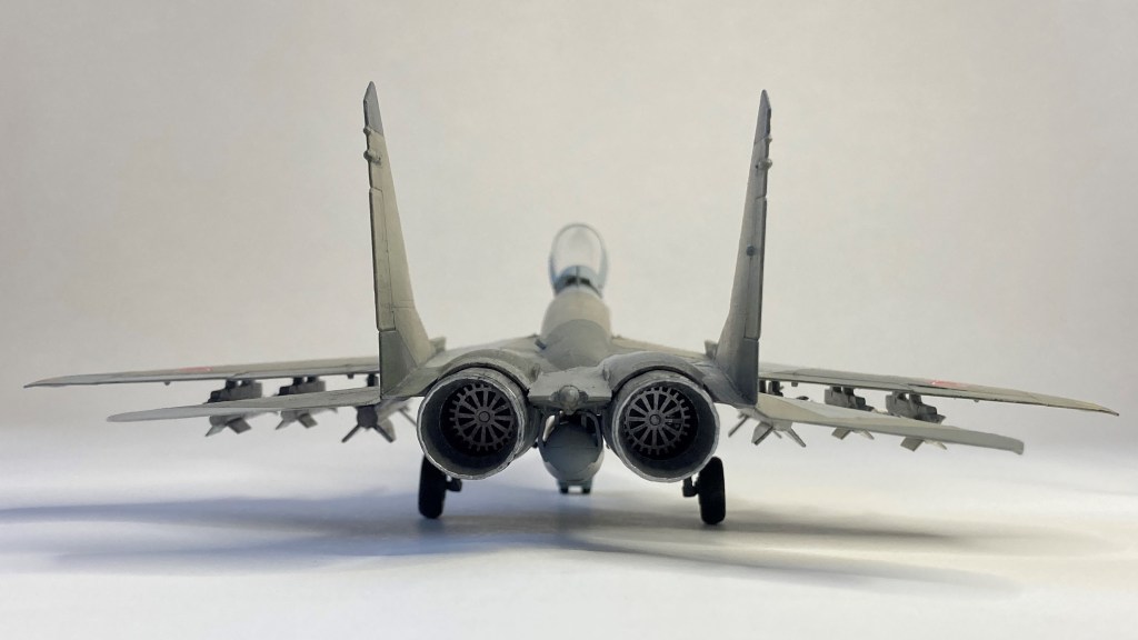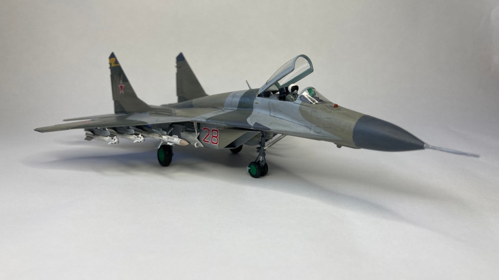 Mühimmat olarak uçağın hava üstünlük rolüne uygun şekilde iki adet Vympel R-27 (AA-10 “Alamo”) orta menzilli hava-hava füzesi ve dört adet R-73 (AA-11 “Archer”) it dalaşı hava-hava füzesi kullandım. Gövde altında da bir adet harici yakıt tankı ekledim. Eskitme için Tamiya koyu gri panel liner ve sulu boya kalemleri kullandım. Yapımda farklı Aqua Color renkleri dışında, jantlar için yeşil emay boya, Vallejo akrilikleri, metalik, yeşil, siyah ve kırmızı permanent kalemlerden yararlandım. Modelin tüm boya ve vernik işlemleri fırça ile yapıldı.