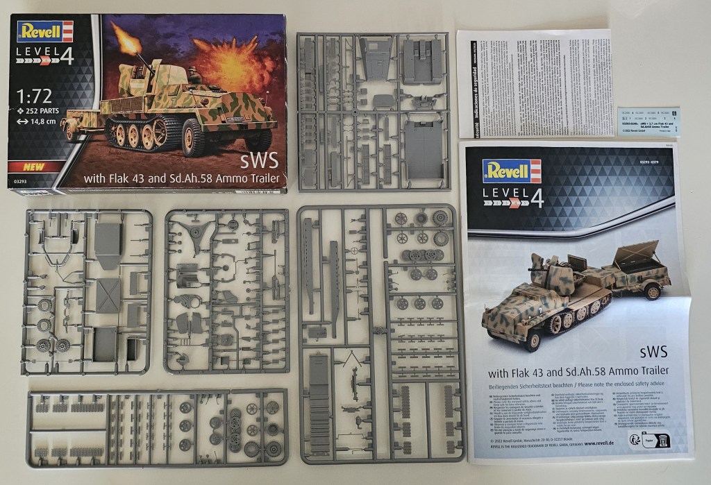 Maco’nun 2008’de yeni kalıpla çıkardığı kitin 2022’de Revell tarafından ek parçalarla piyasaya sürülmüş bir örneğidir. Daha önceki kutularda personel taşıyıcı, Flak 43, Panzerwerfer 42 ve Flak 38 versiyonları yapmaya olanak verilirken, Revell tarafından 2018’de Panzerwerfer 42 versiyonu ve elimdeki son kutuda Flak 43 versiyonu ve Sd.Ah.58 cephane römorku sunulmaktadır. Aslında Revell 3 kiti bir kutuda birleştirmiş gibi düşünebiliriz. 252 parçadan oluşan ve detayları güzel seviyedeki kit ile farklı cephelere ait 3 araçtan birinin yapımı için kamuflaj ve decal seçenekleri sunulmuştur. Genel olarak birleşim problemi olmayan kitte en zorlayan kısım, paletlerin tek tek verilmiş baklaları oldu.