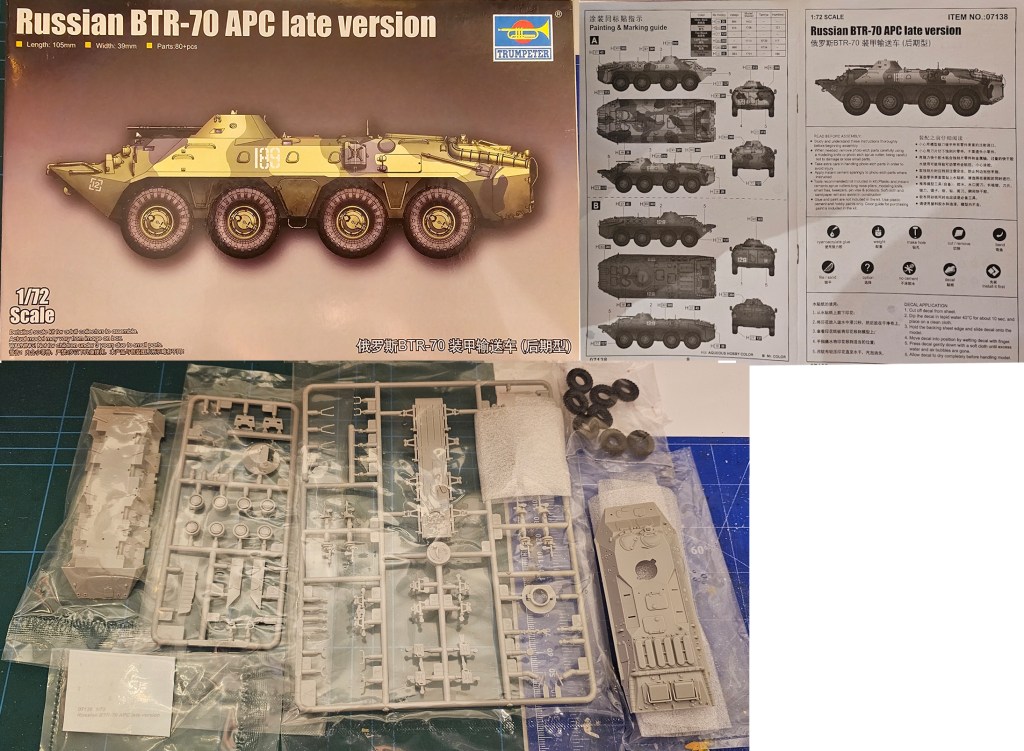 Trumpeter’in 2017’de ürettiği kalıptan piyasaya sürdüğü iki setten birisidir (erken ve geç dönem). Hassas parçaların köpükle ayrıca paketlendiği kitten 74 plastik parça ve 8 lastik çıkmakta. Gövdenin üst ve alt parçaları çok iyi detaylara sahip. Ne yazık ki, tüm kapaklar ve erişim panelleri sadece kapalı yapılabiliyor. 8 adet lastik güzel dişlere sahip olsa da gerçeğine göre biraz ince kalıyor. Taret yatayda hareketli ve dikeyde sabit konumda konumlandırılabiliyor. Beyaz 189 (üç renk) ve beyaz 129 (tek renk) renk şeması ve decalleri mevcut.