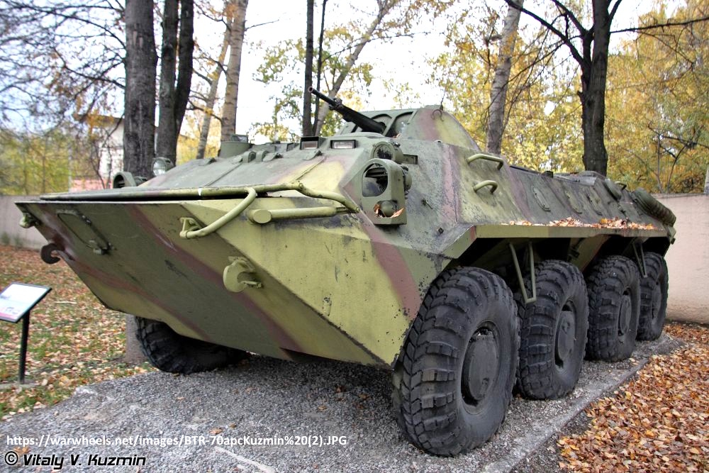 BTR-70, 1960’ların sonlarında Sovyetler Birliği tarafından geliştirilen sekiz tekerlekli zırhlı personel taşıyıcıdır. 1972’de SSCB’de hizmete girdi ve daha sonra yaygın olarak ihraç edildi. 11.5 ton ağırlığındaki araç 3 mürettebat ve 7 yolcu taşıyabiliyordu. 2 adet benzinli ZMZ-4905 120 hp motoru ile 240 bg güce sahip araç karada 80km/sa, suda (su jeti ile) ise 9 km/sa hıza ulaşabiliyordu. Araçta 500 mermi kapasiteli 14,5 mm KPVT ağır makineli tüfek ve 2.000 mermi kapasiteli eş eksenli 7,62 mm PKT makineli tüfek bulunmaktadır. Üretimi 1984’te sona eren aracın yerini 260 beygir gücünde tek dizel motor ve daha basit bir tahrik sistemi bulunan BTR-80 almıştır.