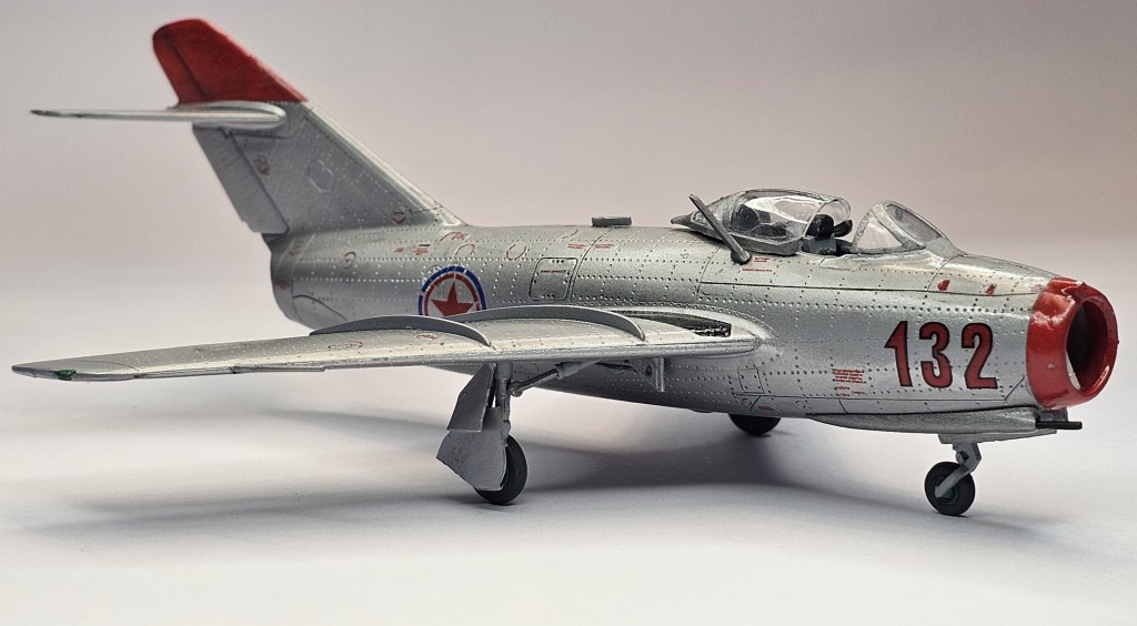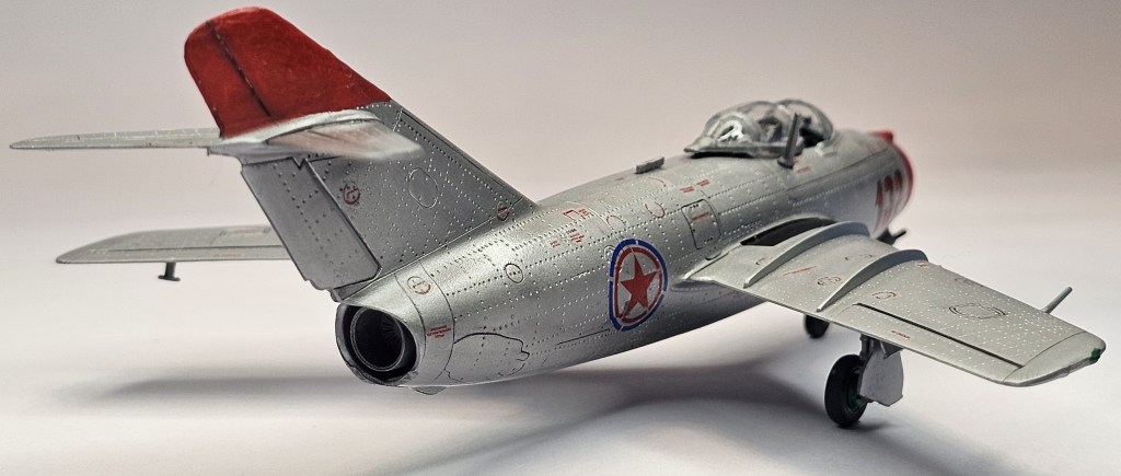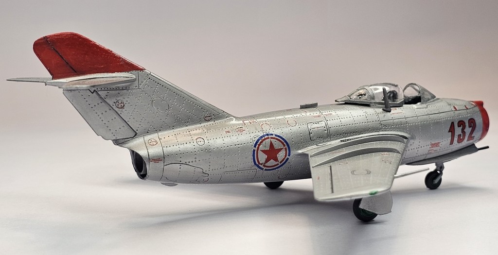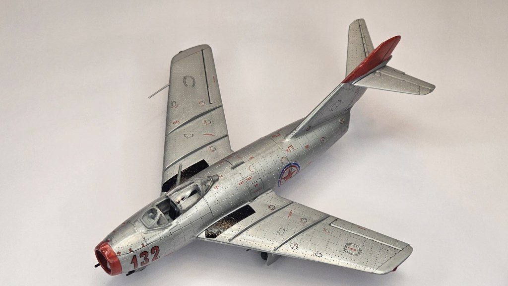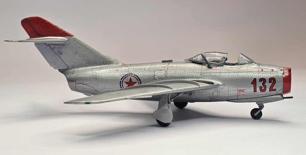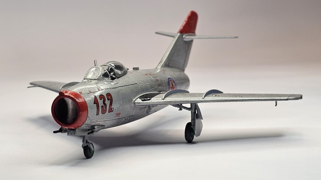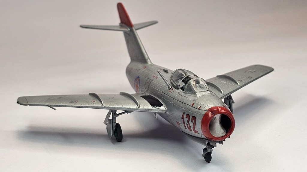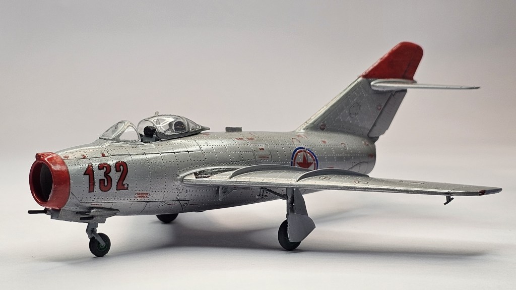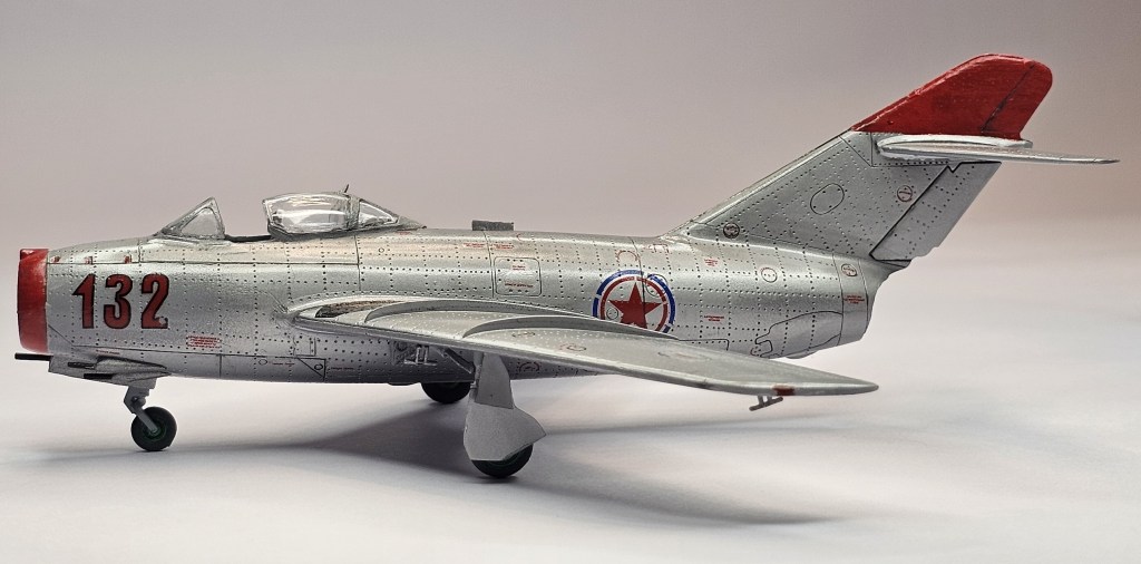 1993 Dragon kalıbına sahip kit 2019’da Zvezda tarafından üretilmiş. Sert gri plastikten kalıplanmış, içe detay güzel detaylara sahip. Gösterge panelleri ile sağ/sol kontrolleri temsil eden parçalar detaylı olsa da koltuk da hiç detay yok. İniş takımları açık/kapalı yapılabilse de kontrol yüzeyleri ve hava frenleri tek pozisyonda bitirilebiliyor. Kanopi açık/kapalı yapılabilmekte ancak plastiği biraz bulanık ve montajı emek istiyor. Decal kalitesi iyi düzeyde ve seçenek olarak 2 adet Sovyet (biri Kore), 1 adet Polonya ve 1 adet Çekoslovakya uçağı mevcut. Genel olarak uçağın montajı sorunsuz ve hızlı; ama yine de kanat birleşim yerlerinde bir miktar putty kullanımı gerekti. Kılavuzda belirtilmiyor ama uçağın burnuna bir miktar ağırlık eklemek gerekiyor. Uçağı Yzb. Nicholai Sutyagin’in Kore Savaşı’na kullandığı 132 numara olarak tamamladım. Gövde boyasında ilk defa sprey boya (Gunze No:8 Gümüş) kullandım. Yine Gunze’nin sprey parlak vernikleriyle tamamladığım uçağın diğer kısımlarında fırça ve akrilik boyalar kullandım. Tamiya koyu gri enamel ile panel aralarına kirletme uyguladım.