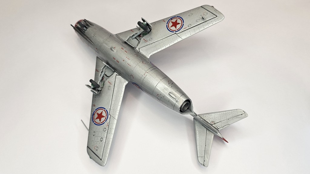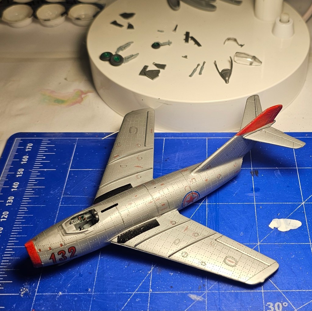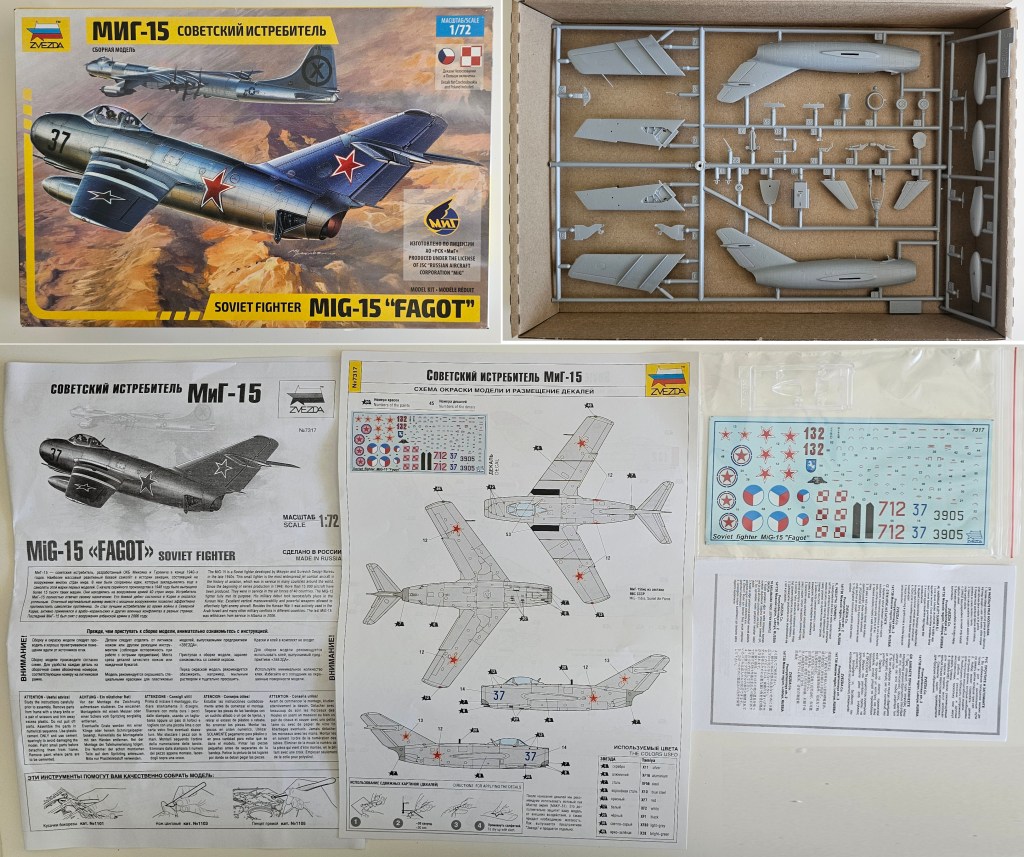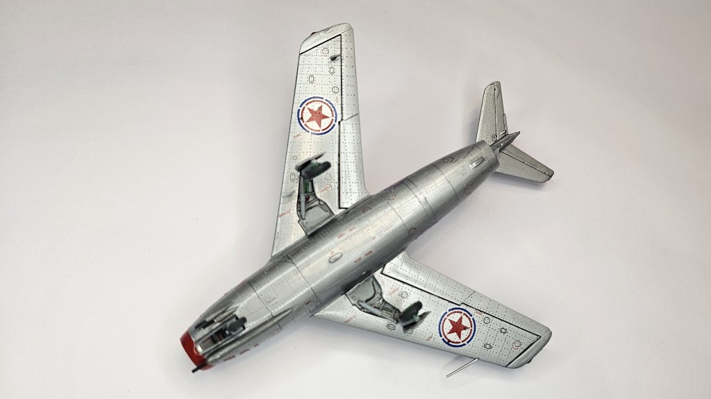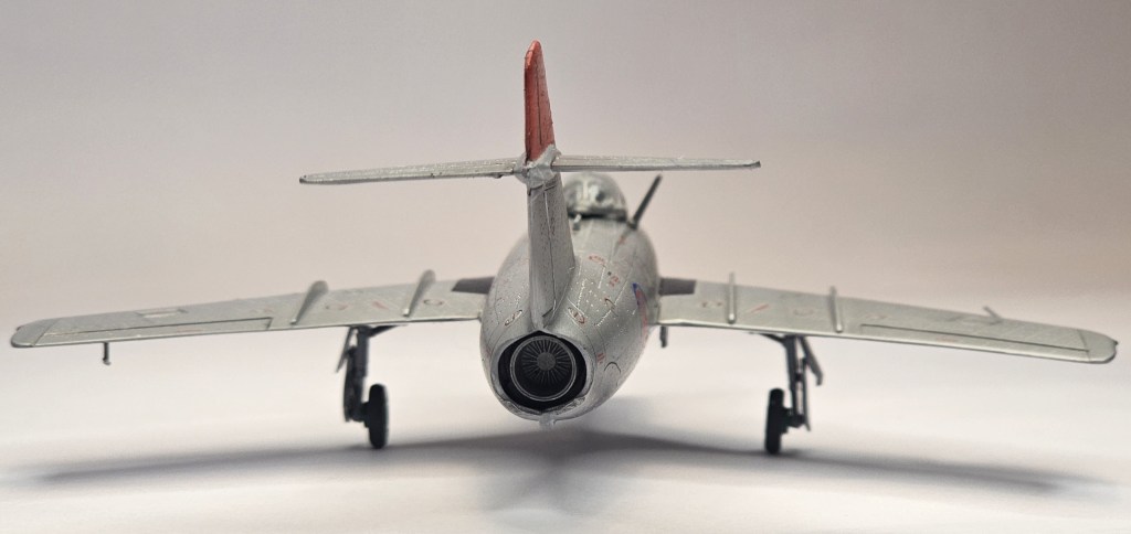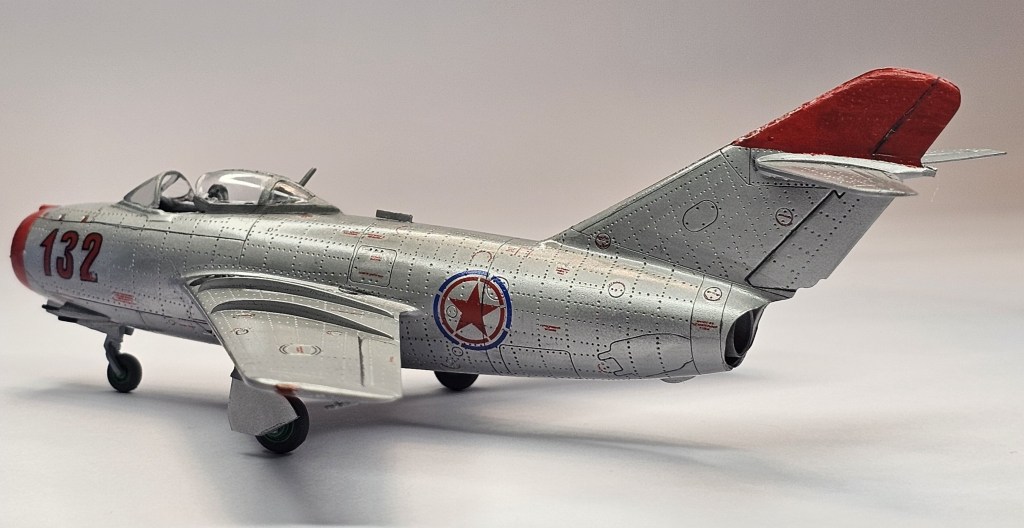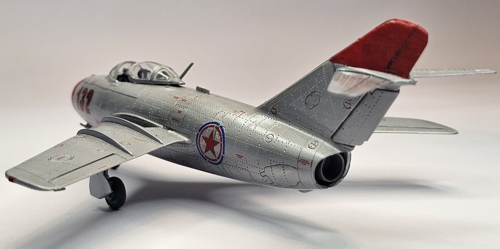 1993 Dragon kalıbına sahip kit 2019’da Zvezda tarafından üretilmiş. Sert gri plastikten kalıplanmış, içe detay güzel detaylara sahip. Gösterge panelleri ile sağ/sol kontrolleri temsil eden parçalar detaylı olsa da koltuk da hiç detay yok. İniş takımları açık/kapalı yapılabilse de kontrol yüzeyleri ve hava frenleri tek pozisyonda bitirilebiliyor. Kanopi açık/kapalı yapılabilmekte ancak plastiği biraz bulanık ve montajı emek istiyor. Decal kalitesi iyi düzeyde ve seçenek olarak 2 adet Sovyet (biri Kore), 1 adet Polonya ve 1 adet Çekoslovakya uçağı mevcut. Genel olarak uçağın montajı sorunsuz ve hızlı; ama yine de kanat birleşim yerlerinde bir miktar putty kullanımı gerekti. Kılavuzda belirtilmiyor ama uçağın burnuna bir miktar ağırlık eklemek gerekiyor. Uçağı Yzb. Nicholai Sutyagin’in Kore Savaşı’na kullandığı 132 numara olarak tamamladım. Gövde boyasında ilk defa sprey boya (Gunze No:8 Gümüş) kullandım. Yine Gunze’nin sprey parlak vernikleriyle tamamladığım uçağın diğer kısımlarında fırça ve akrilik boyalar kullandım. Tamiya koyu gri enamel ile panel aralarına kirletme uyguladım.